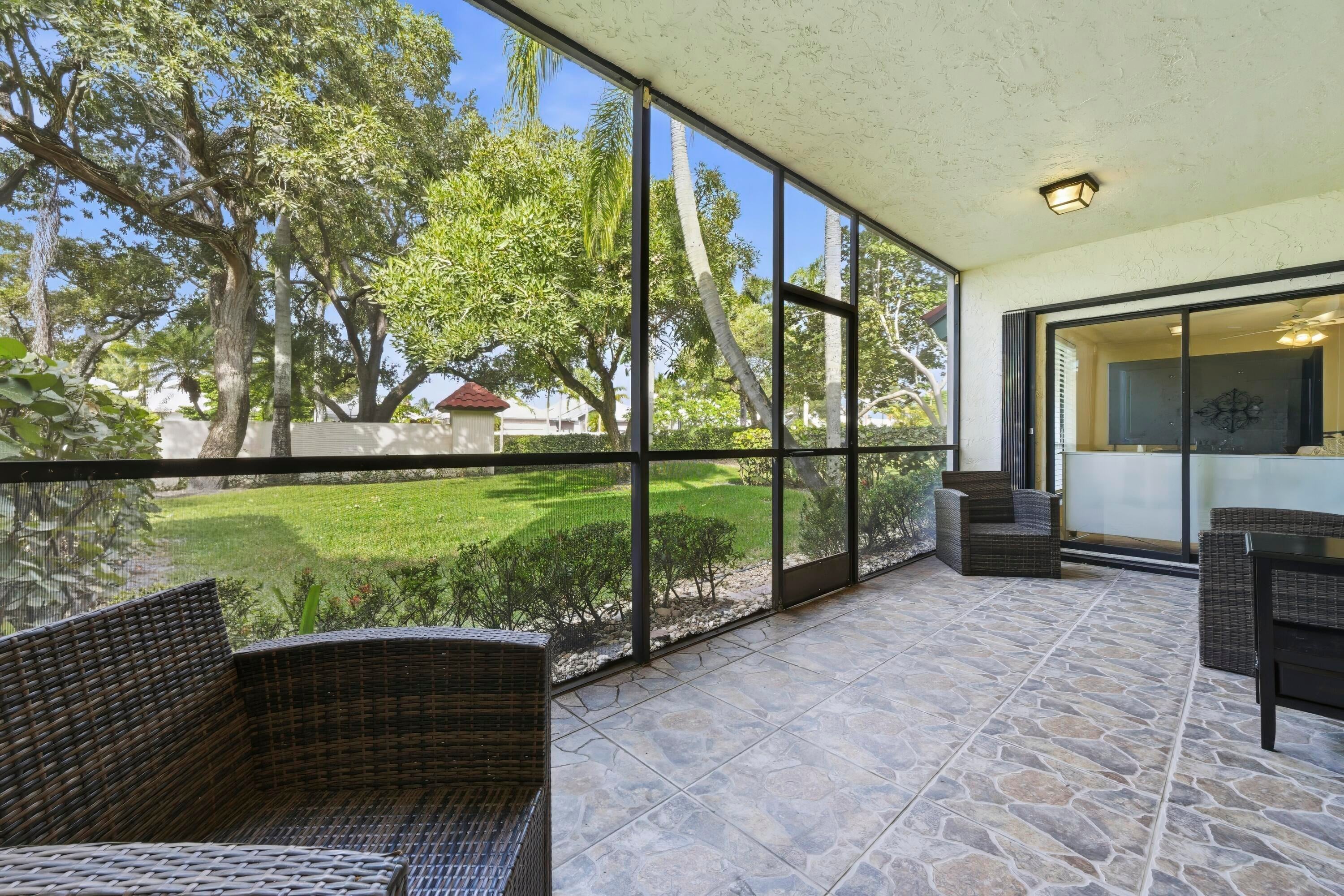 Welcome to a fully furnished and turn-key seasonal rental in the highly desirable Lexington Green community of PGA National. This bright and inviting 2-bed, 1-bath home features an open living area, comfortable furnishings, and a screened-in balcony overlooking peaceful green space--perfect for relaxing after a day in the Florida sun. The kitchen offers plenty of cabinet space and quality appliances, and both bedrooms are well-appointed for short-term stays. Additional conveniences include an attached one-car garage, in-unit washer/dryer, and ample guest parking. Nestled in the heart of Palm Beach Gardens, PGA National offers one of the best locations in the area--minutes to world-class restaurants, Alton Town Center, Midtown, Gardens Mall, top-rated golf courses, serene walking trails,and the area's best beaches. With quick access to I-95 and the Turnpike, this home combines comfort, convenience, and the ideal seasonal setting.