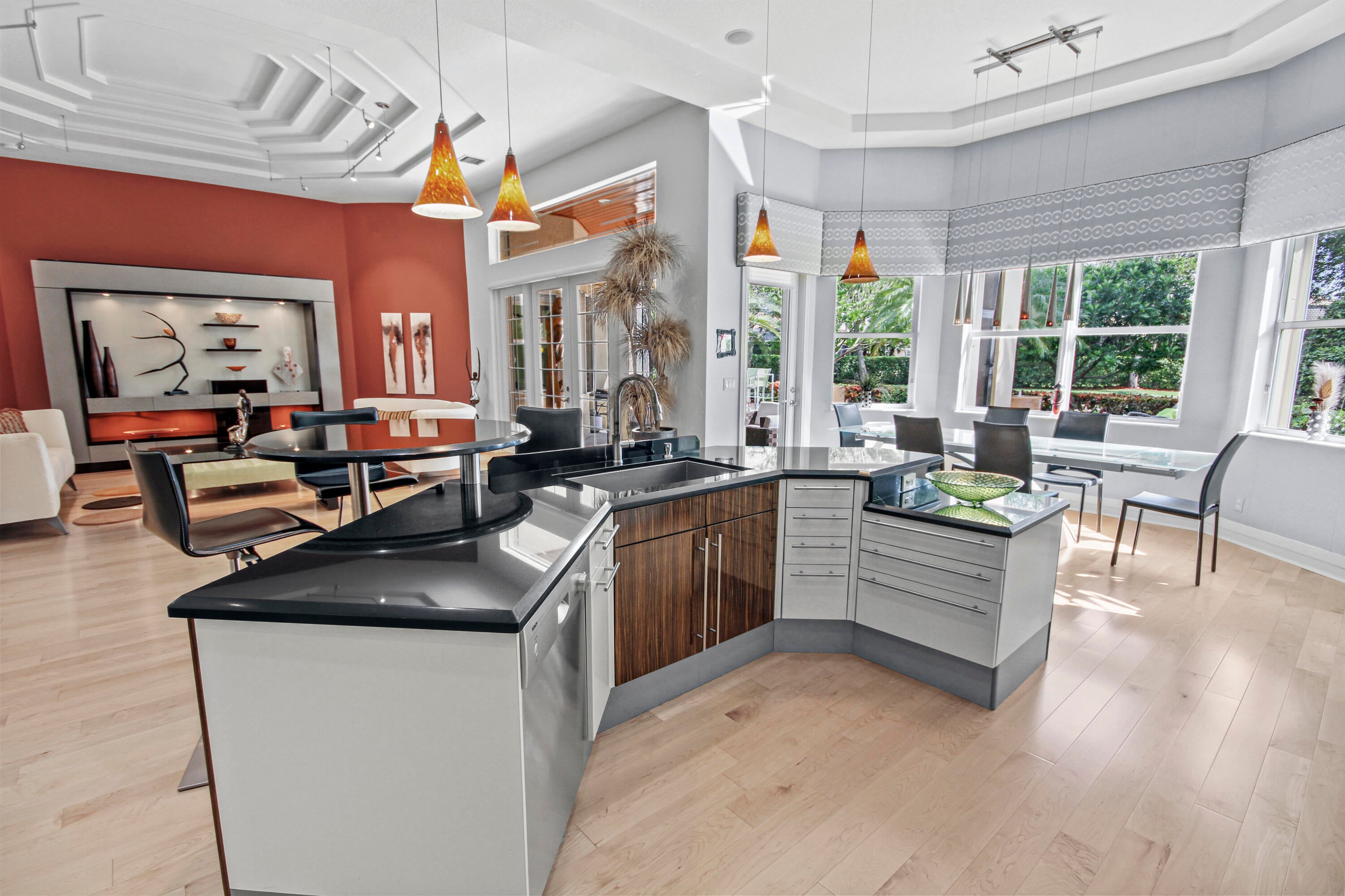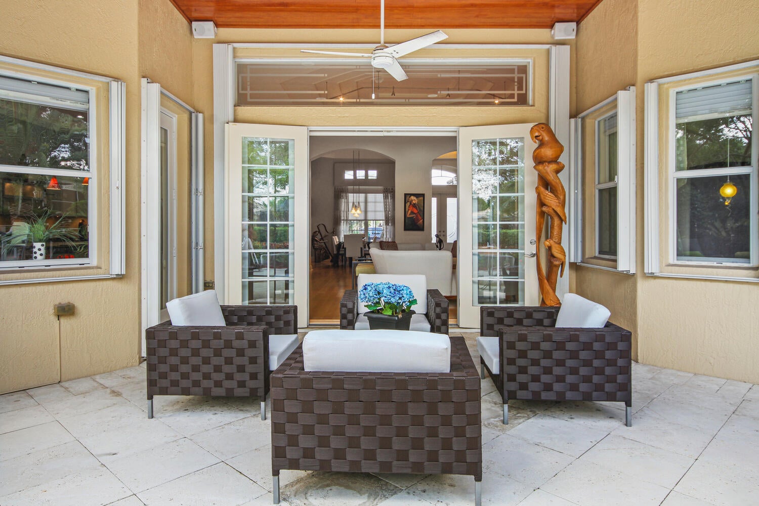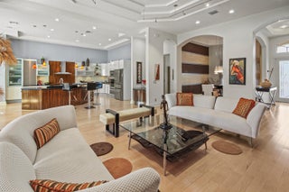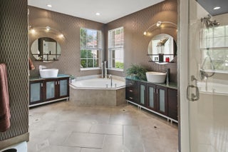 This Riviera model is a 3 bedroom, 2 1/2 bath home, which has been designed and decorated with the most elegant contemporary upgrades. It showcases like any current new community model home at a fraction of the cost. Upon visiting this home, you will see the expansive great room and kitchen open floor plan design, creating elegance and functionality. The new and rich looking hardwood flooring is located throughout most of the home. The primary suite and third bedroom features new plush carpeting. Beautiful wall decor, lighting and window treatments add to the elegance and feel of the home. The exterior patio area has been upgraded with wood ceilings, spacious stone flooring, phantom screening, contemporary fountains and upgraded landscaping with two beautiful canary palmtrees for a Zen like experience. The garage itself is like no other. The cabinets, flooring, refrigerator and luggage racks are all combined with matching design and originality. The two zone A/C units are approximately 5 years old. A new refrigerator was recently bought that enhances the beauty of a luxurious kitchen. Villaggio offers every amenity you would want in a 55+ community. Beautiful clubhouse with showroom, card rooms, billiards room, arts and crafts room and inside and outside cafe open for breakfast and lunch with waitress service. Here you will find the main resort style swimming pool and hot tub. A separate fitness center is where you can enjoy an indoor swimming pool and hot tub, a fully equipped gym, his and her saunas, indoor racquetball court and a full-service hair salon. Tennis, Pickleball and Bocce are located at the fitness center location. Clubs for men, women or both are too numerous to mention here. Most importantly are the people who live here making Villaggio the place you want to be. At a negotiated additional cost, all furniture, furnishings, art work and everything else that is displayed can be purchased as Turn Key if desired.