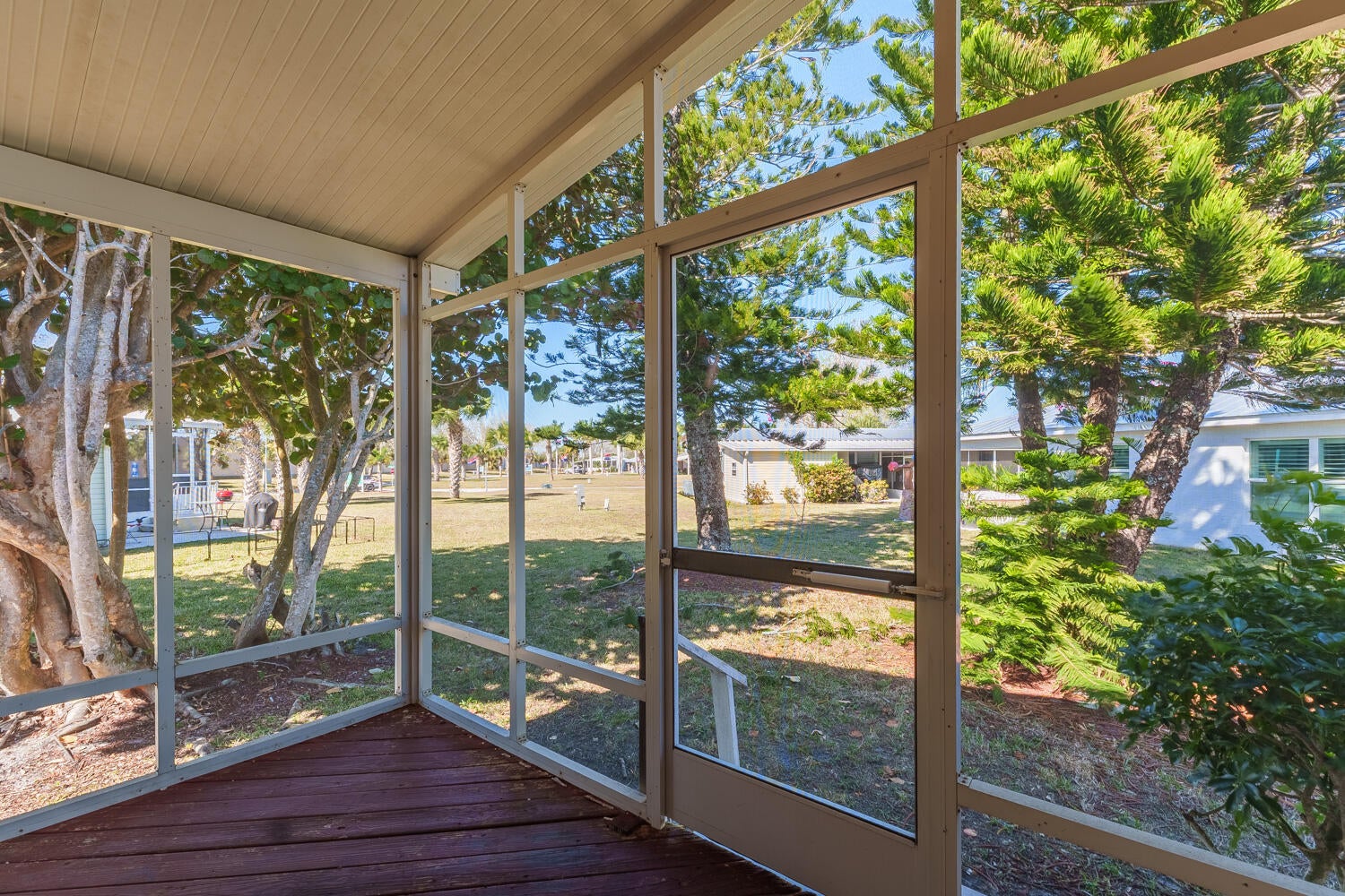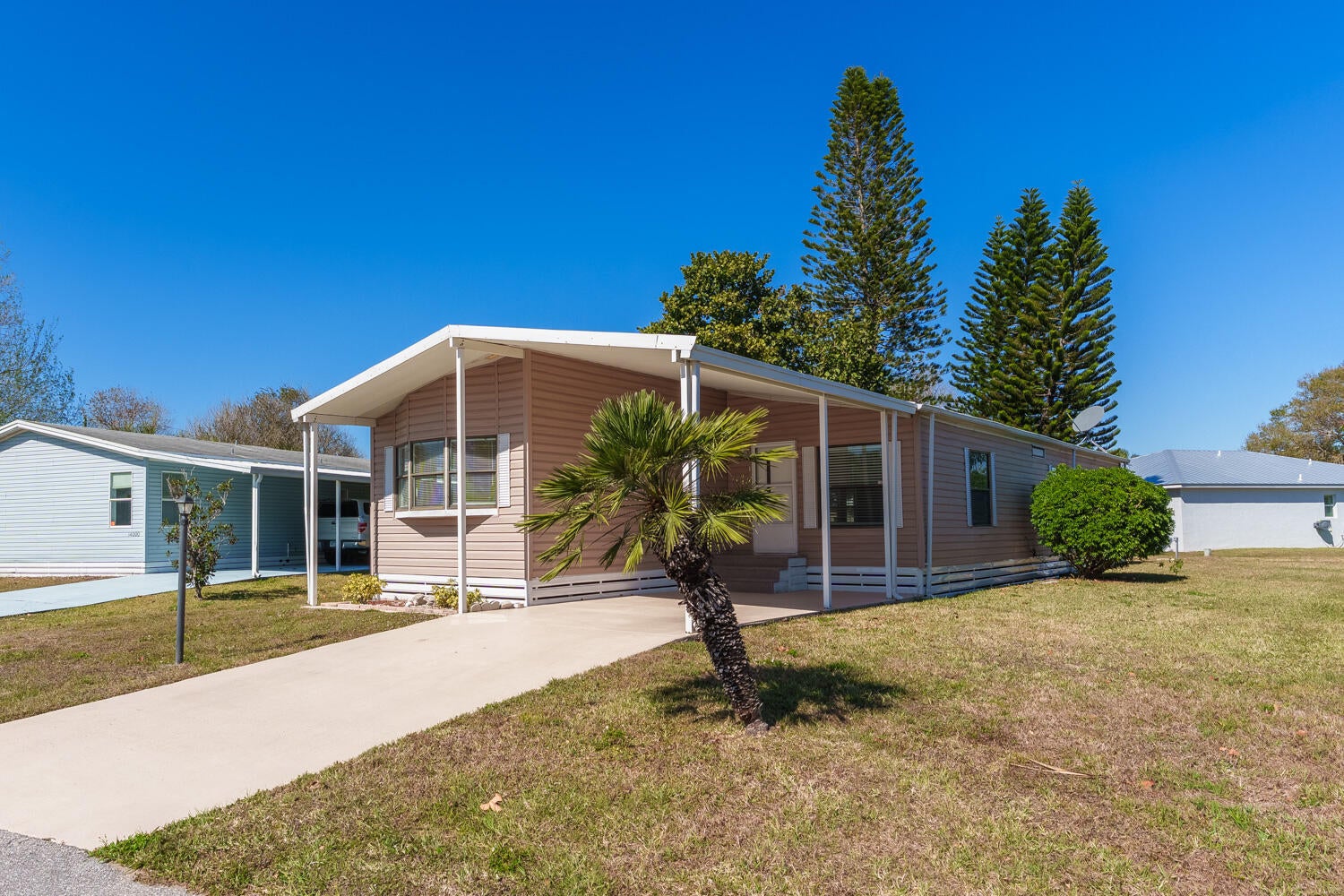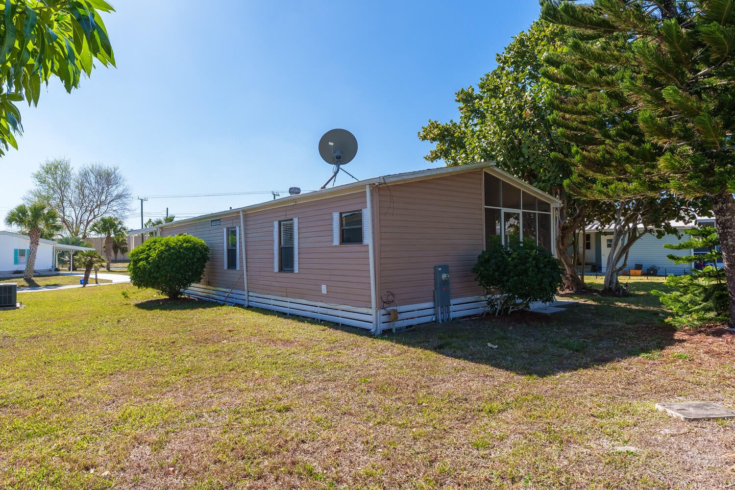 Charming Spanish Lakes Fairways home with a split floor plan 2 bedrooms and bonus room! This park-owned property offers low lot rent of just $699/month. Inside, enjoy modern laminate flooring throughout, a screened-in small patio, and a clean, move-in-ready space. Residents enjoy community amenities including free golf, clubhouse with pool and fitness center, tennis, pickleball, shuffleboard, bocce, and regular social events. Perfect opportunity for affordable, comfortable 55+ living! Close to clubhouse and rec department. Call today to see this one or another park owned home!