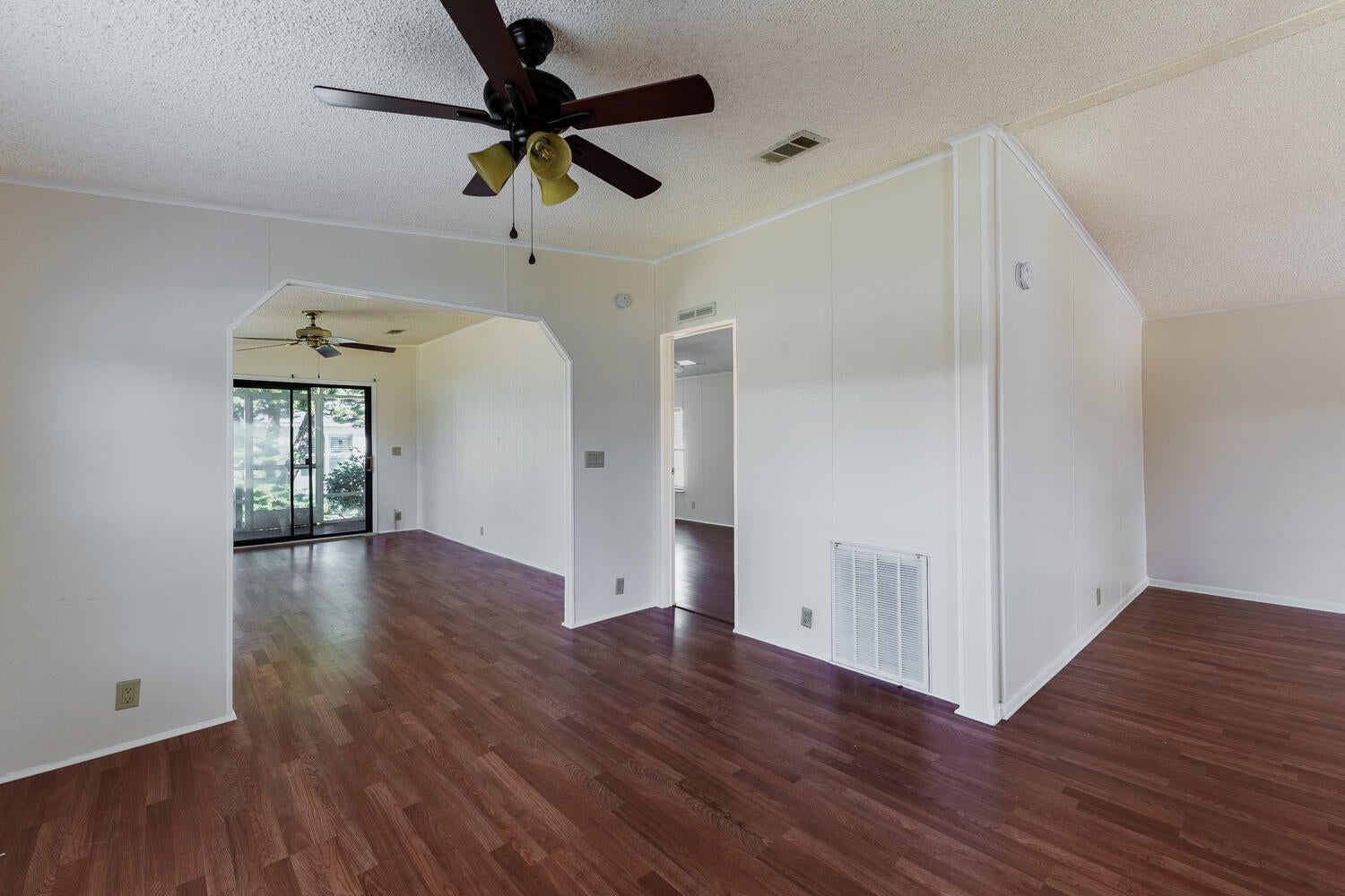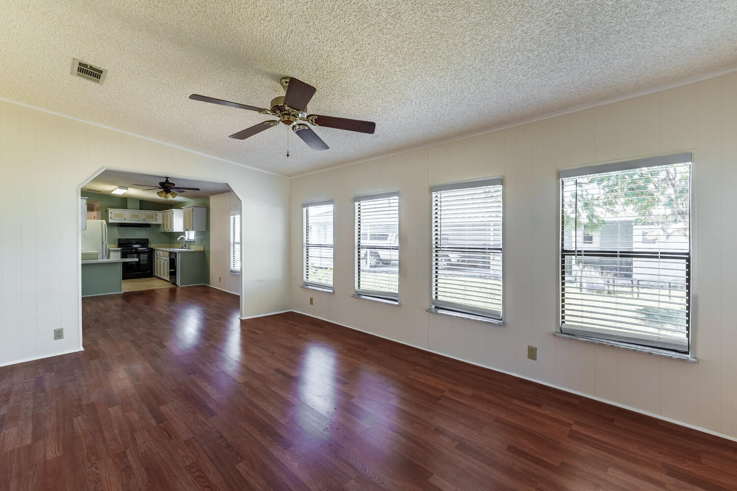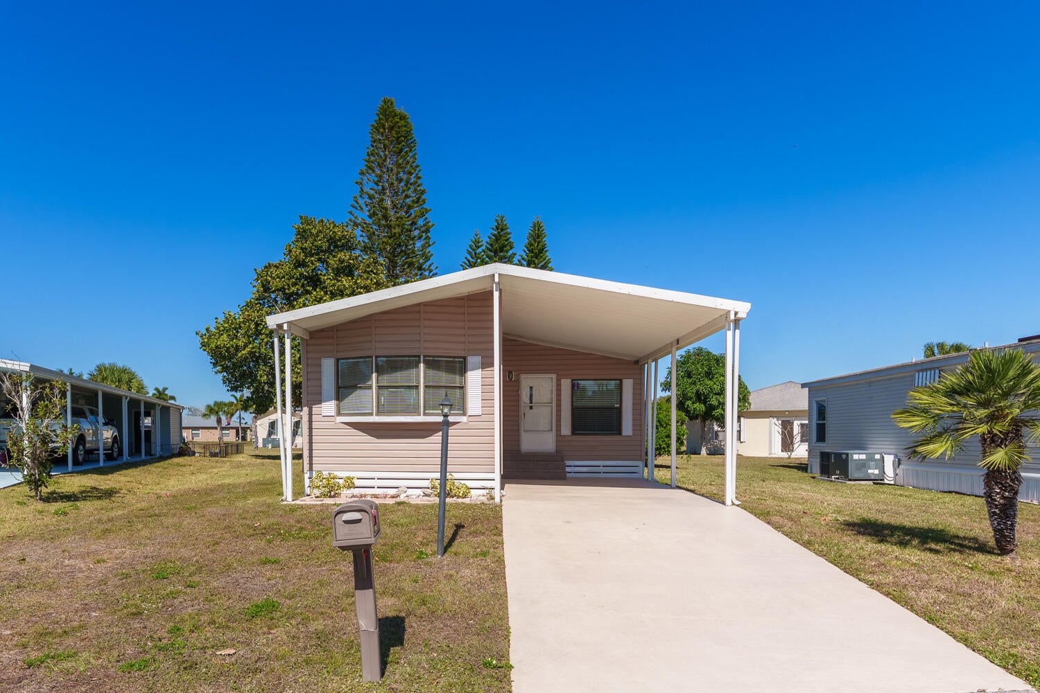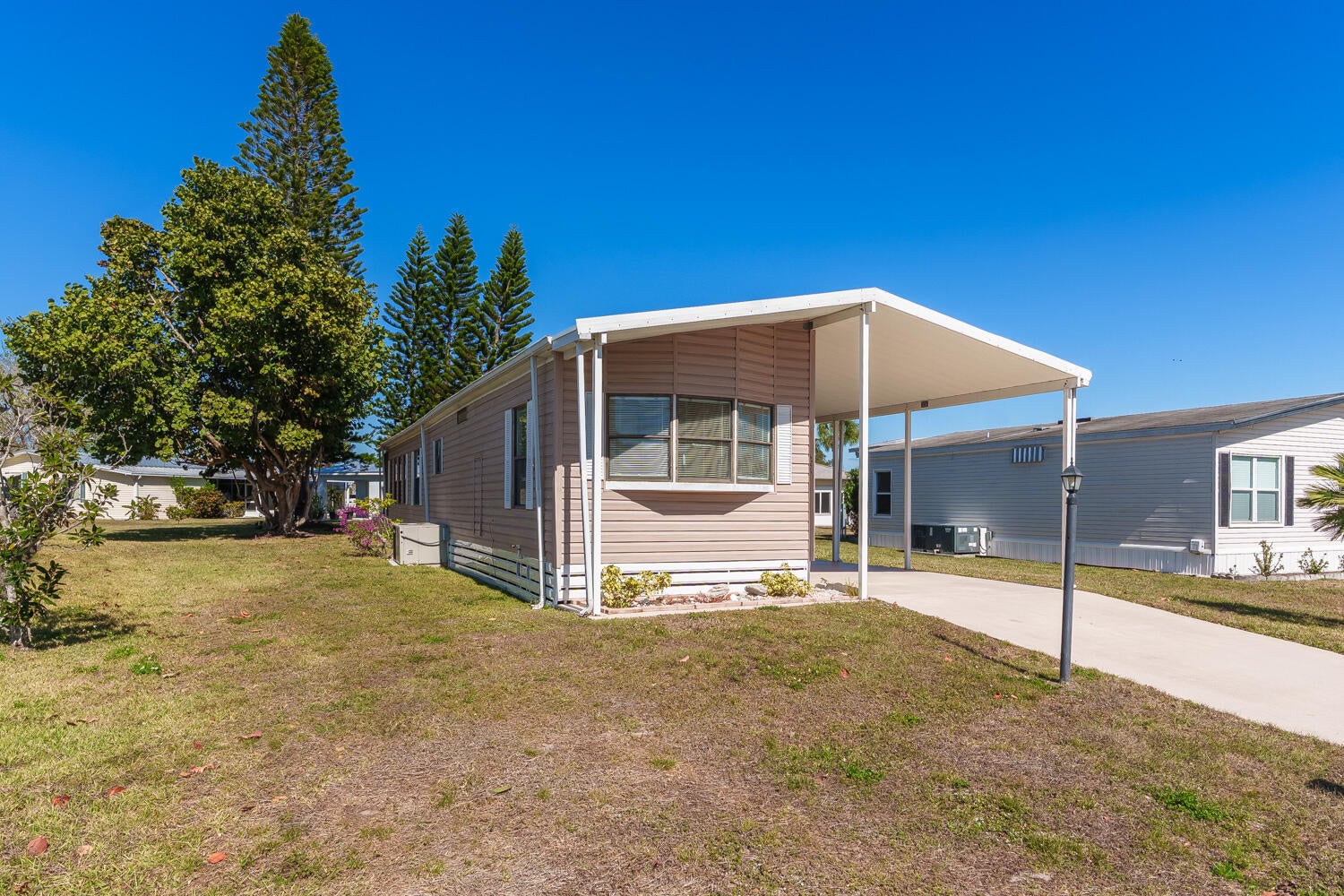 Charming Spanish Lakes Fairways home with a split floor plan 2 bedrooms and bonus room! This park-owned property offers low lot rent of just $699/month. Inside, enjoy modern laminate flooring throughout, a screened-in small patio, and a clean, move-in-ready space. Residents enjoy community amenities including free golf, clubhouse with pool and fitness center, tennis, pickleball, shuffleboard, bocce, and regular social events. Perfect opportunity for affordable, comfortable 55+ living! Close to clubhouse and rec department. Call today to see this one or another park owned home!