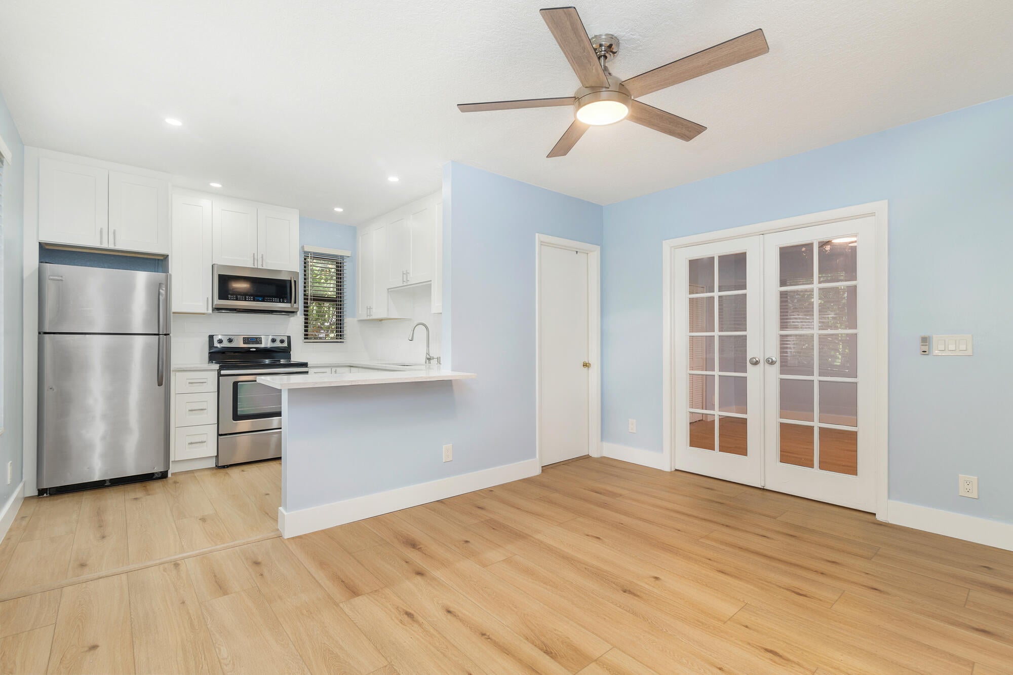Treetop Retreat in Mango Promenade: Welcome to your own elevated oasis among the palms! This unique 2-bedroom, 1 bathroom apartment is available for an annual, unfurnished lease and blends tropical charm with modern comfort in the heart of West Palm Beach.Step inside this second story apartment home to a bright and cozy living room with warm natural light and leafy views from every window. The renovated kitchen, complete with new white cabinetry, quartz countertops, and stainless appliances has plenty of counter space and everything you need to whip up meals at home.This home has one off street parking space. An additional parking space may be available for $100/month if needed. First, last + 1/2 month security deposit. Water included, but tenant to pay electric.French doors lead you into the serene master bedroom, creating a beautiful, airy transition into your private retreat. The second bedroom is perfect as a guest room, office, or creative space. New wood-look laminate floors give the apartment a classic, yet updated feel throughout. The spacious bathroom has just been recently updated with a fresh and clean look with roomy shower and new vanity. The true highlight is your own private deck tucked among swaying palm trees - a magical outdoor haven ideal for morning coffee, evening wine, or simply soaking in the coastal breeze. Less than a mile from downtown, a short walk to the Intracoastal Waterway and Palm Beach Atlantic University, this home is close to everything! Enjoy nearby restaurants like Table 26, The Hive Bakery, Grato, Bedner's Farm Fresh Market, Pig Beach BBQ, and the Civil Society Brewing Company. In your leisure time take a stroll to the sculpture gardens and the well known and well loved Norton Museum of Art. Peaceful, charming, and full of character, this one-of-a-kind home offers the feel of a tropical hideaway while keeping you close to all the best of West Palm Beach.