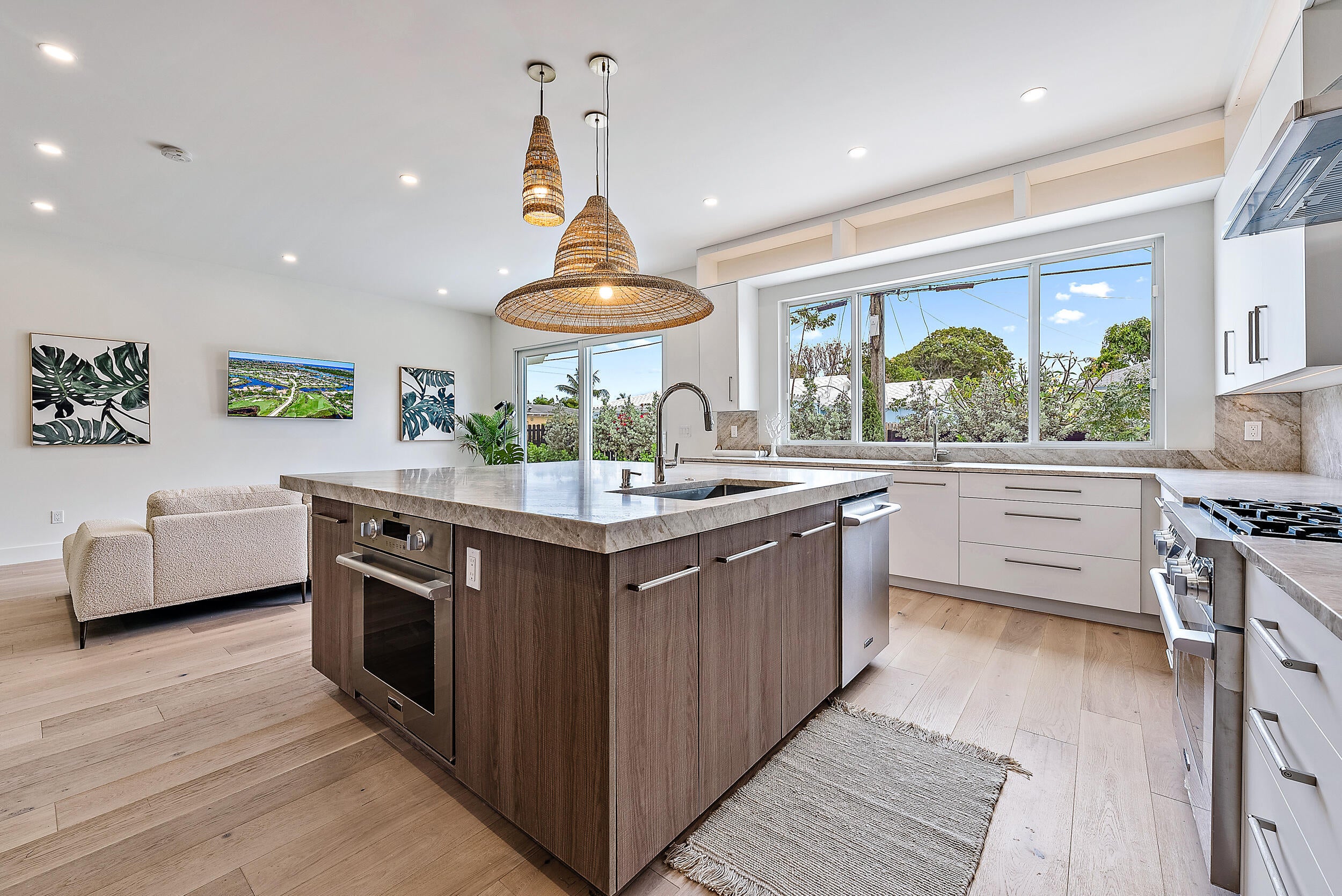 This beautifully reimagined and fully rebuilt home offers four bedrooms, three and a half baths, plus a versatile office that can serve as a fifth bedroom. Designed with abundant natural light, the residence centers around a chef's kitchen with a gas stove, refrigerator columns, an expansive island with honed quartzite countertops, and direct views of the new swimming pool and spa. The split master suite features a spacious walk-in closet, dual vanities, a large shower, and a soaking tub. Every detail showcases high-end finishes, and the property's prime SoSo location places you close to top restaurants, shopping, Palm Beach, the Kravis Center, and PBI Airport.