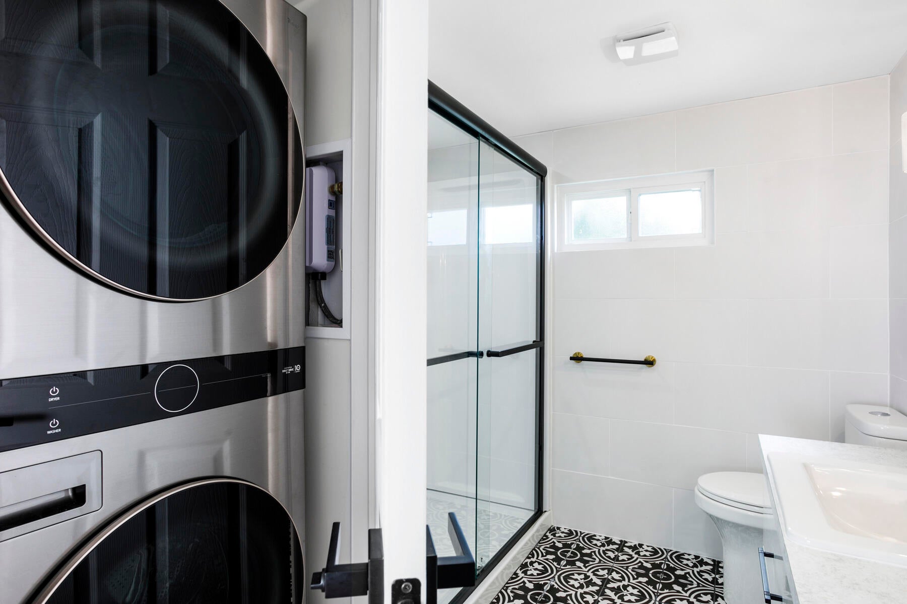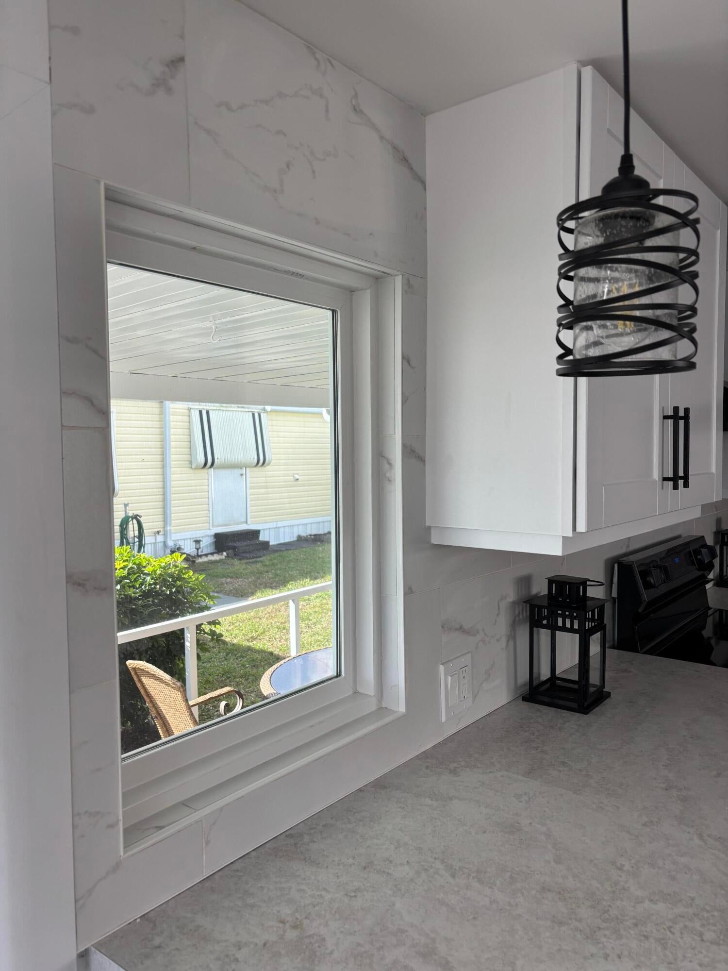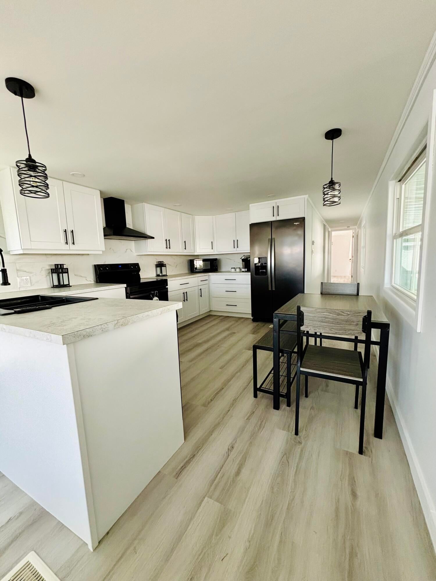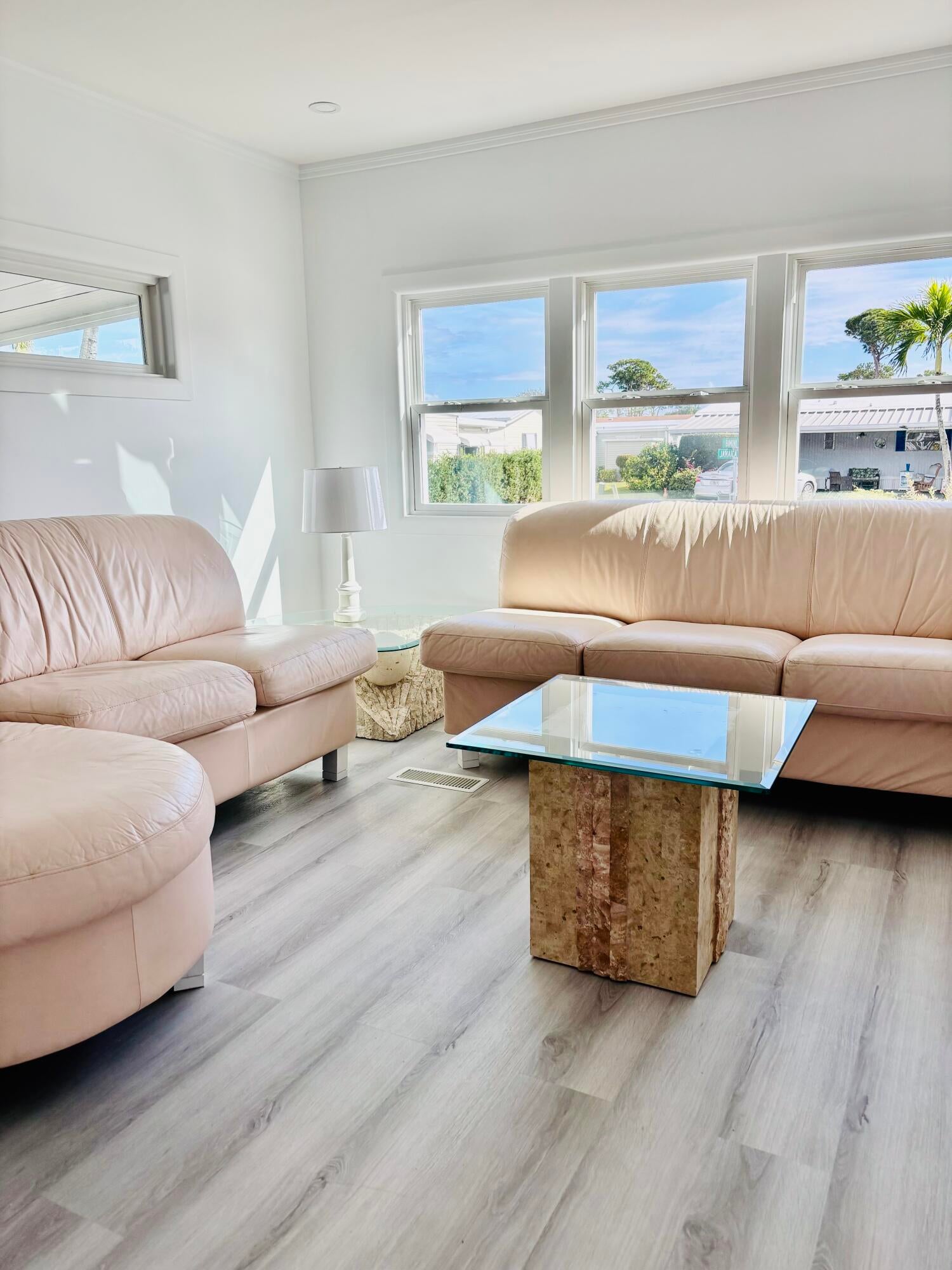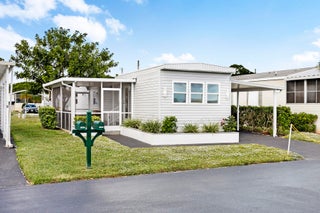 This beautifully remodeled home in a desirable gated community comes with NO land lease and has been upgraded from top to bottom. The kitchen showcases white shaker-style cabinets with sleek black handles, new appliances, abundant counter space, a breakfast bar, and a dining area. The open floor plan flows into a spacious living room that connects to a freshly screened patio, perfect for relaxing or entertaining. Inside, you'll find brand new vinyl flooring, updated drywall, 3/4-inch plywood subflooring, fresh insulation, new windows, a tankless water heater, and a washer and dryer conveniently located within the home. The interior has been freshly painted and exterior has new vinyl siding. Additional upgrades include LED lighting, new plumbing, new electrical panel, new interior andexterior doors, and a freshly sealed roof. Just steps away from the clubhouse, residents can enjoy two heated pools, pickleball, shuffleboard, billiards, a library, and a vibrant social calendar. With a low monthly fee of only $250 covering internet, water, sewer, 24/7 manned gate security, on-site management, and all amenities, this move-in-ready home is waiting for its new owners.