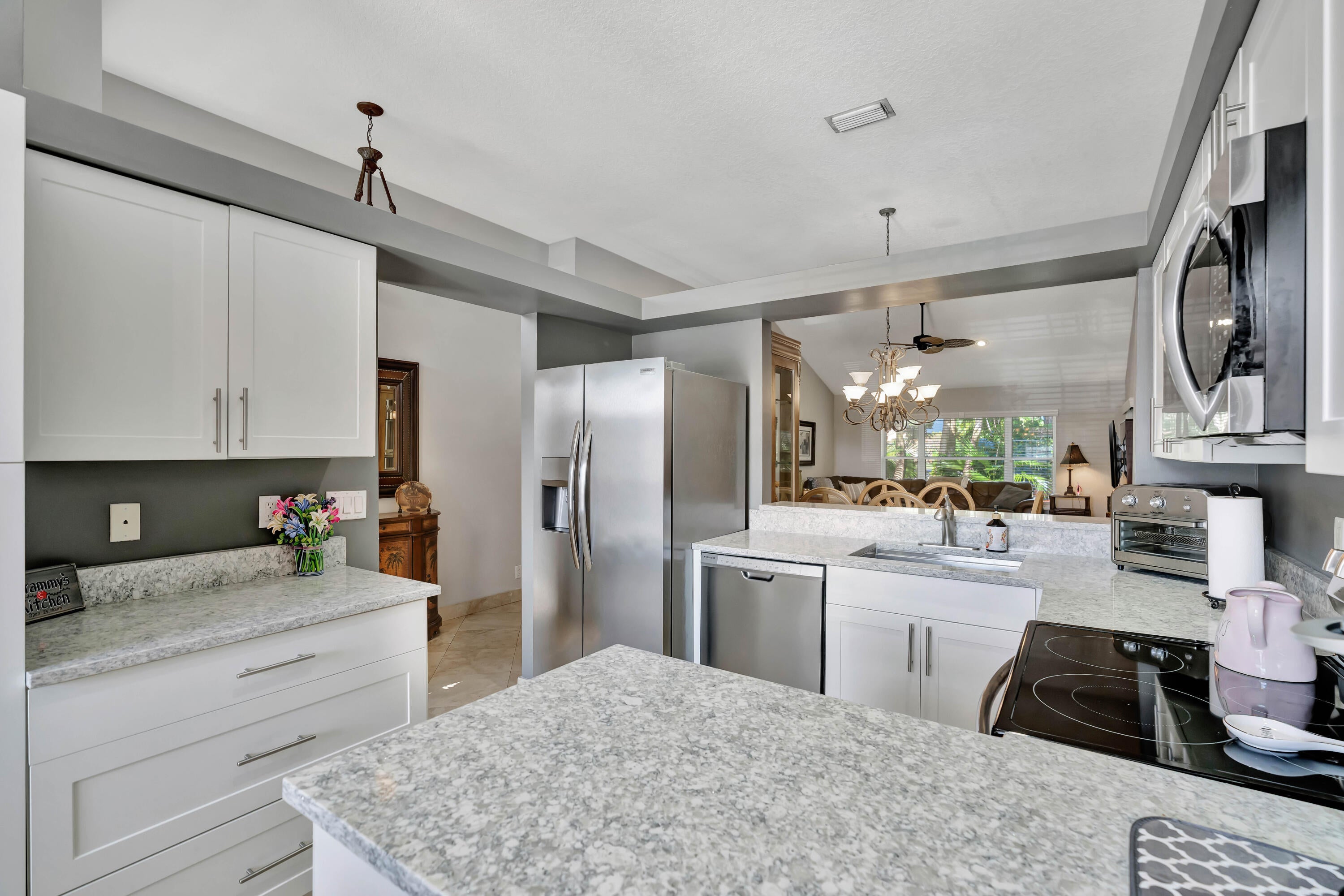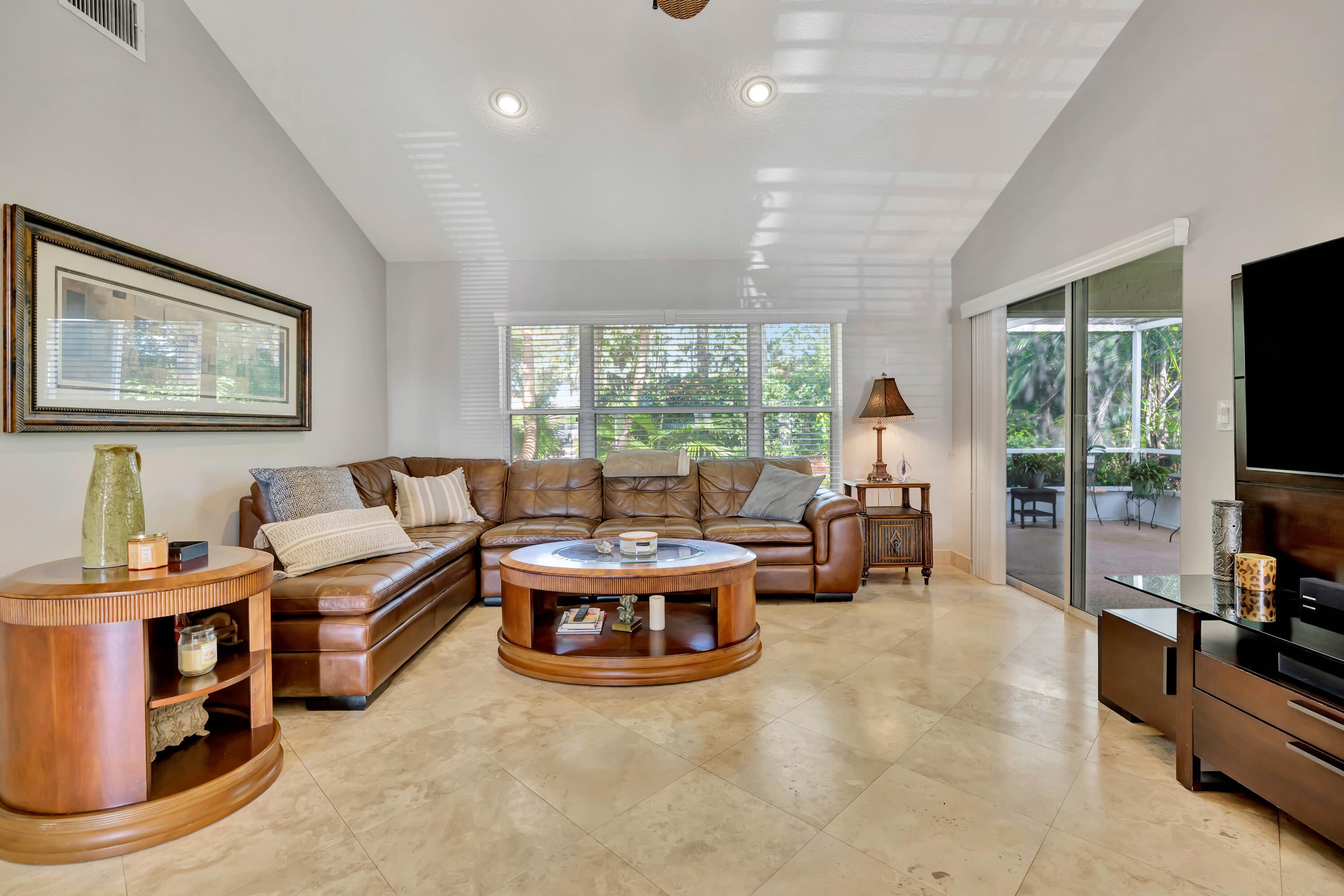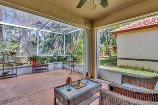 Welcome home to this beautiful single-family, single-story residence featuring a spacious screened-in lanai. Inside, the living room showcases marble flooring and vaulted ceilings, creating an elegant, open atmosphere. In addition to the main living areas, the home includes a versatile den that can easily be converted into an additional bedroom.The oversized primary suite offers a walk-in closet and an en suite bathroom with dual sinks, a separate shower, and a relaxing Roman tub. Both the kitchen and guest bathroom have been thoughtfully updated. The kitchen features quartz countertops, white shaker cabinets, and Frigidaire Gallery appliances. A brand-new roof (2025) and hurricane accordion shutters provide added peace of mind and may help meet insurance requirements.Situated within a highly desirable, guard-gated community, this home grants access to exceptional amenities, including two pools and tennis courtsall in a prime location.