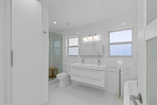 Experience luxury waterfront living in this breathtaking canal-front home featuring wide-water views, a sparkling pool & spa, private dock, and no fixed bridge ocean access. Split bedroom design, LED lighting, and elegant tile flooring. The chef's kitchen impresses with quartz countertops, 42'' white wood cabinetry, stainless steel appliances, and bar seating. Each bedroom includes its own en-suite for privacy and comfort. The primary suite offers custom built-in closets, a spa-style bathroom with dual vanities, frameless glass shower. Step outside to a stunning marble travertine patio with pergola, outdoor bar and kitchen, a reinforced seawall, impact windows and doors, and a desirable canal end lot. Ideally located on a quiet cul-de-sac just minutes to the beach Pompano Pier, boardwalk.