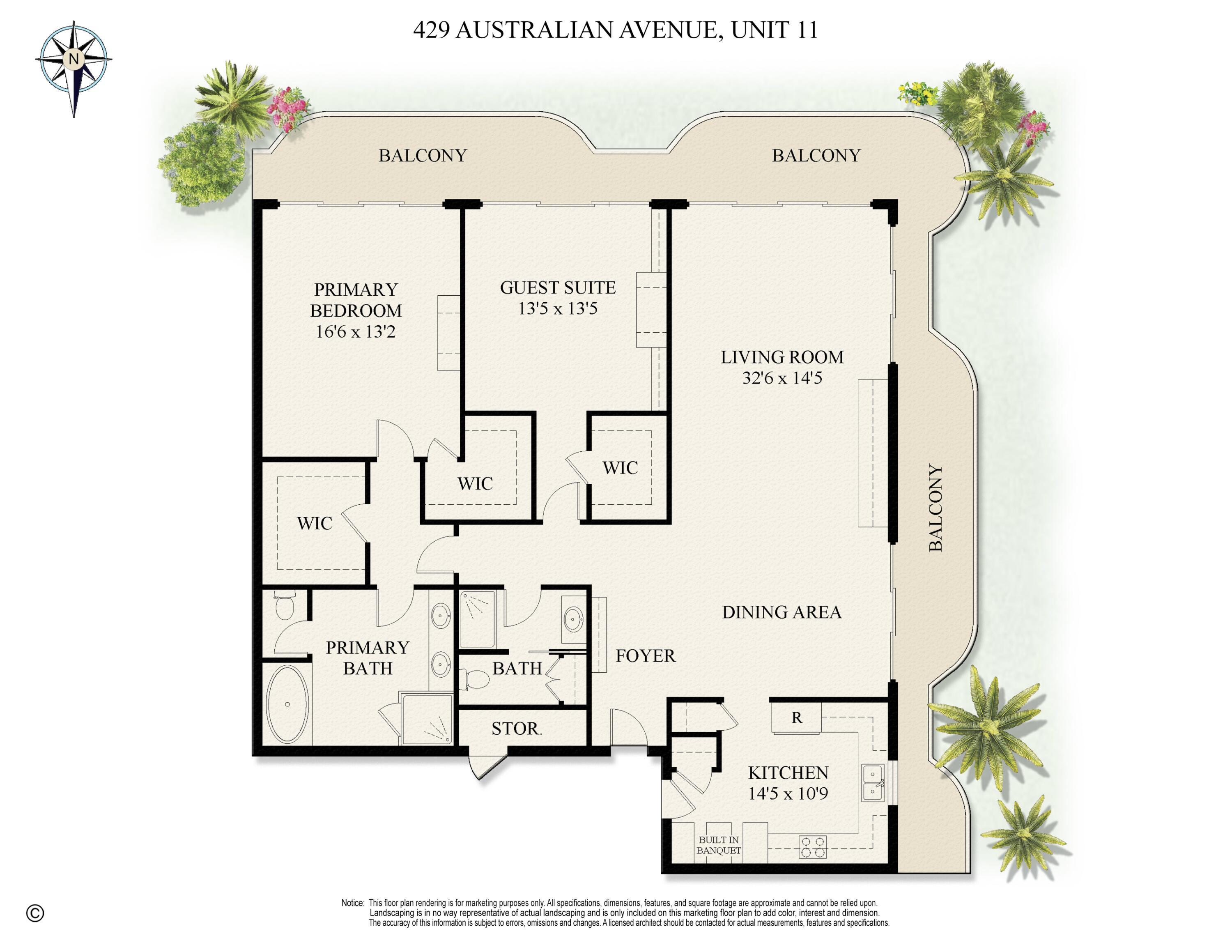 Located on the top floor of The Australian, this southwest-facing condominium offers 2,120+/- total square feet with two bedrooms, two bathrooms, and abundant natural light. A foyer with a custom built-in opens to the main living and dining area with floor-to-ceiling doors and windows that open to a large wraparound balcony.The eat-in kitchen features Gaggenau appliances--including a microwave, oven, cooktop, and dishwasher--along with a Sub-Zero refrigerator and freezer, ample storage, a built-in banquette with table for casual dining, and a separate service entrance.The primary suite includes two walk-in closets, a built-in desk, and a well-appointed bathroom with dual sinks, a soaking tub, and a walk-in shower. The guest bedroom offers its own walk-in closet and built-in desk,with a full bath across the hall. Both bedrooms enjoy direct access to the wraparound balcony. Additional features include two parking spaces, and in-unit laundry. The Australian is a boutique 12-unit building known for its privacy and in-town convenience ideally located just blocks from Worth Avenue, the beach, the Lake Trail, and Palm Beach's premier shopping and dining. The building offers a pool, full-time manager, doorman services, a guest bedroom for overflow guests, laundry room, as well as 2 storage rooms.