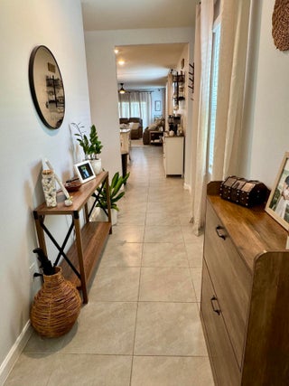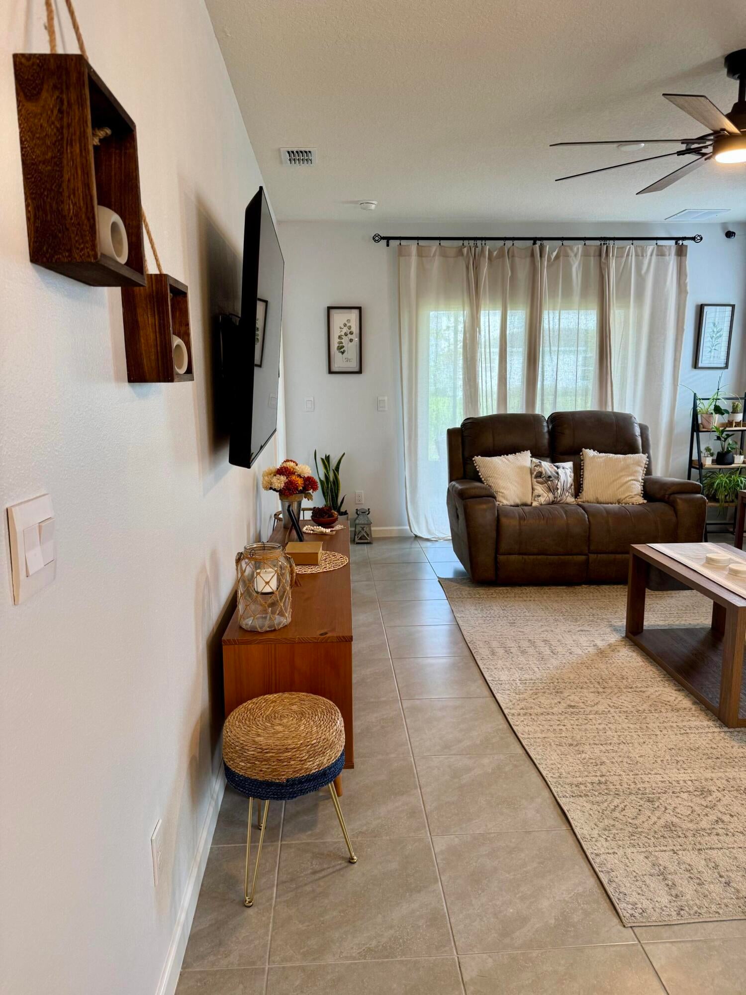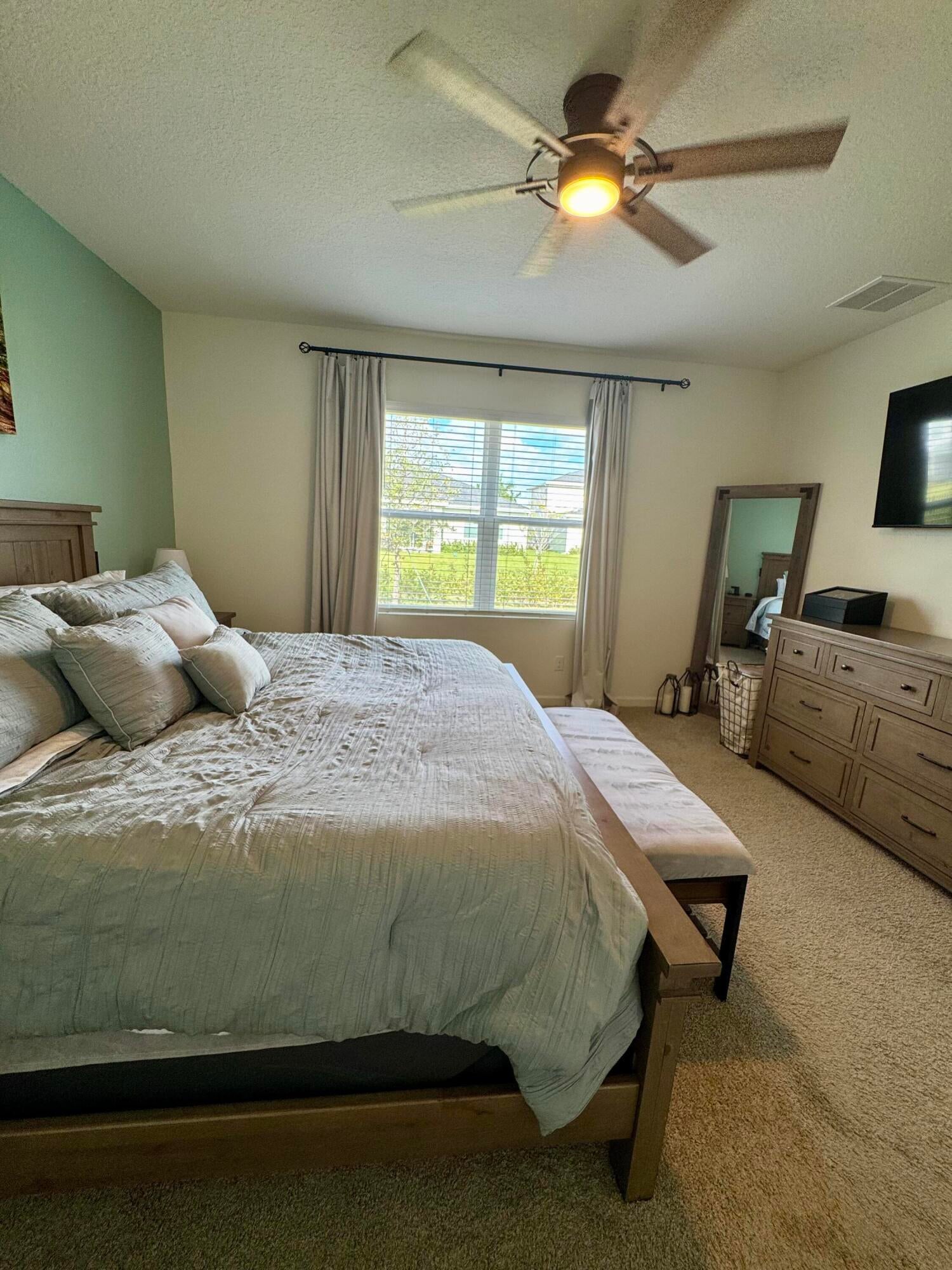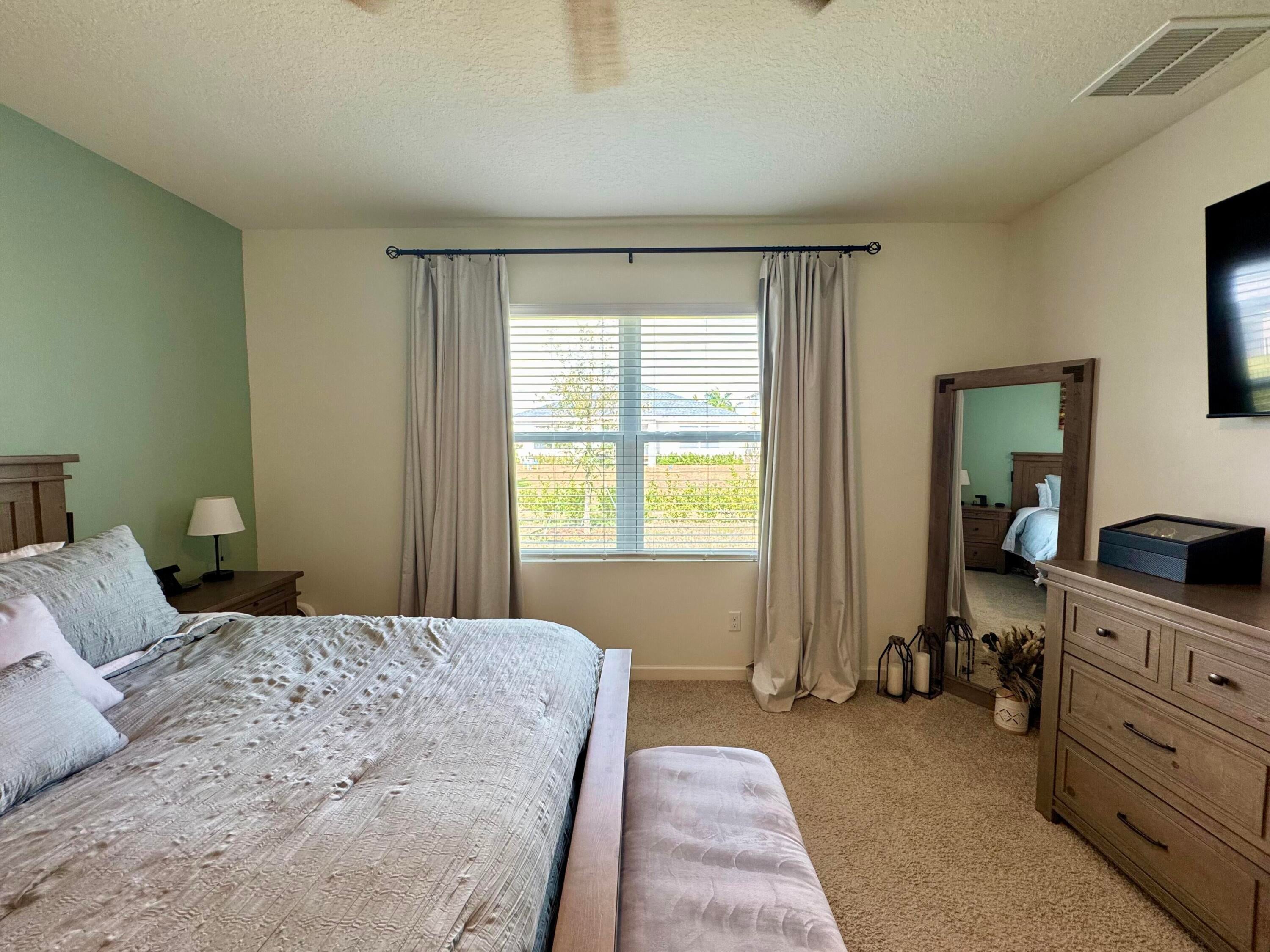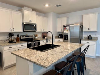 Welcome to this beautifully upgraded 3-bedroom, 2-bath CBS home with a split floor plan and 2-car garage in the desirable Central Park community.Highlights:(Modern kitchen with large island, cabinets with upgraded handles, granite countertops, stainless steel appliances, and oversized pantryGranite single bowl sink with matching dual function pull down faucet Tile flooring in main living areas & flex space; carpet in primary and secondary bedroomsCustomized primary closet and upgraded cabinet hardwareScreened patio for outdoor enjoyment Two ceiling-mounted garage storage units (one with adjustable height)Workbench with shelving for tool storage (removable if desired)Whole-house Brita water filtration system (Hurricane panels with hardware.