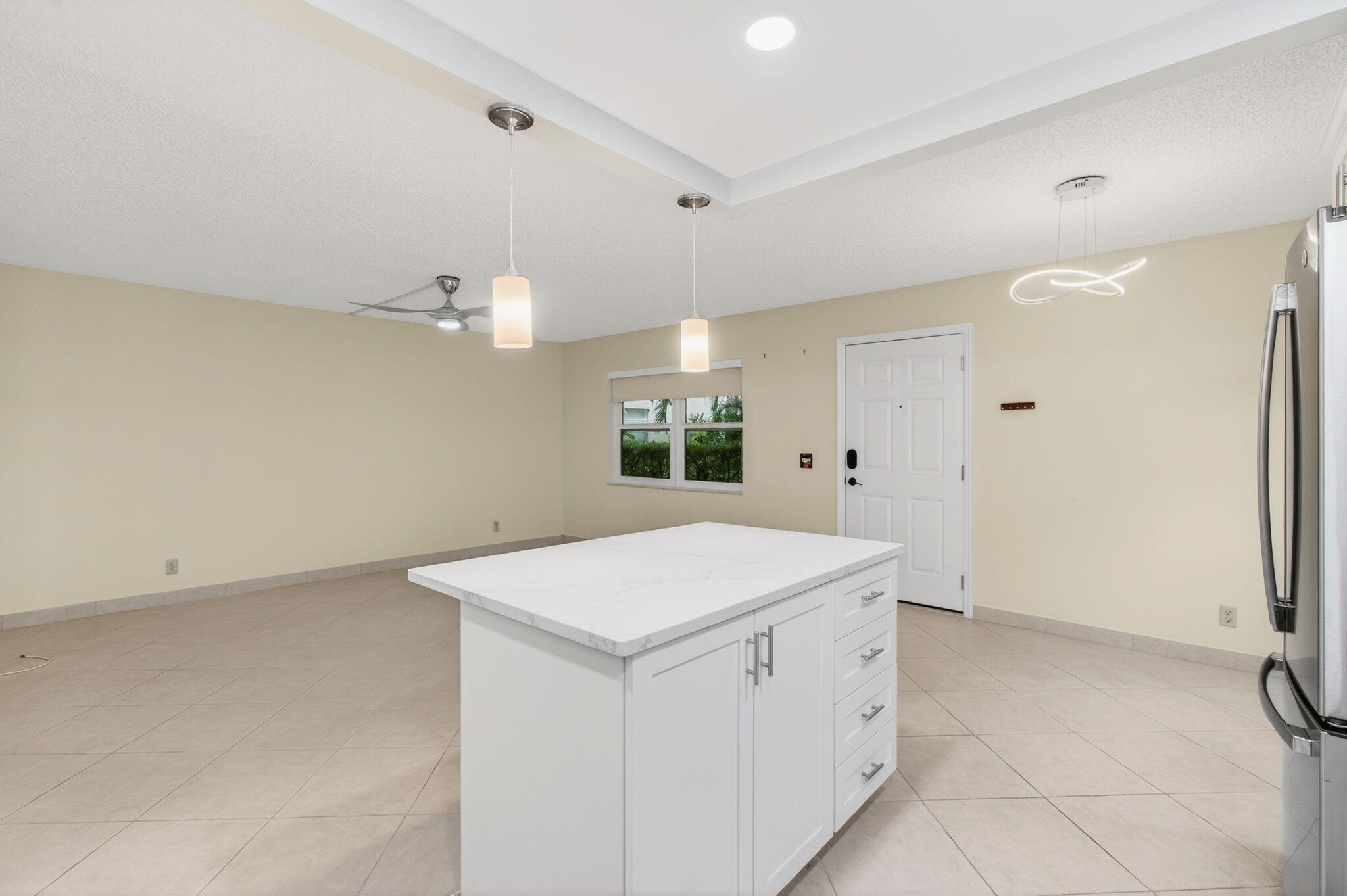 Move right into this SPECTACULAR REMODELED 2-bedroom, 2-bath ground-floor condo featuring quality upgrades throughout. Renovated approx. 3 years ago, this light-filled home offers full hurricane-IMPACT windows and doors for comfort, security, and efficiency. The modern kitchen boasts a true island, quartz countertops, and stylish finishes, opening to spacious living and dining areas ideal for entertaining. Updated baths, ceiling fans in every room, A/C (2019) and water heater (2022) add peace of mind. Enjoy a private primary suite and serene screened patio with exterior door and tranquil views. Blackout shades in the second bedroom add functionality. Located in Kings Point 55+ with world-class amenities. SELLER FINANCING AVAILABLE.Located in the sought-after Kings Point 55+ community with world-class amenities including golf, pools, fitness centers, pickleball, clubs, cafés, and courtesy shuttles.No expense spared, blinds in evey room, blackout shades in the second bedroom.Plenty of privacy form the patio.