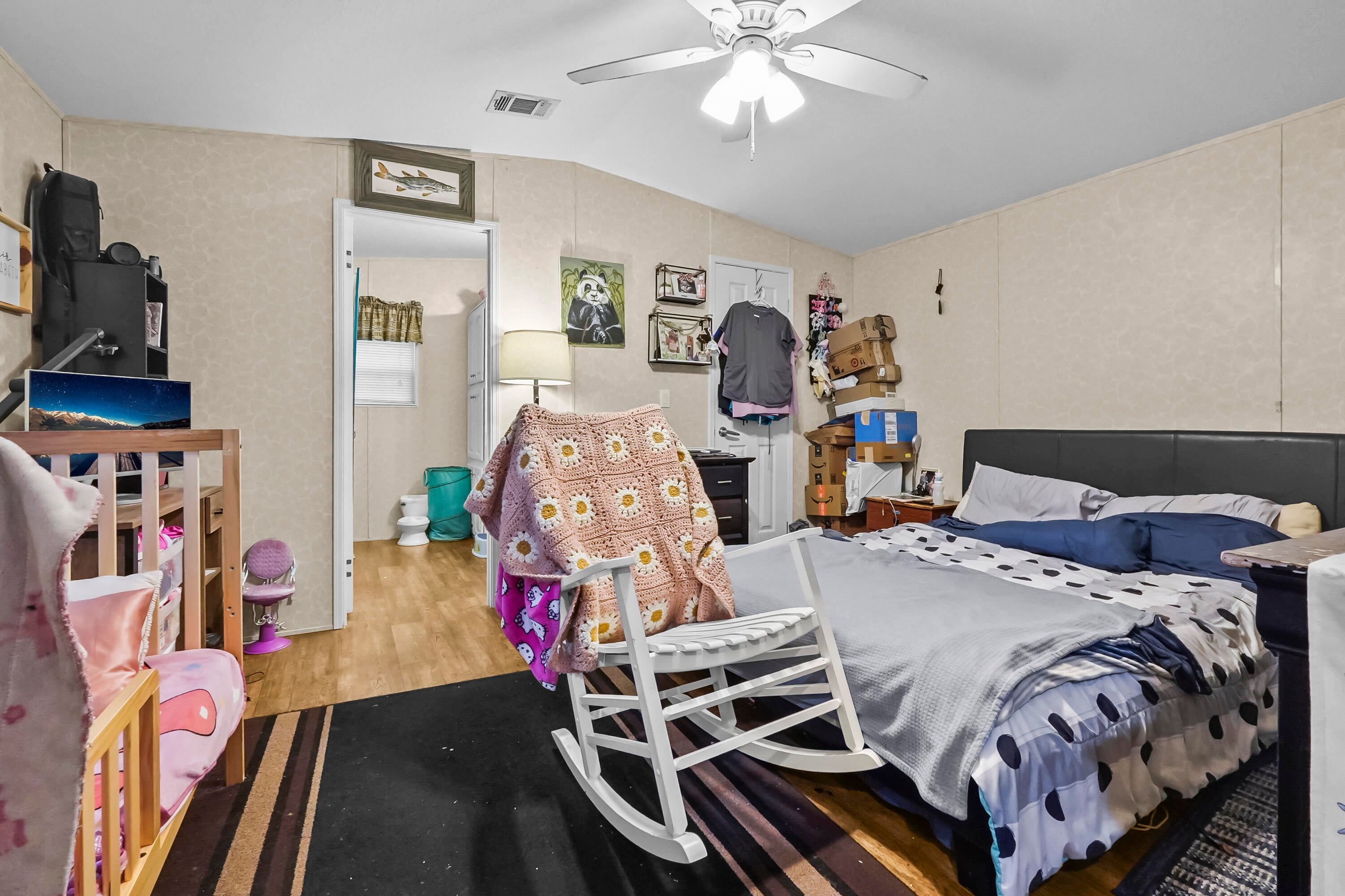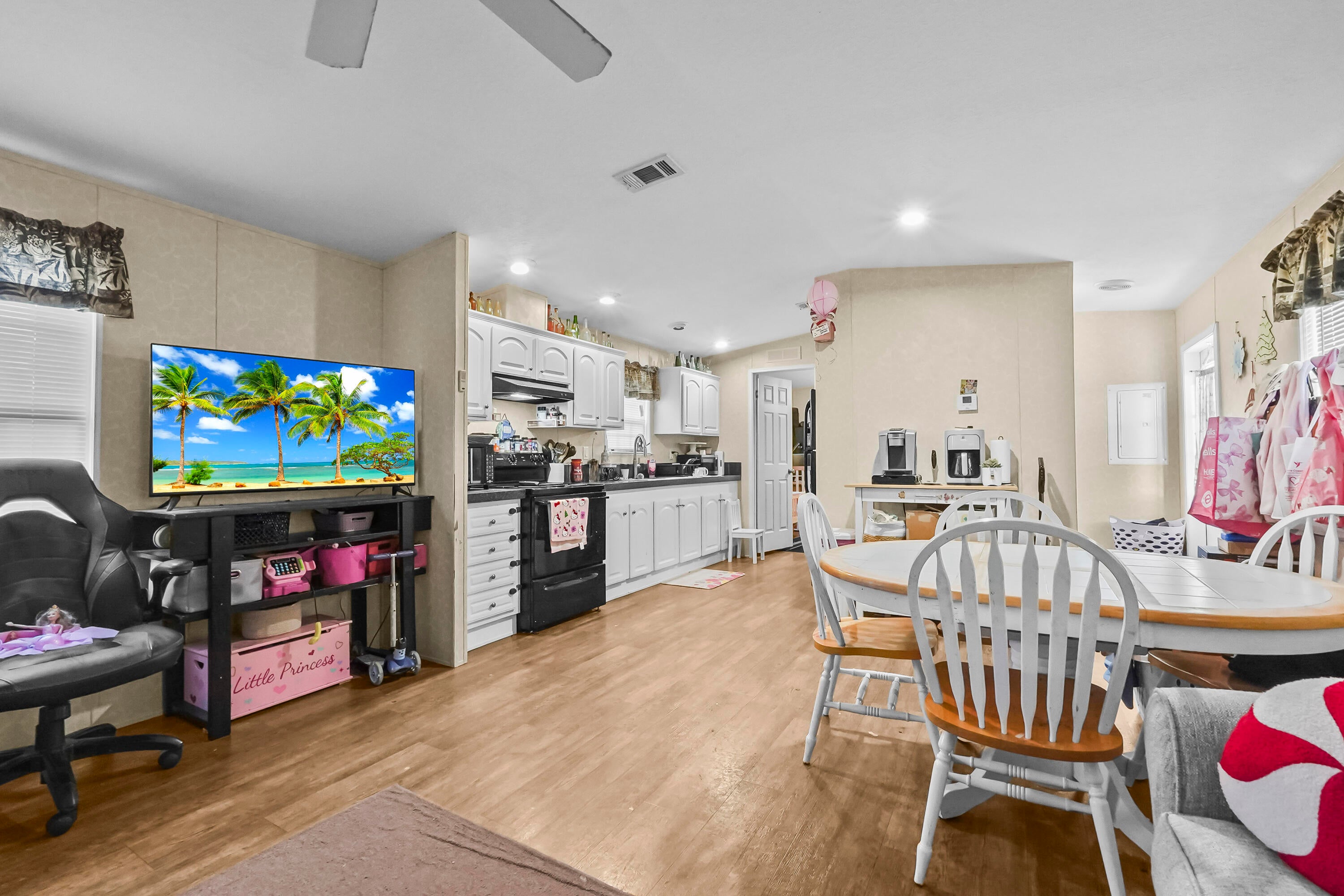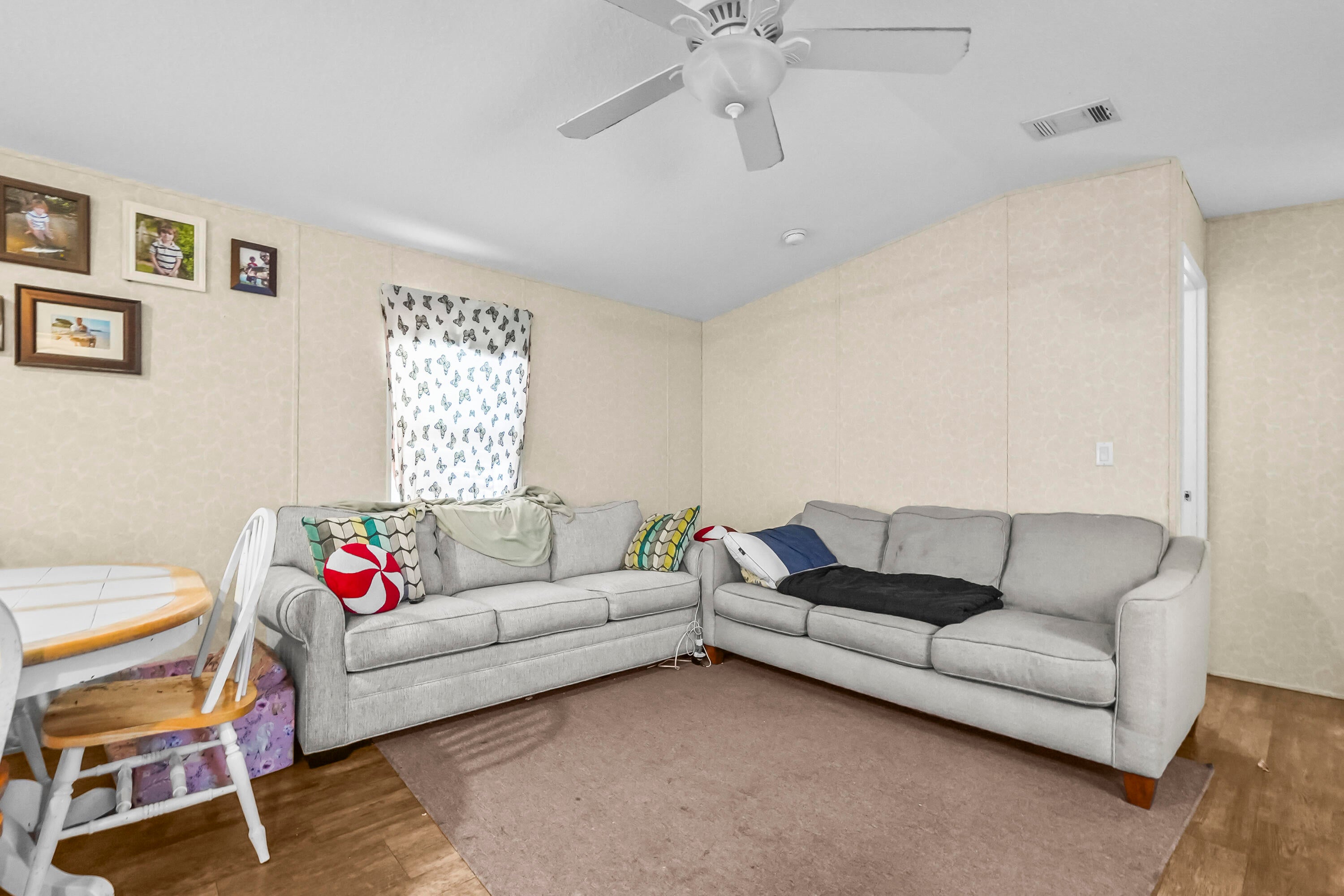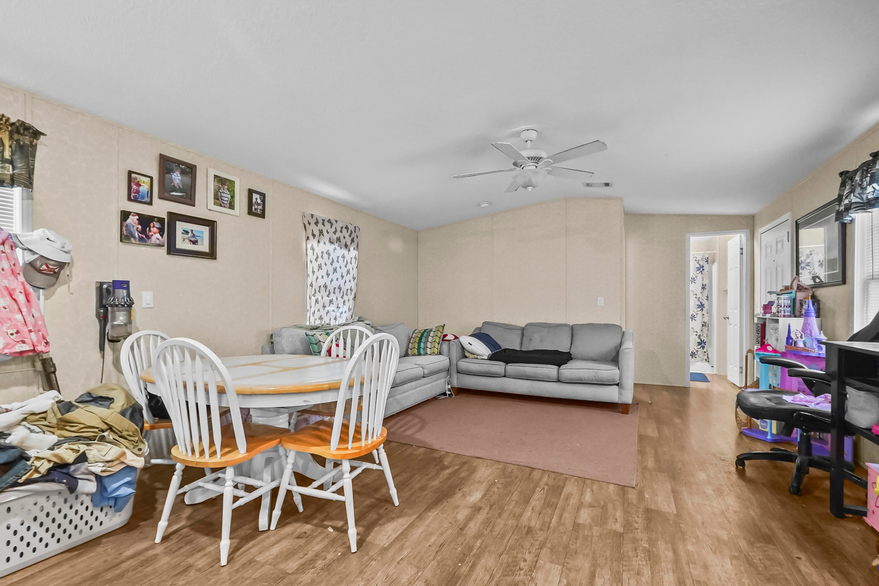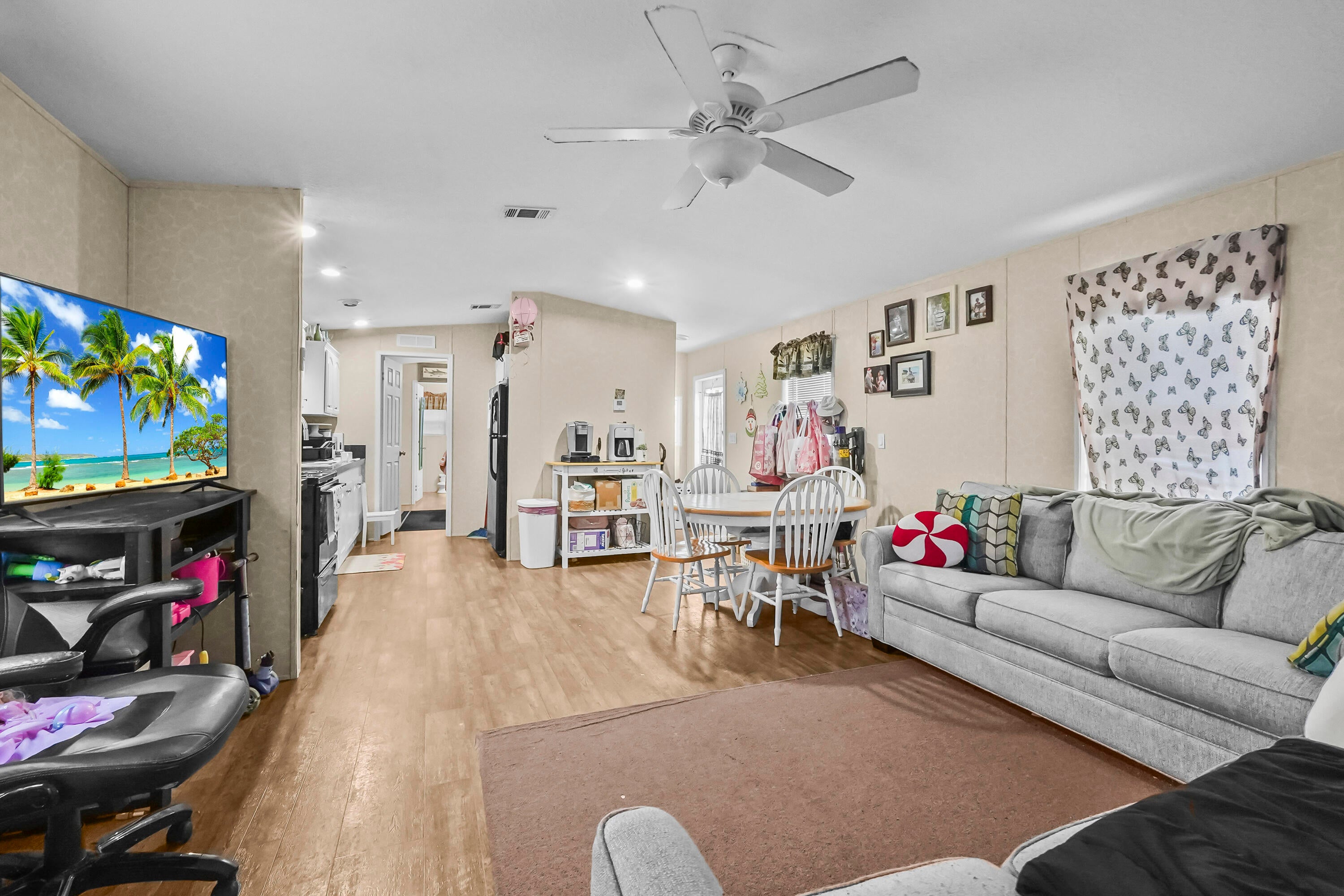 Charming 2-bedroom, 2-bath home featuring 912 sqft of comfortable living space. Enjoy an open living and dining area with laminated flooring throughout, perfect for entertaining or relaxing. The home includes a foyer with a convenient washer and dryer location. Step outside to a spacious open patio for outdoor enjoyment. The property offers voluntary HOA payments with no HOA restrictions, giving you the flexibility and freedom to make it your own.