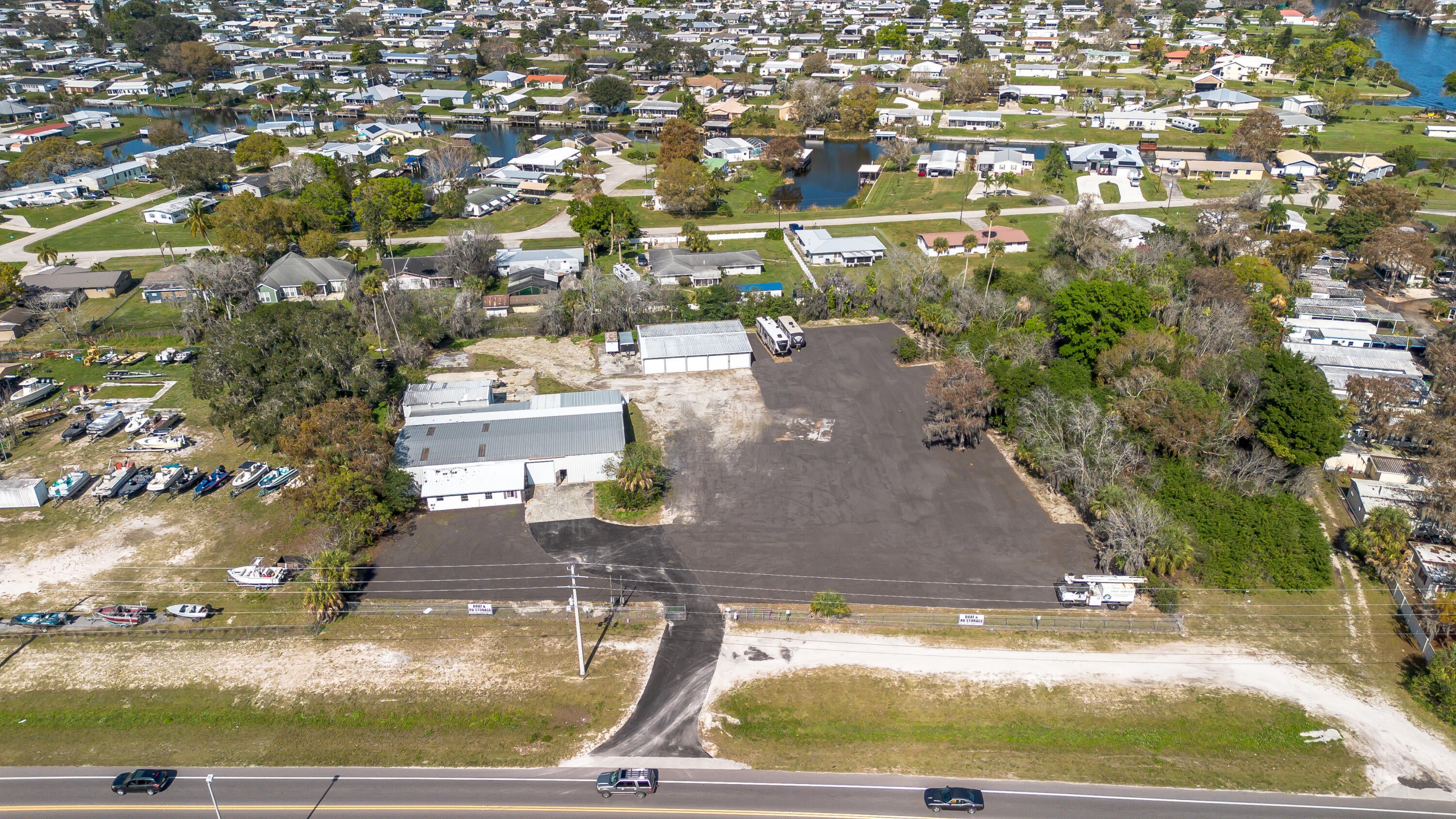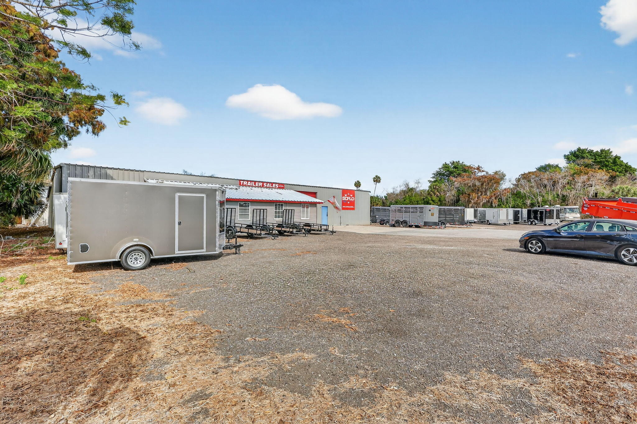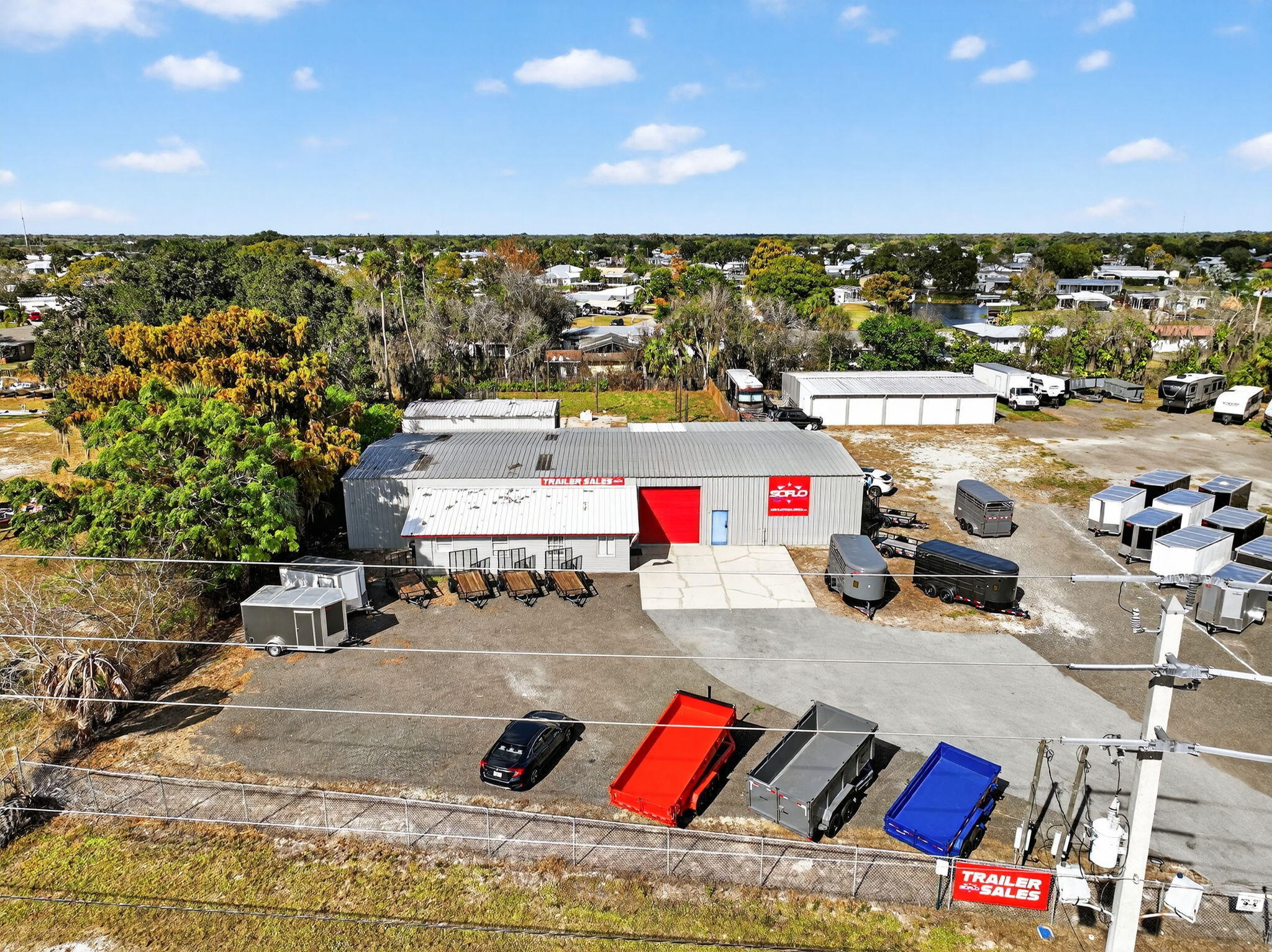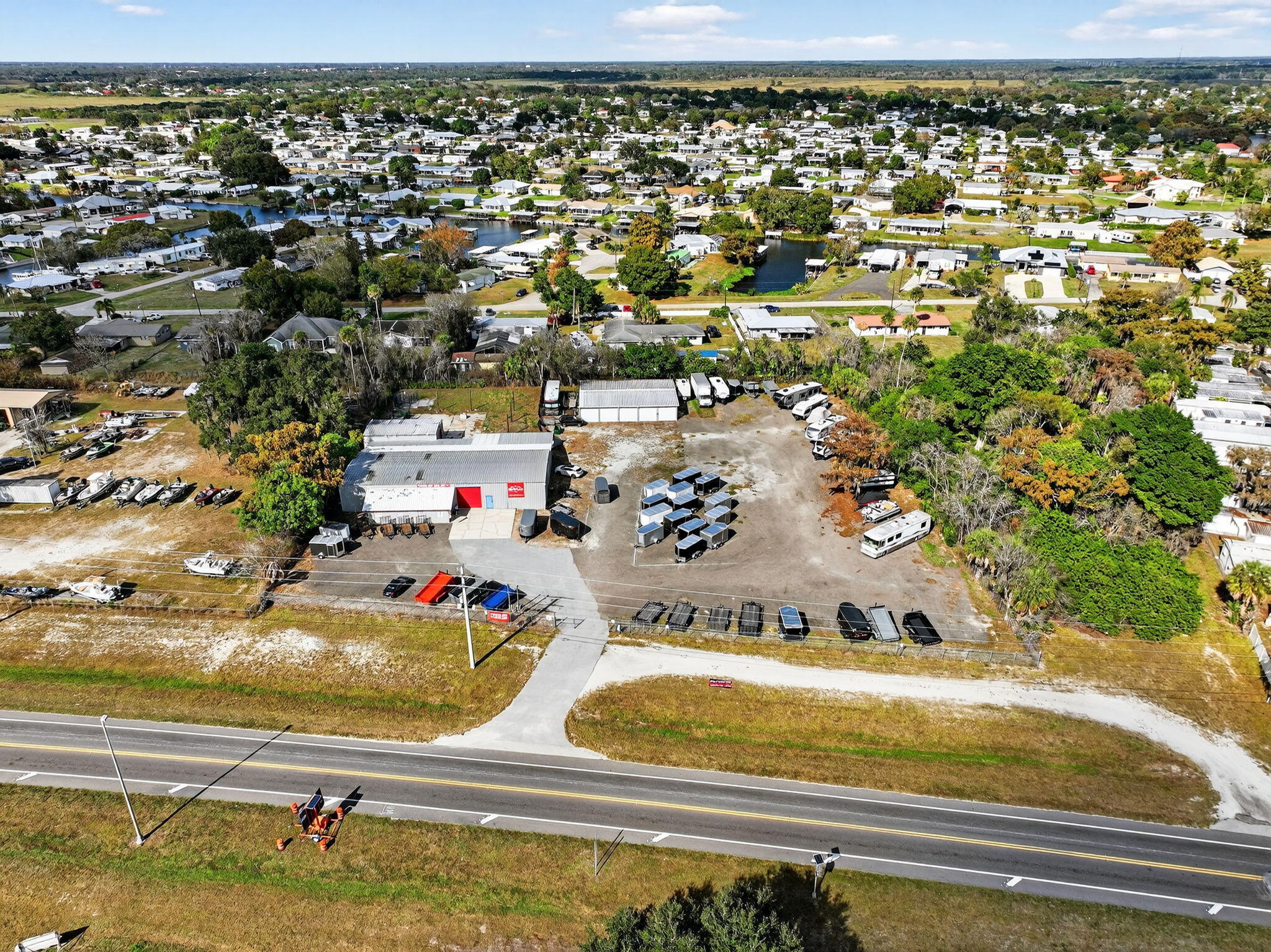 Over 2 acres of commercial property located in Okeechobee, FL with prime frontage along high-traffic US-441. The property is zoned for Vehicle Sales & Repair, allowing a wide range of permitted uses including automotive, marine, RV, trailer, motorcycle, & equipment sales, service, & storage.Improvements include multiple warehouse buildings totaling over 11K sq ft, featuring overhead doors, high ceilings with ample vertical clearance, office space, restrooms, garage areas, and flexible interior layouts suitable for various commercial operations. The expansive site offers ample parking, outdoor storage, vehicle display, and room for future expansion.The property is currently used as a trailer dealership with boat & RV storage. Completely fenced & gated with top notch security system