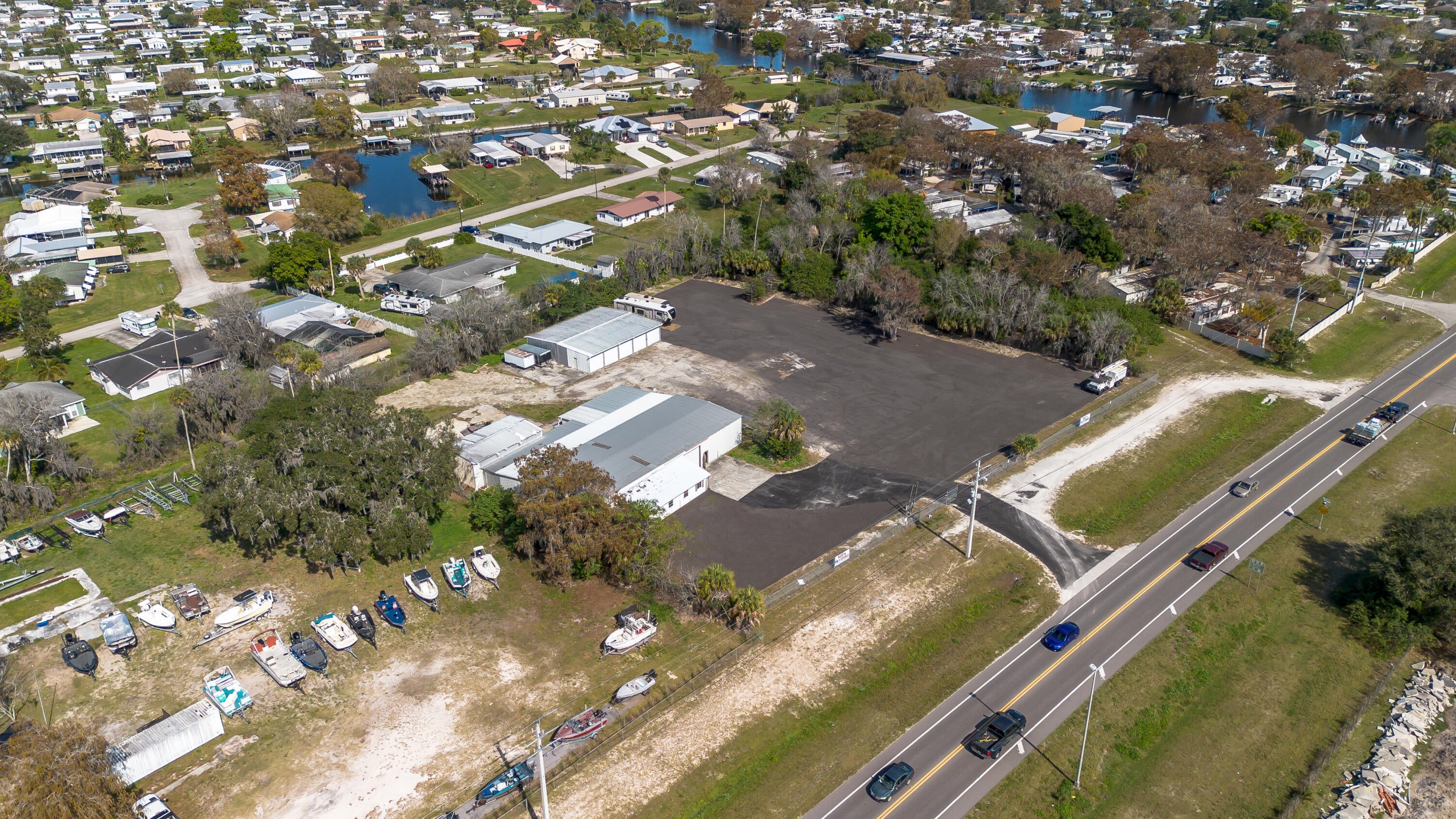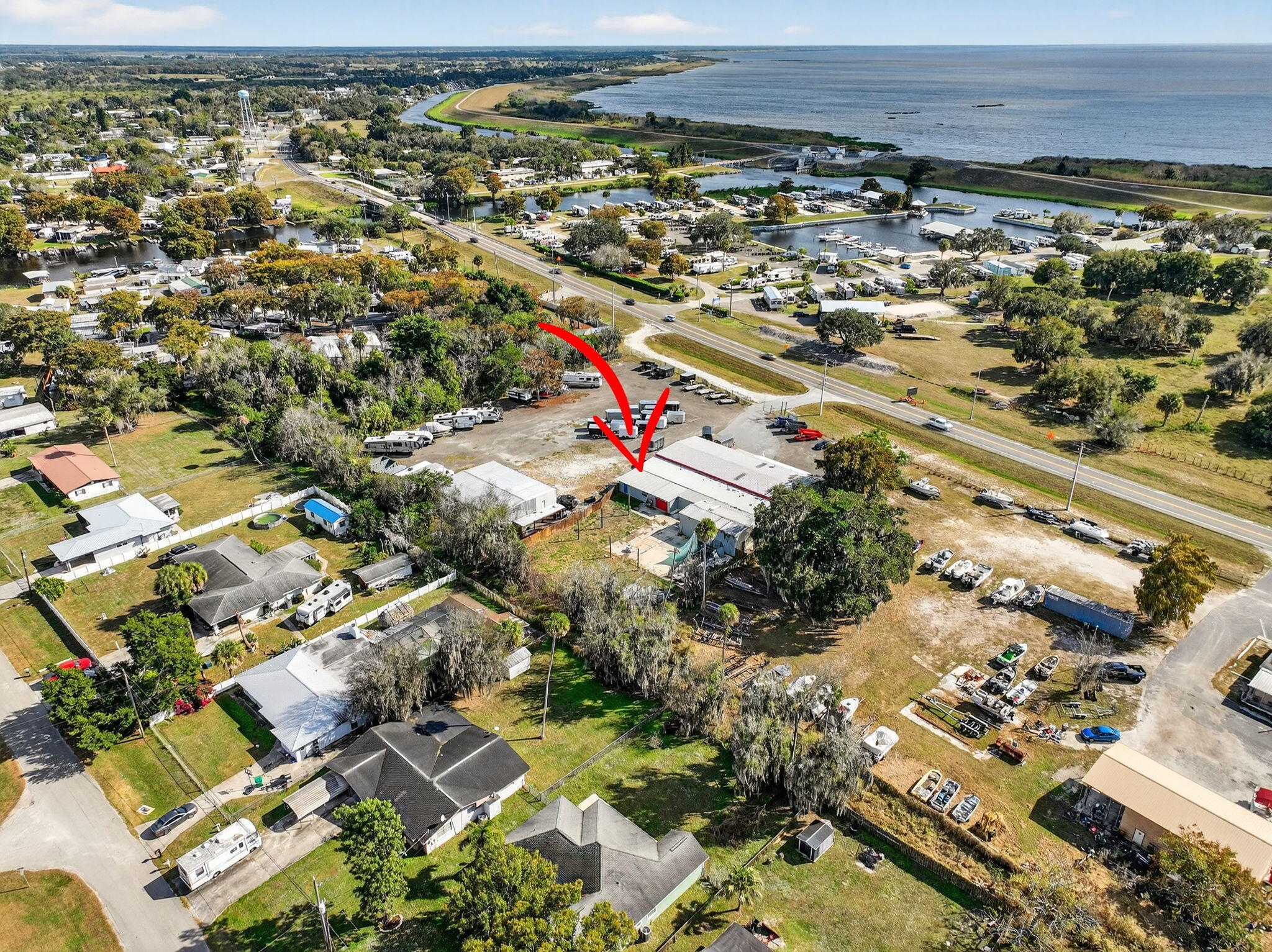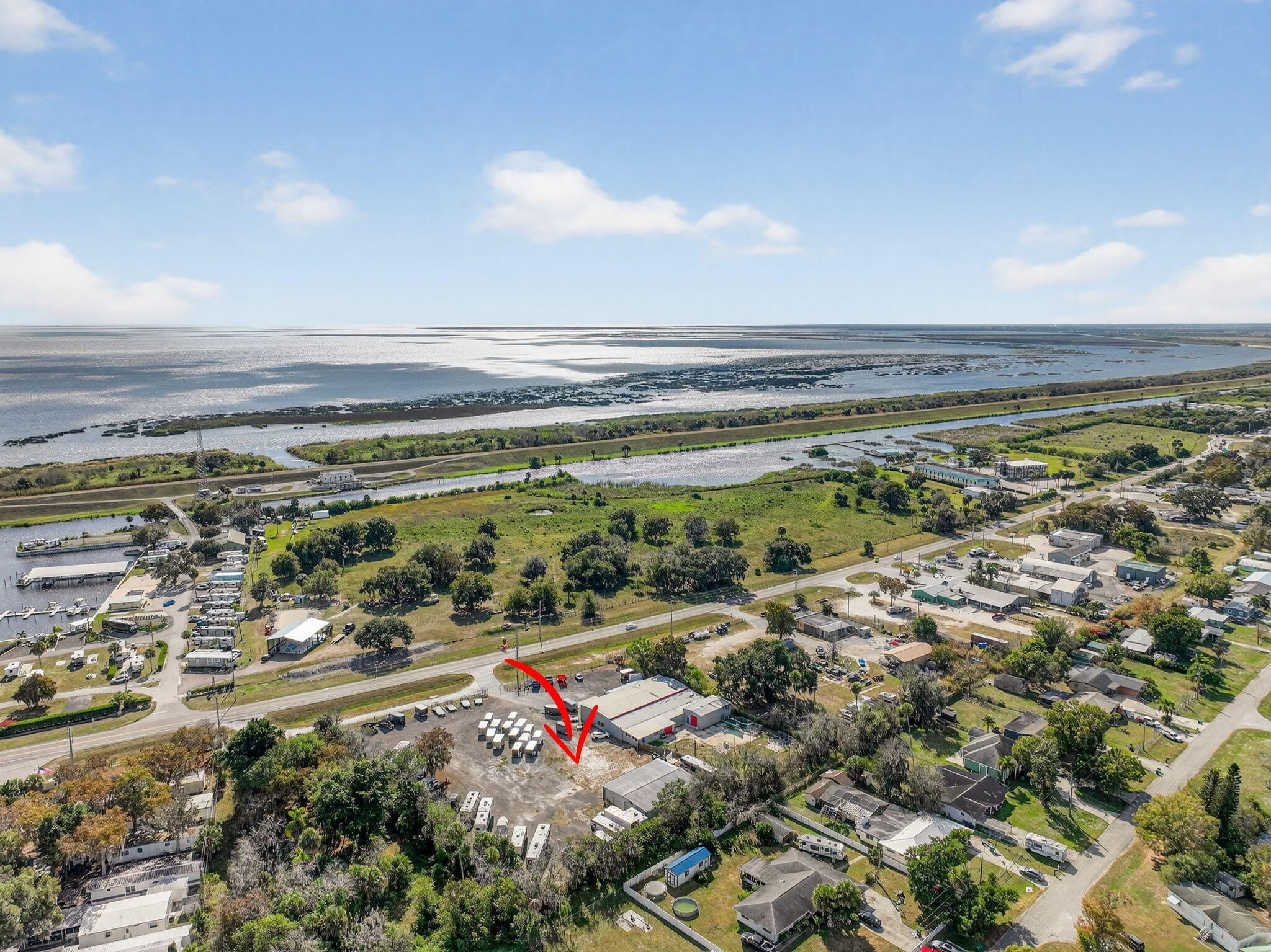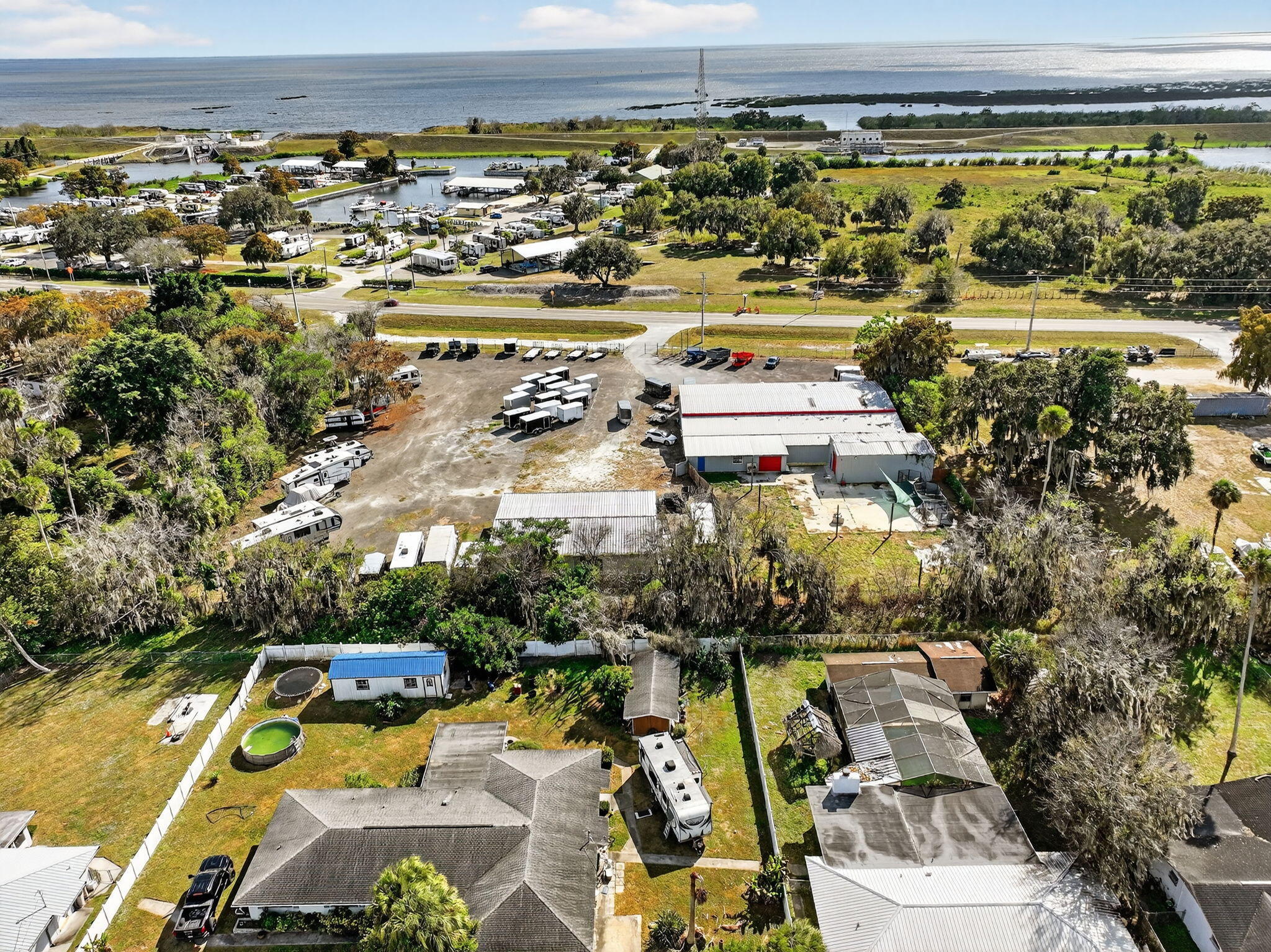 Over 2 acres of commercial property located in Okeechobee, FL with prime frontage along high-traffic US-441. The property is zoned for Vehicle Sales & Repair, allowing a wide range of permitted uses including automotive, marine, RV, trailer, motorcycle, & equipment sales, service, & storage.Improvements include multiple warehouse buildings totaling over 11K sq ft, featuring overhead doors, high ceilings with ample vertical clearance, office space, restrooms, garage areas, and flexible interior layouts suitable for various commercial operations. The expansive site offers ample parking, outdoor storage, vehicle display, and room for future expansion.The property is currently used as a trailer dealership with boat & RV storage. Completely fenced & gated with top notch security system