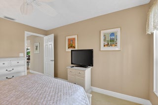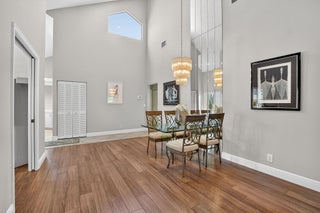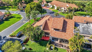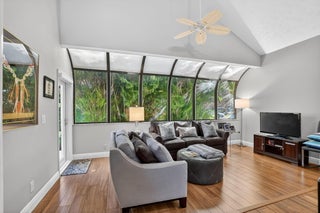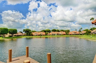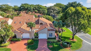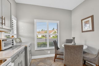 End-unit villa in desirable Meridiana at Boca Pointe featuring 2 bedrooms plus a den or optional 3rd bedroom. High ceilings enhance the open feel, complemented by an enclosed sunroom for added living space. The kitchen has been updated with quartz countertops, gray cabinetry, and white appliances. Both bathrooms have been tastefully remodeled. Laminate flooring runs throughout the main living areas, den, and master bedroom, with tile in the kitchen and carpet in the second bedroom. Enjoy a private backyard with patio and impact-glass patio door. Additional features include plantation shutters, replaced washer and dryer, water heater (2018), A/C (2016), and a redone garage floor with built-in cabinets included. Community amenities include a pool and small clubhouse.