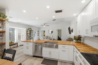 Welcome to Jupiter River Estates, one of Jupiter's most desirable non-HOA neighborhoods. This CBS home offers 4 bedrooms, 2 full bathrooms, and a 2-car garage, all in a prime location close to restaurants, shopping, I-95, and Jupiter's beaches.The kitchen features white cabinetry, butcher-block style countertops, a farmhouse sink, built-in storage, and generous counter space, making it both functional and inviting. Laminate flooring runs throughout the main living areas, and the living room boasts raised ceilings that create a bright, open feel.The primary suite includes a spacious walk-in closet, slider access to the backyard, and an en-suite bath with dual sinks, a large shower, and a linen closet. The guest bedrooms share a full bathroom with a tub/shower combo.Enjoy Florida living outdoors with a fully fenced yard, perfect for kids or pets. Additional features include a 2018 metal roof, 2017 A/C (recently serviced), storm protection, and an impact-rated garage door. Zoned for highly rated schools, including Jerry Thomas Elementary, Independence Middle, and Jupiter High - all rated A or B. A rare opportunity to own a move-in ready home in one of Jupiter's most sought-after neighborhoods with no HOA. Schedule your showing today - this one won't last!