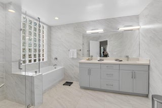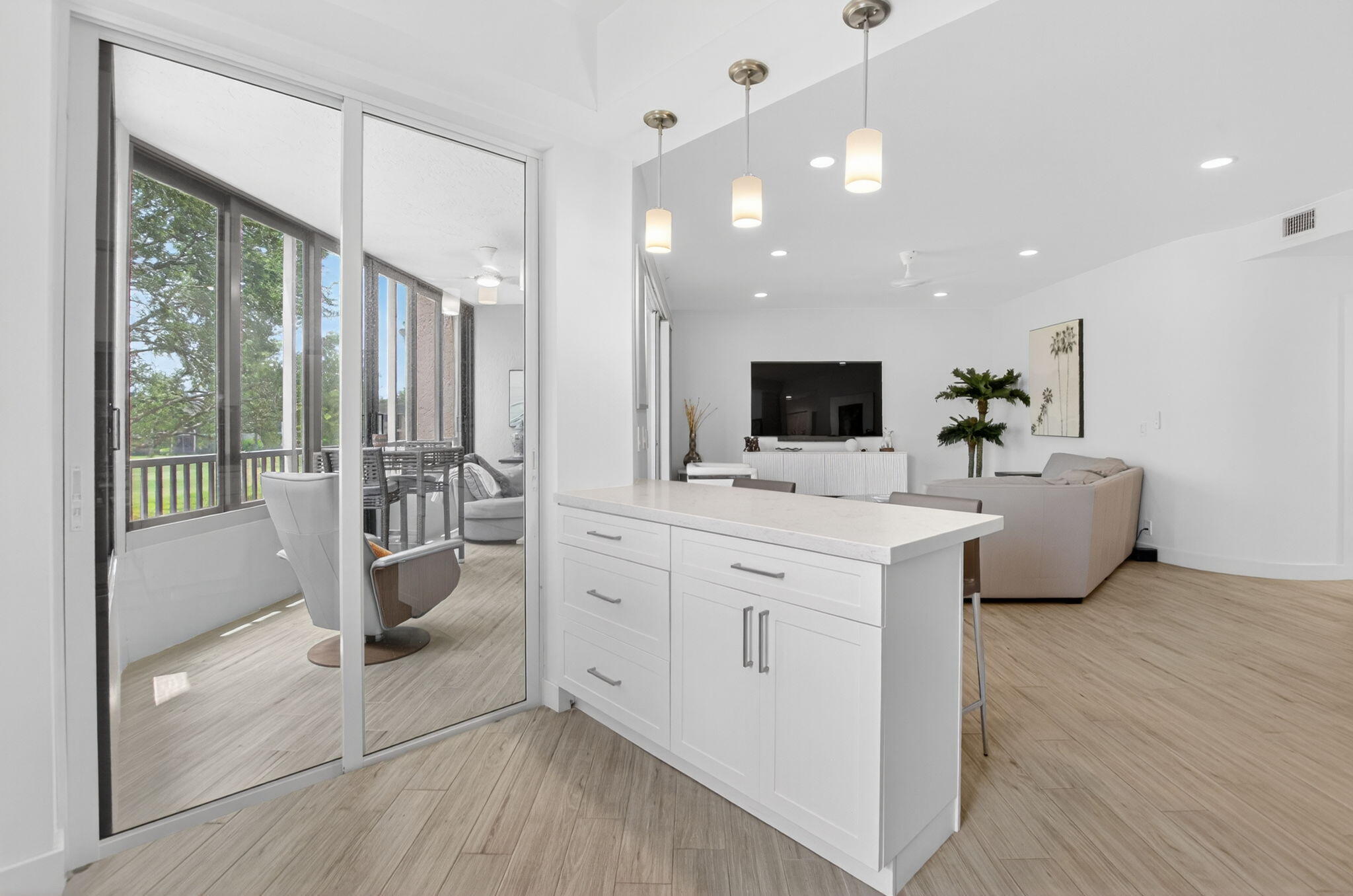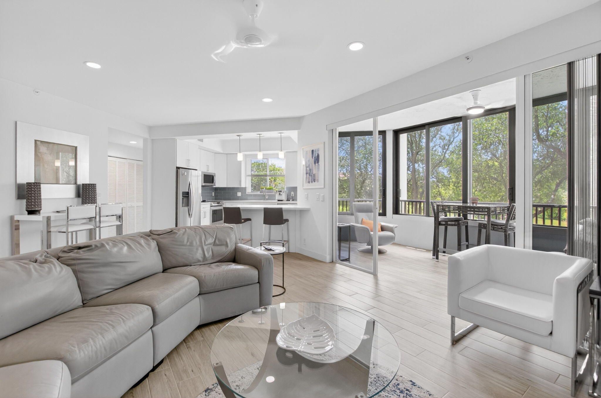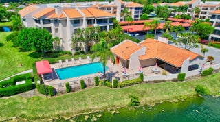 Exquisitely renovated 3/2 condo with designer finishes throughout. Elegant ''wood-look'' tile floors flow seamlessly through spacious living areas. Gourmet kitchen features white cabinetry, quartz counters, glass tile backsplash, and premium stainless appliances. Impact glass windows throughout! Enclosed patio offers serene garden and lake views. Lavish master suite with dual closets and spa-inspired bath. Both bathrooms fully updated with upscale finishes. Smooth ceilings, designer fans, full laundry room, Murphy bed in 3rd bedroom, 2024 A/C and 2023 water heater and so much more!!!. Move-in ready! Community has 2 pools, 2 tennis courts and a small clubhouse. One assigned covered parking space.