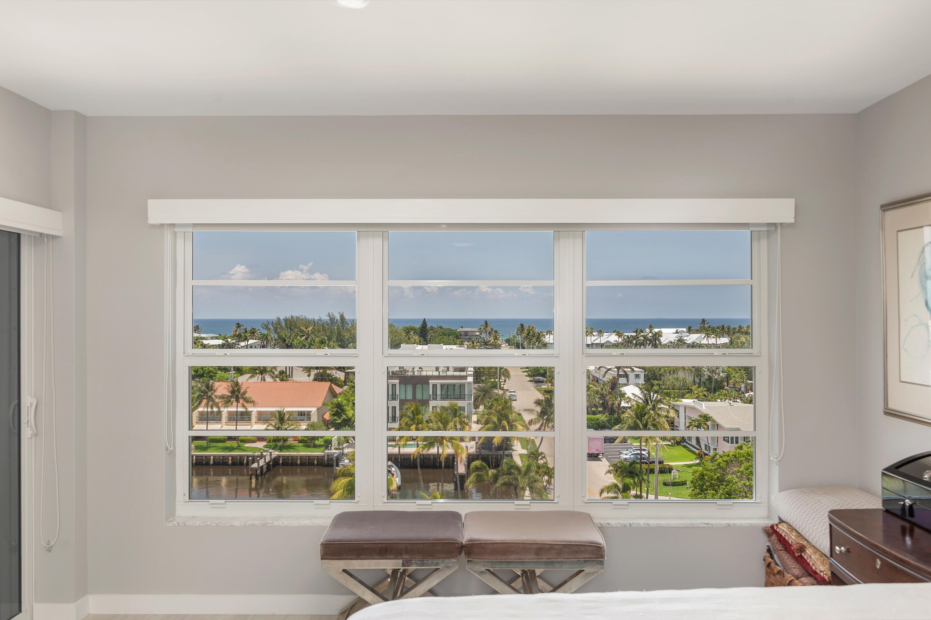 Welcome to Delray Beach, Seagate Manor 805! This beautiful 2-bedroom 2-bath, 55+ condo on the 8th floor offers breathtaking views of the ocean, Intracoastal Waterway, & marina from its north-eastern corner. Step into a bright living space filled with natural light from new impact windows & sliders. Florida room has been enclosed with pocket sliders that allow you to open up it into one grand room. The modern kitchen features quartz countertops, LG appliances, & a convenient walk-in pantry. Primary suite has ocean views, walk-in closet, & bath with a double vanity & walk-in shower. Second bedroom includes a murphy bed & walk-in closet, perfect for guests & an office. Just stroll down the street to beautiful beaches, vibrant nightlife and shopping. Dock slips currently available.