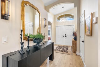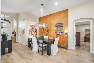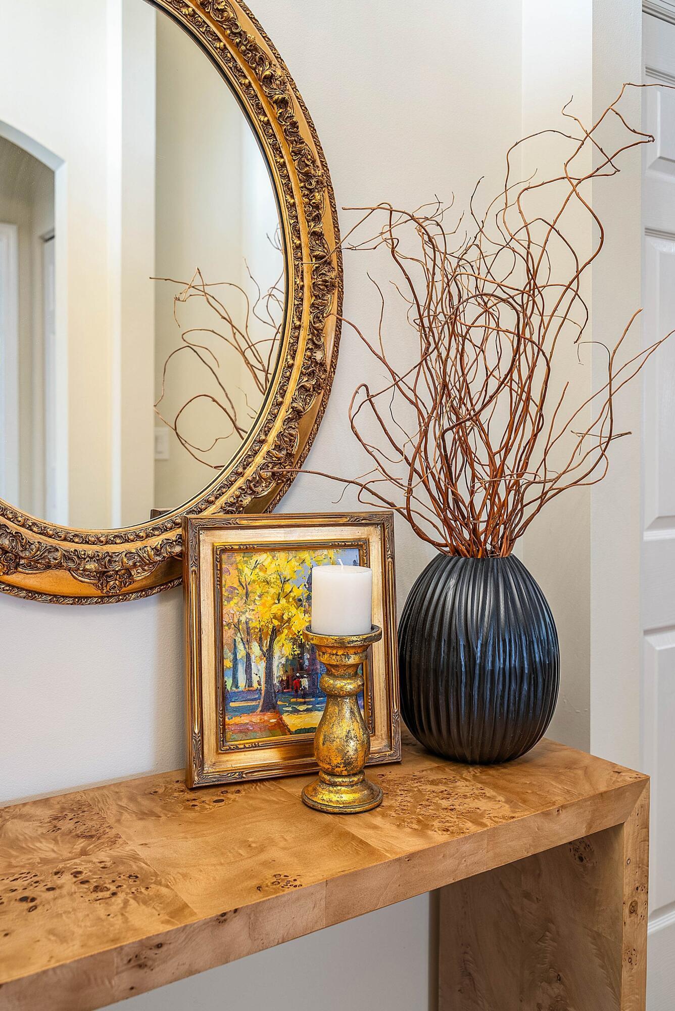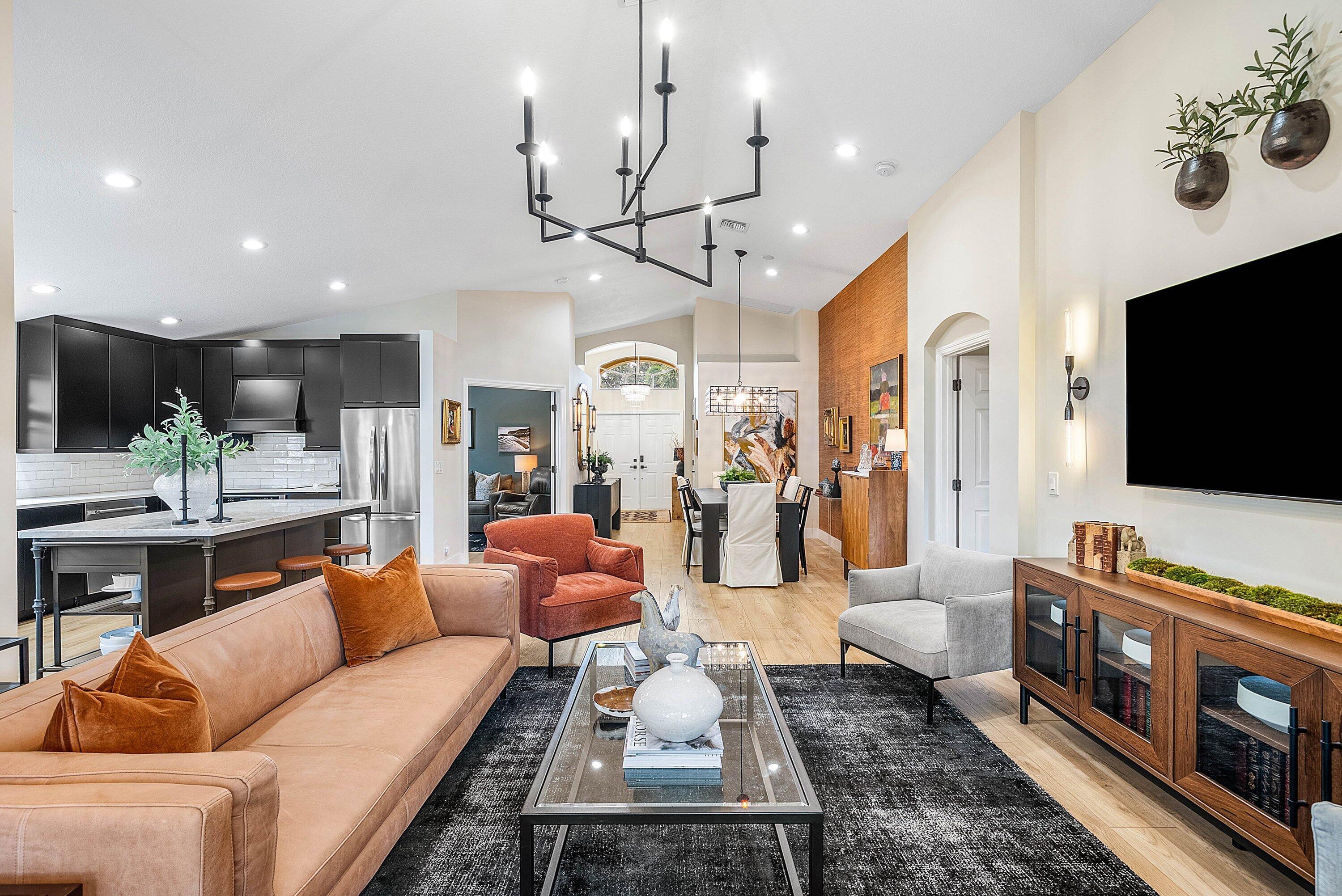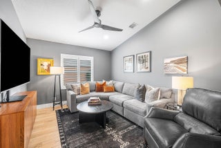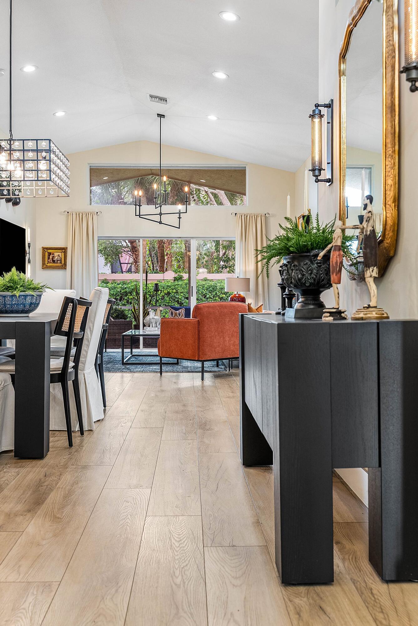 Welcome to 6847 Viale Elizabeth, an exceptionally renovated, magazine worthy single family home in Villa Borghese, an active 55+ community with a 24/7 manned guard gate. This home features 3 bedrooms or 2 bedrooms plus a den/home office and 2 baths, with modern design finishes and comfort. The entry sets the tone: wide plank wood like floors, designer lighting from Pottery Barn, Arhaus and RH, fresh paint and an expansive sightline that draws the eye directly to the private, oak tree lined backyard, with beautiful side easement . The kitchen is a masterpiece-- a free standing marble and iron island, sleek black modern soft close cabinetry, induction stove top, KitchenAid SS appliances, all open concept. New AC in 2024 with 10 year warranty, private laundry with LG washer and dryer.The primary bedroom is oversized and features an en suite with roman tub and double sinks. Plantation shutters throughout, for an elegant touch. Further, new door and hinge hardware throughout! Every window on the exterior has accordion hurricane protection shutters. Enjoy this property this season relaxing on the private screened in lanai with TV and fan, and outdoor side space to add an herb garden or BBQ grille. This property is one of a kind! Monthly HOA fee includes AT&T Direct TV plus internet, landline, monitored ADT home security system, lawn maintenance, pressure wash roof and driveway. The community offers a beautiful and active clubhouse, full-time on-site management, a resort style pool, fitness center, billiards, library, bocce, pickleball and tennis courts.