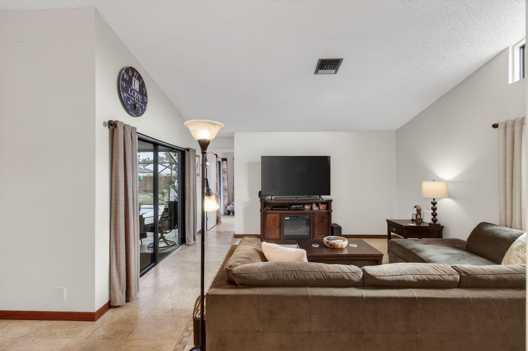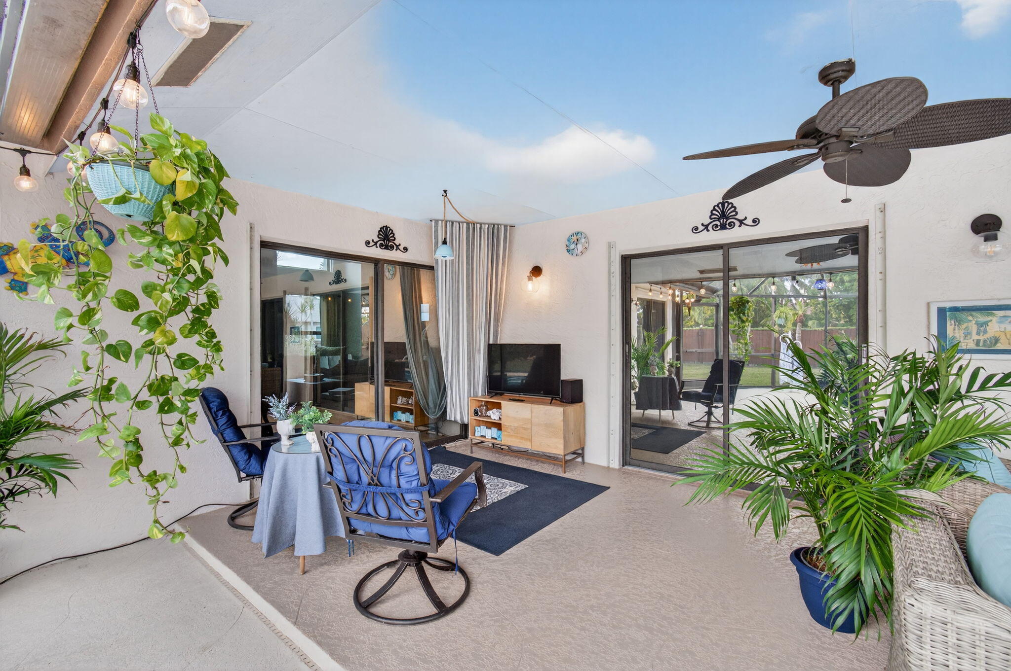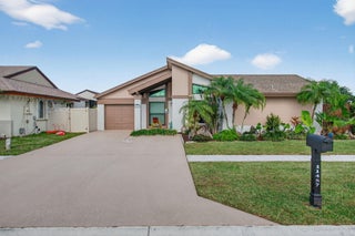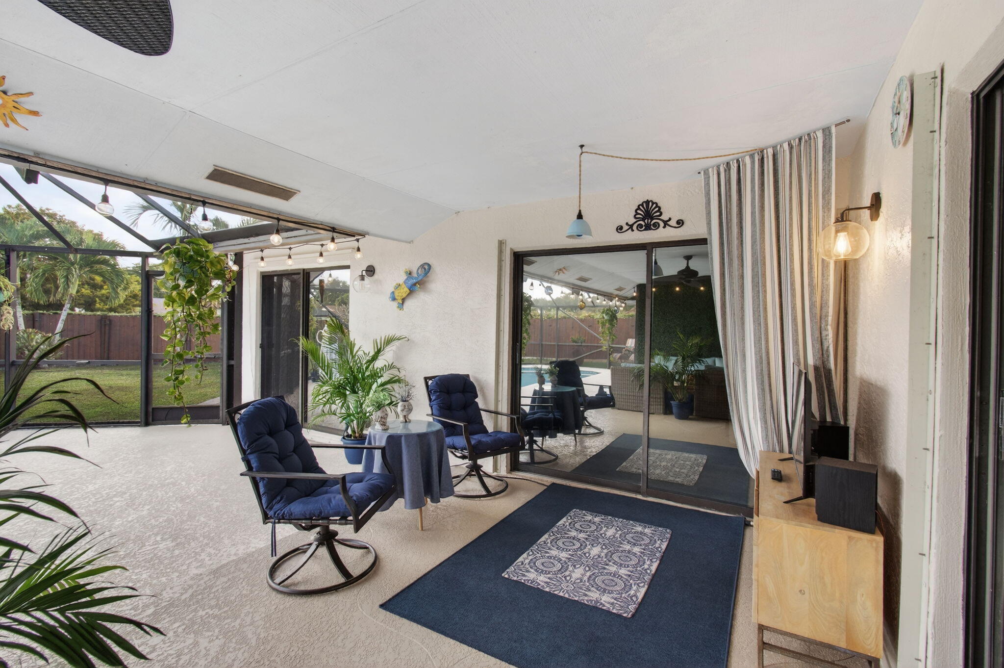 This meticulously maintained 3 bedroom, 2 bath, 1 car garage single-family home is ideally located in the highly desirable Loggers Run community of West Boca Raton, perfectly situated on a private, oversized corner lot. Recently painted inside and out, the home presents a fresh, move-in-ready feel, with tinted windows and doors for enhanced energy efficiency and privacy. Nearly all openings are equipped with hurricane-impact windows and doors, and hurricane panels are provided for the non-impact sliding doors, offering added peace of mind.Entering the home, you are immediately greeted by soaring vaulted ceilings, architectural ceiling details, and clerestory-style windows that flood the open-concept living spaces with abundant natural light. Durable travertine-style tile flows seamlessly throughout the main areas, creating a cohesive, low-maintenance design. The formal living and dining areas provide a flexible layout suitable for both everyday living and elegant entertaining. The dining space is enhanced by crown molding, a statement chandelier and adding sophistication and depth to special occasions. The chef-inspired kitchen serves as the heart of the home, featuring custom wood cabinetry, granite countertops, stainless steel appliances, and a spacious breakfast bar with open sightlines to the living areas. Thoughtful details include a built-in microwave, smooth-top range, appliance garage, deep undermount stainless steel sink, modern gooseneck faucet, and generous prep and storage space, blending style and functionality. A secondary living area offers a versatile retreat with direct access to the pool deck through sliding glass doors, ideal as a family room, media space, or home office. The primary suite is a tranquil retreat overlooking the pool, with expansive windows and sliding doors that fill the space with natural light and offer serene views of the backyard oasis. The en-suite bathroom is designed for luxury and relaxation, featuring dual vessel sinks set against a striking mosaic tile backsplash, a walk-in closet separated by frosted glass sliding doors, and a glass-enclosed walk-in shower with floor-to-ceiling tile and a rainfall showerhead, creating a true spa-like experience. The master bathroom is a dramatic, spa-like retreat featuring deeper tones and high-end finishes. The dual vanity is a focal point, highlighted by a full-height mosaic tile backsplash, dark cabinetry with sleek silver pulls, and 2 contemporary white vessel sinks. The walk-in shower is enclosed with frameless sliding glass doors on heavy-duty barn-style rollers, featuring large-format stone-look tiles, a built-in window for natural light, and a luxurious rainfall showerhead with a separate handheld wand. The vanity area is carefully separated from the wet room, which houses the toilet and shower, while large white sliding panel doors with glass provide access to the master walk-in closet, complete with custom storage organizers. Rich chocolate brown walls create a sophisticated, moody atmosphere, perfectly contrasted by white trim and glass accents. The 2 guest bedrooms are equally well-appointed, offering versatile spaces that can function as offices, craft rooms, or media areas. Each bedroom includes custom closet organizers, while the guest bathroom is designed with coastal-inspired elegance, combining warm neutrals with cool sea-foam and blue accents. A herringbone-patterned subway tile in the shower adds texture and subtle color, complemented by a dark wood vanity with frosted glass inserts, a clean white integrated sink, a circular wood-framed mirror, and modern 3 bulb track lighting. Brushed nickel hardware throughoutincluding the faucets, showerhead, and towel barsharmonizes with the soothing tile tones, while large-format natural stone or porcelain flooring extends into the hallway for a seamless, cohesive flow. The 1-car garage is a versatile space perfect for both productivity and fitness, featuring durable diamond-plate rubber flooring and abundant overhead lighting. Painted walls, a textured ceiling, and integrated air conditioning ensure comfort year-round, while thoughtful extras like ceiling-mounted fishing rod racks add convenience and functionality. Through a secondary door in the garage, the walk-in storage room maximizes vertical space while keeping the main garage clutter-free. Wall-to-wall wire shelving houses organized bins, seasonal gear, and household supplies, while a hanging rack accommodates larger items. The room also contains the A.O. Smith water heater and offers space for a vacuum, bulk supplies, and additional storage needs, making it a fully functional extension of the garage. Step outside to a private backyard oasis thoughtfully designed for year-round enjoyment. The saltwater pool with an integrated elevated spa is fully enclosed within a screened-in lanai and has been updated with new tile, recoating, and a Diamond Brite finish. The pool heater and saltwater system were upgraded in 2024, and the expansive pool deck, refreshed approximately two years ago, provides abundant space for lounging, outdoor dining, and entertaining. Beyond the lanai, the backyard features a harmonious blend of lush grass, low-maintenance artificial turf, mature hedges, and tropical landscaping, creating a serene, resort-style retreat. A concrete walkway leads to 2 outdoor storage sheds, one of which is equipped with electricity for added convenience. Additional exterior highlights include a 6-zone sprinkler system and a 2024 hot water heater, enhancing both the functionality and comfort of this exceptional property. Loggers Run is one of West Boca Raton's most sought-after communities, known for its quiet streets, lush landscaping, and well-maintained homes. Residents enjoy a strong sense of community while being just minutes from upscale shopping, dining, entertainment, and cultural venues in downtown Boca Raton. Outdoor enthusiasts benefit from nearby parks, golf courses, and nature prese