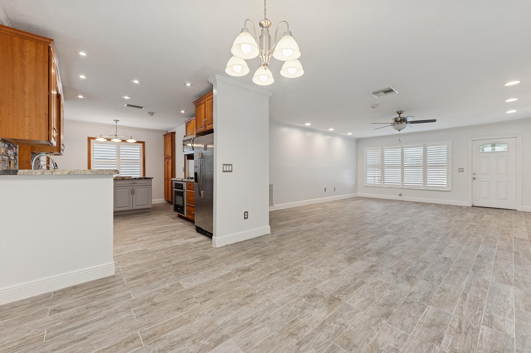 Welcome to this 3 bedroom, 2 bath single family ranch home in desirable Boca Raton. This move-in ready home features a stack bedroom layout and open floor plan with gray wood-look tile flooring throughout. White plantation shutters and impact windows provide peace of mind. The kitchen has granite countertops and SS appliances with a one car garage and circular driveway that provides ample parking. Both bathrooms have been remodeled with walk-in showers. Recent upgrades include 2018 roof, 2021 A/C, 2022 solar panels, 2022 fence, and brand new interior paint. Step outside to a private backyard with a screened in patio and automated awning for additional shade and low-maintenance turf grass backing a canal, while the front yard features natural grass for curb appeal. A large side yard offersflexibility for storing a trailer, small boat, or Sea-Doo. Located within A-rated school districts for elementary, middle, and high school. Conveniently located near shopping, dining, and parks.