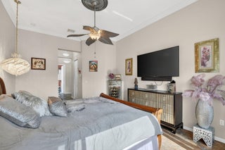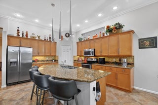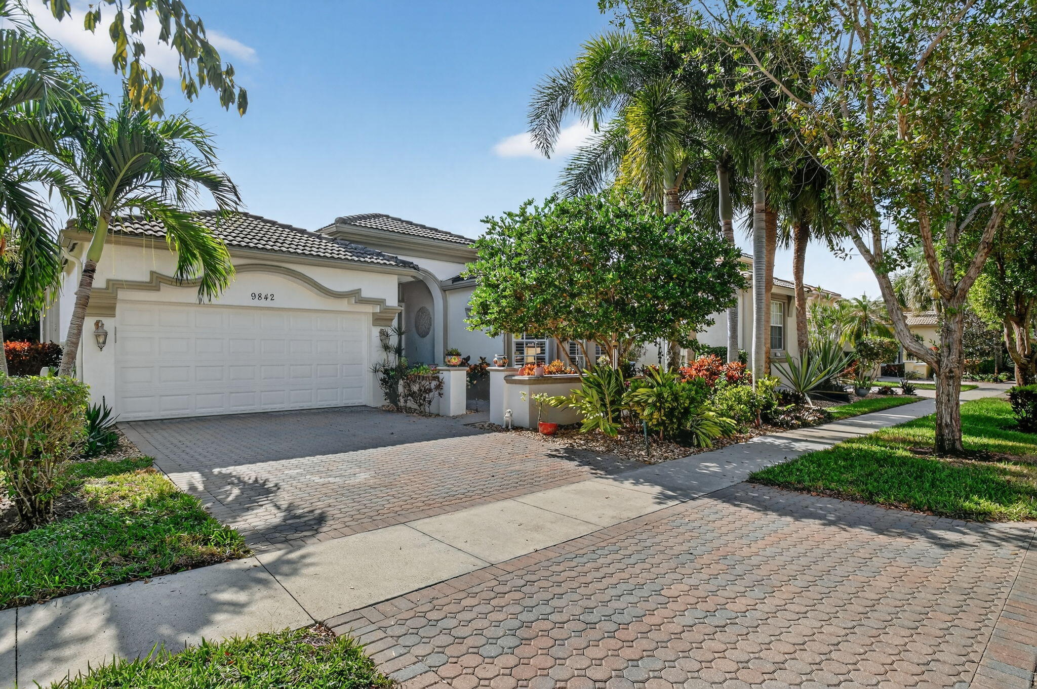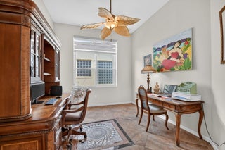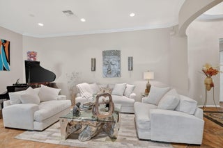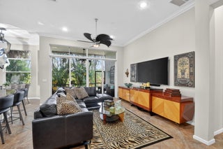 An elevated and tastefully designed home is now available in Buena Vida, Wellington's only single family 55 Plus resort style community. This beautifully appointed residence offers 2 bedrooms, 2.5 baths, a den or office, a screened covered patio, and a two car garage, all set on a private water and preserve lot.The spacious 2,365 square foot living area showcases curated, elegant finishes throughout. A welcoming foyer features 12 foot coffered ceilings and a decorative mosaic inlaid tile entry with geometric and circular motifs, which is echoed at the den or office entry. Ceramic flooring flows seamlessly throughout the home, enhancing its open and cohesive design.This model offers multiple areas for entertaining, including formal living and dining spaces, as well as an open -family room and kitchen layout. Artisan inspired tile accents add character and visual interest in the formal dining area, primary bath, second bath, and guest half bath. The chef's kitchen is designed for both function and style, featuring a spacious island, newer stainless steel appliances, granite countertops, tiled backsplash, wood cabinetry, a walk in pantry, and a sunny breakfast area. The primary suite offers a sophisticated and serene retreat with a sitting area, double closets with custom built ins, and a well appointed ensuite bath with soaking tub, double vanities, and a tiled glass enclosed shower. A versatile second bedroom with ensuite bath is located at the front of the home and can easily serve as a second primary suite. Plantation shutters and thoughtful design details create another peaceful private space. The covered and screened patio overlooks lush landscaping, providing a secluded setting ideal for quiet mornings or relaxing afternoons. Additional highlights include $20K in high end light fixtures and finishes throughout, stunning window treatments, a water filtration system added in 2022 ,5 ton air conditioning system installed in 2023, and accordion shutters for storm protection in 2016. Buena Vida offers resort style amenities including two pools and spa, poolside cabanas, a fitness center, steam room, card rooms, library, grand ballroom, and an outstanding sports complex with pickleball and tennis. The HOA includes landscape maintenance, lake water irrigation for your lot, power washing of driveways and walkways, Xfinity cable and internet up to 500 Mbps, a 24 hour manned gate, and an annual 500 dollar café dining allowance. The location is exceptional, just 15 minutes to Palm Beach International Airport, approximately 9 miles to the beaches, and about 20 minutes to the Polo Grounds and Winter Equestrian Festival. Buena Vida is ideally situated to enjoy South Florida living, from dining and boutique shopping to cultural attractions. Experience the good life at Buena Vida in Palm Beach County.