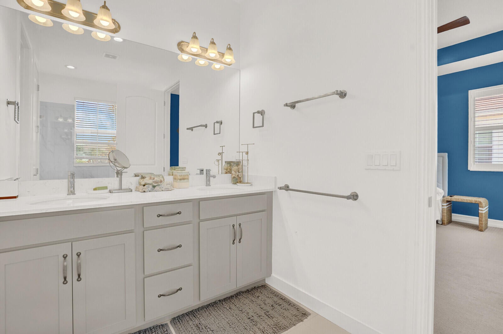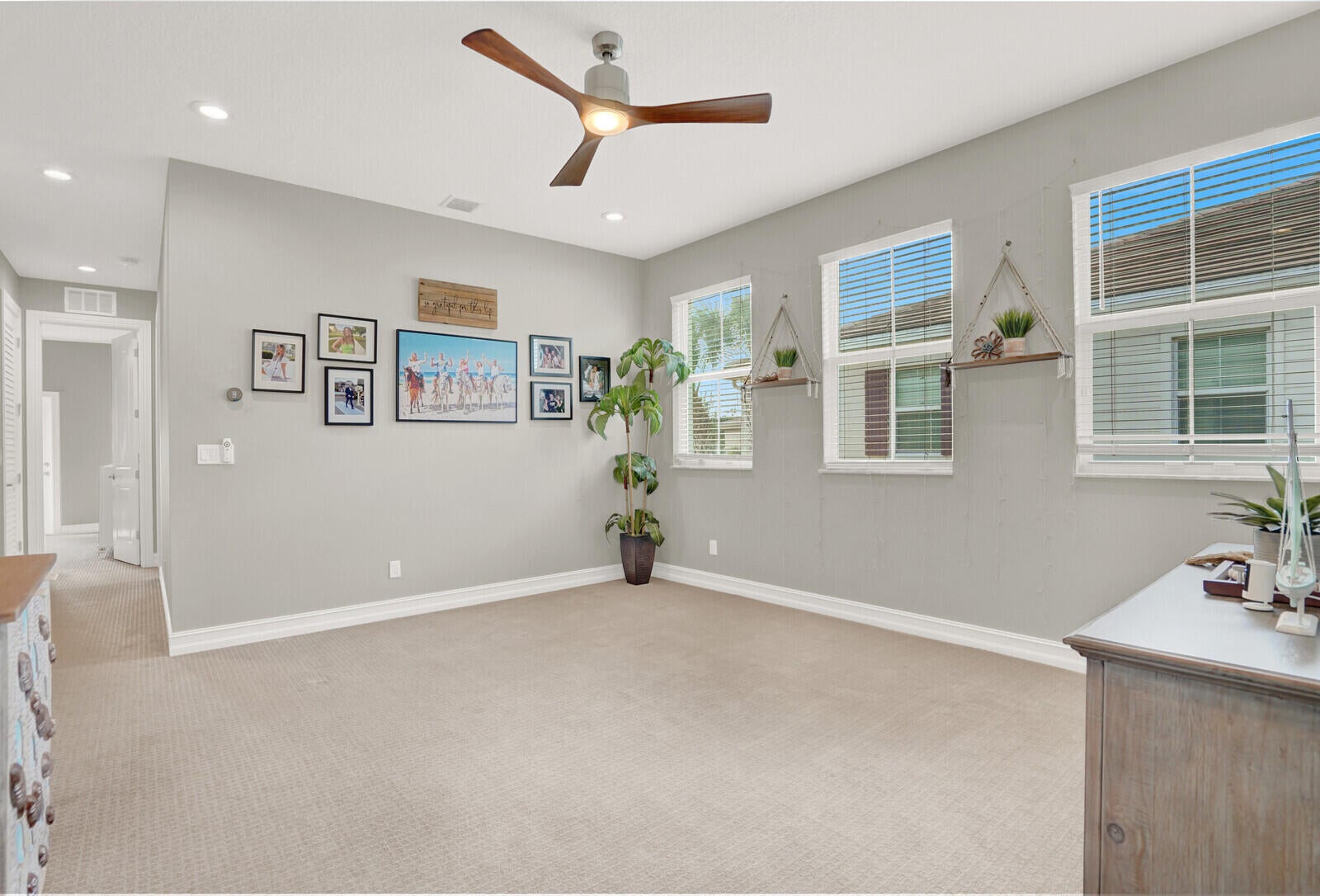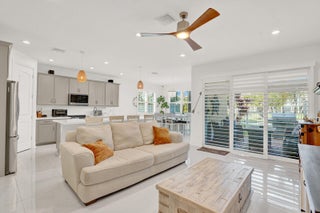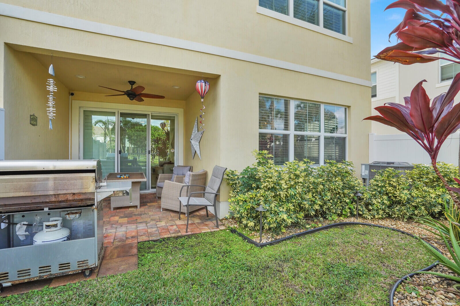 This ultra modern 2019 townhome offers 3 bedrooms, 3 full baths, a den, loft, and an oversized 2 car garage. Step through the new impact glass front door into a bright, open concept living space featuring high ceilings, 24'' white porcelain tile flooring, newer interior paint, and a stunning white quartz kitchen island. The kitchen is equipped with all new LG smart appliances and a convenient smart hub for connected living. The gorgeous primary suite includes a tray ceiling, a spa inspired bath with a frameless open shower, and a dual sink vanity.Additional highlights include an upstairs laundry room, plantation shutters, full impact windows, recessed lighting, and a Nest thermostat for energy efficient comfort. Enjoy exceptional outdoor living with pavers, lush landscaping, and fencing that creates a beautifully private retreat. Just a short walk through a large park area brings you to the community clubhouse with a pool and fitness room overlooking the lake. Ideally located near Wellington equestrian venues, Publix, Palm West Hospital, Palm Beach State College, shopping, and the airport.