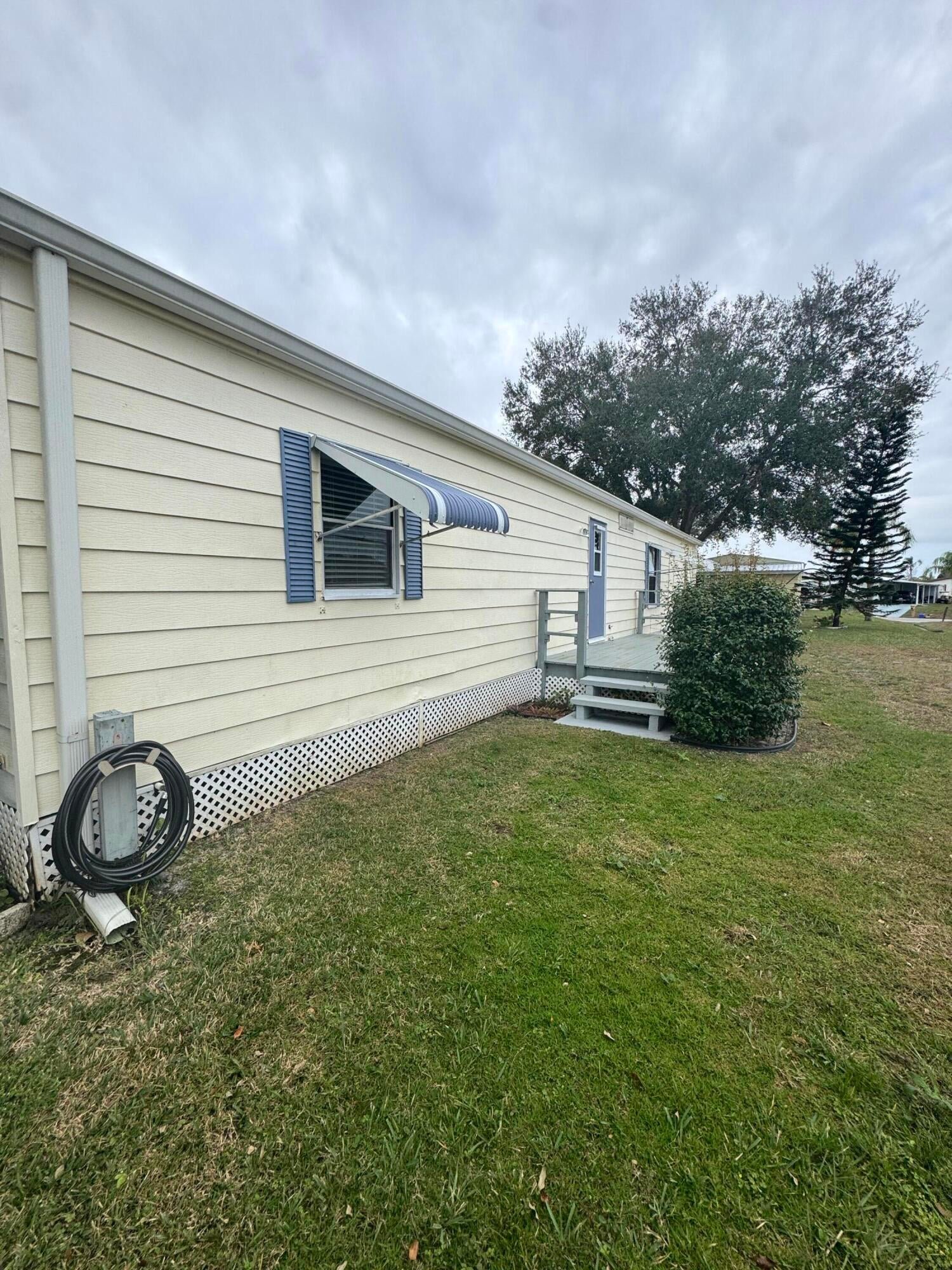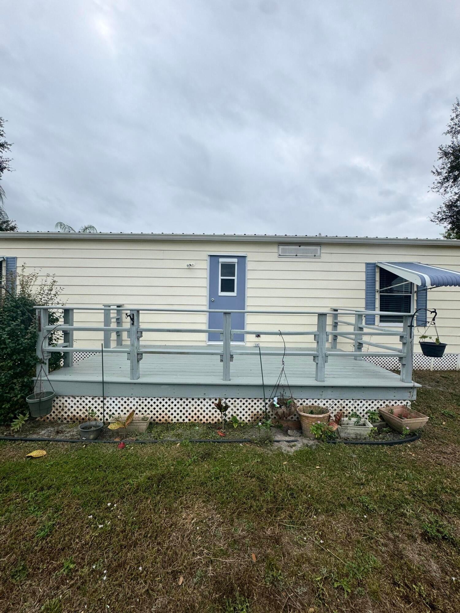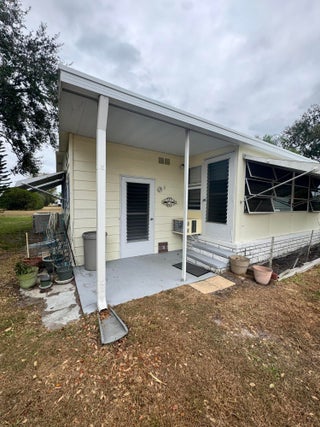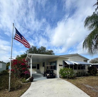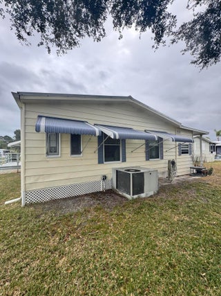 Lovely 2-bedroom 2-bath home in the desirable Spanish Lakes Country Club Village 55+ community. Home sits on a quiet cul-de-sac. The home has a lovely screened-in Florida room, perfect for morning coffee or evening cocktails. Home as a living room and family room. Open kitchen with an Island and desk area. The laundry room is inside the home, with a patio on the side. The dining and living room have built-in shelves for added storage. The roof is a 2020 metal. Shed in the rear of the home. Monthly Land Lease fee covers Private golf course, 2 pools, pickleball, tennis, shuffleboard, bocce, gym, library, cards, Mah jong, bible study, wood workshop, golf cart parades, dinners, dances, trips, and so much more! Grass cutting is also included, as is trash removal. MUST SEE!