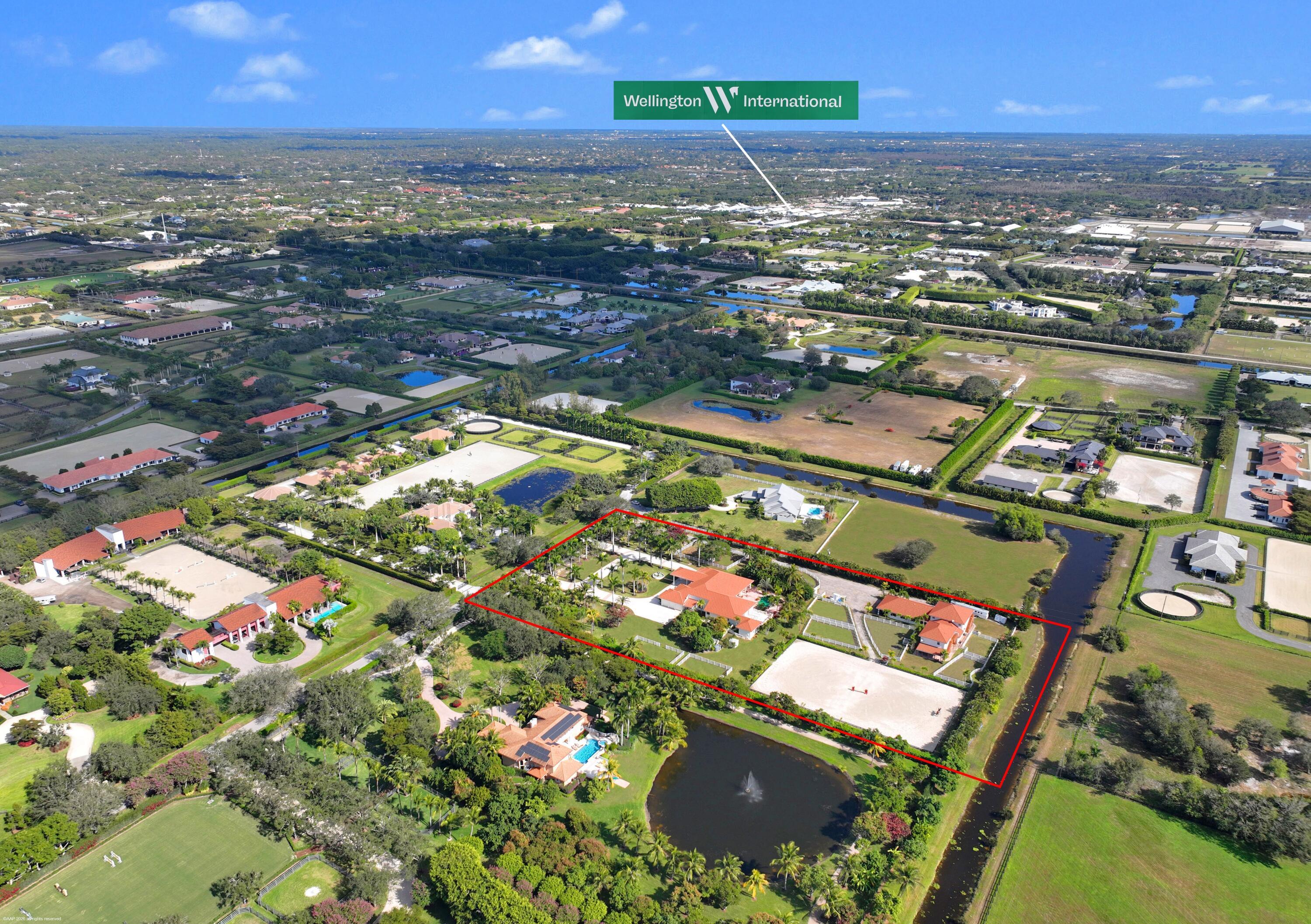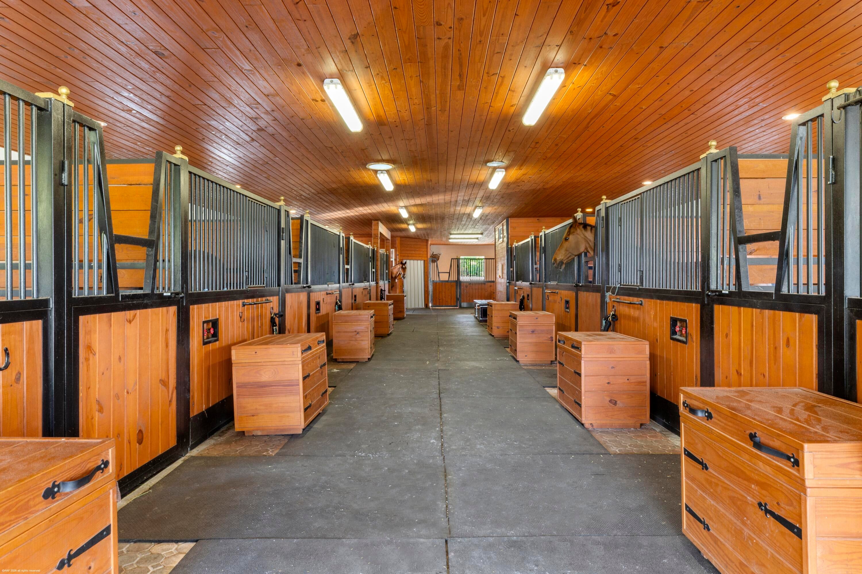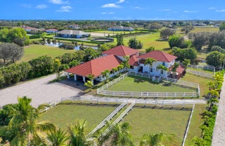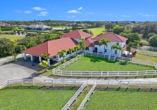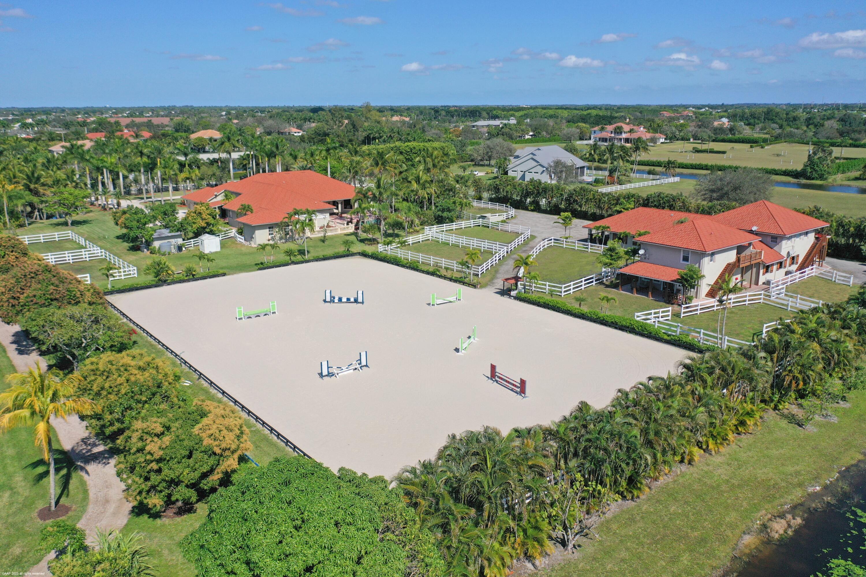 Situated on 5 acres within the gates of Palm Beach Point, this private end of street location with stunning landscape offers a rare combination of residential comfort & professional training facilities. This 4Br estate homes with an office features spacious entertaining areas, a detached cabana studio with full bath & 3-car garage. The income producing equestrian amenities include a 13-stall stable built in 2014 with 2 wash racks, 9 paddocks, and a 125' x 200' riding arena. Three apartments, totaling 7 bedrooms, provide next level accommodations for staff. Additional features include: new impact windows & doors, 50 year metal roof, covered treadmill area, RO water treatment system and ringside covered-patio viewing area. This meticulously maintained home is a great canvas to make your ownPRIMARY RESIDENCE: 4 Bedrooms in main residence, plus a detached poolside 330 sq. ft. studio apt. with full bath. Cabana bathroom with shower 2024 All new impact windows & doors New Roof in 2006 - 50-year metal with tile look (house, barn & apartments). Mahogany built-ins Central vacuum 3 Car garage with mini-split A/C 4 A/C units/zones: 1) primary bedroom, 2) 3 guest rooms, 3) Kitchen & family 4) office, dining room, formal living. KITCHEN: Mahogany cabinets Glass cooktop Prep sink Wall oven Microwave/convection combo Kitchen Aid warming drawer Two dishwashers Trash Compactor Walk-in Pantry FAMILY ROOM: Cedar built-in Wet-bar with sink, wine cooler & ice maker ATTACHED STUDIO: Kitchenette with new cooktop 1 full bathroom with tub New vinyl flooring Generator hook up: runs the essentials: 1 A/C and Refrigerator. POOL & PATIO: Waterfall, chlorine, plumbed for heater. Propane tank for gas pool heater BBQ & bar area: with exhaust hood & sink New pool pump 2021 Separate pump for front entry fountain The Stables: Built in 2014 12 - 12' X 12 Stalls 1 - 15' X 12' Stall Water to each stall Hurricane Roll Down Doors Laundry, Feed, Tack & Storage Rooms 1/2 Bath in stable Covered Treadmill Area 3 APARTMENTS: 1 Studio Apartment or Lounge - Ground Level - 559 sq. ft. 4 Bedrooms / 3 Bathrooms - 1,426 sq. ft. 2 Bedroom with Jack & Jill bath - 700 sq. ft. Total square feet of barn apartments: 2,685 sq. ft. Irrigation source is from the canal with a separate arena pump from canal. Kinetico RO Water Treatment System: supplies the house & barn - replaced approx. 2017/2018.