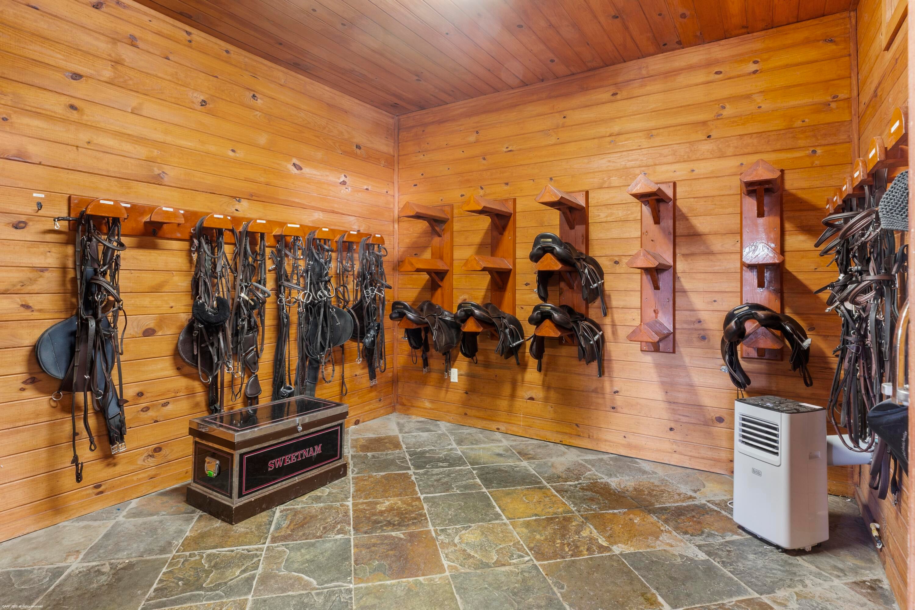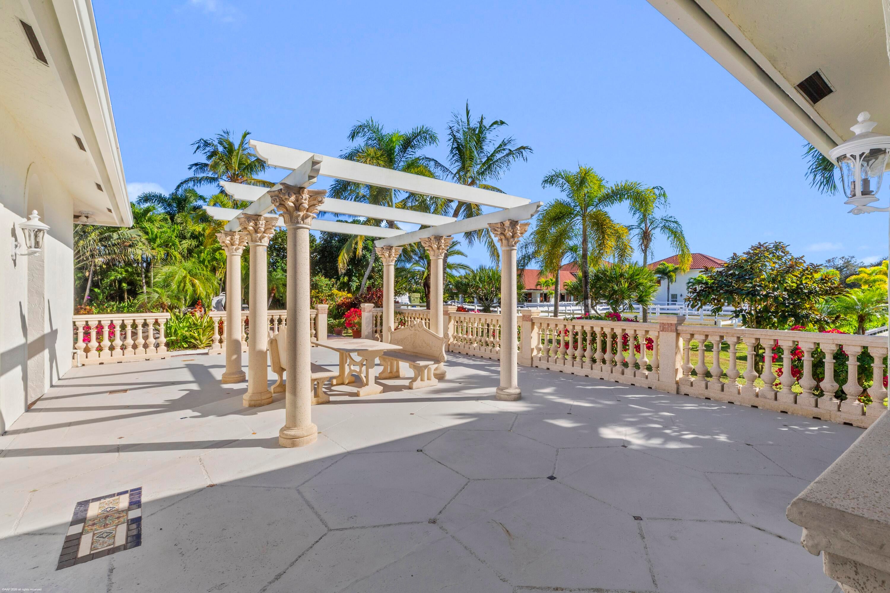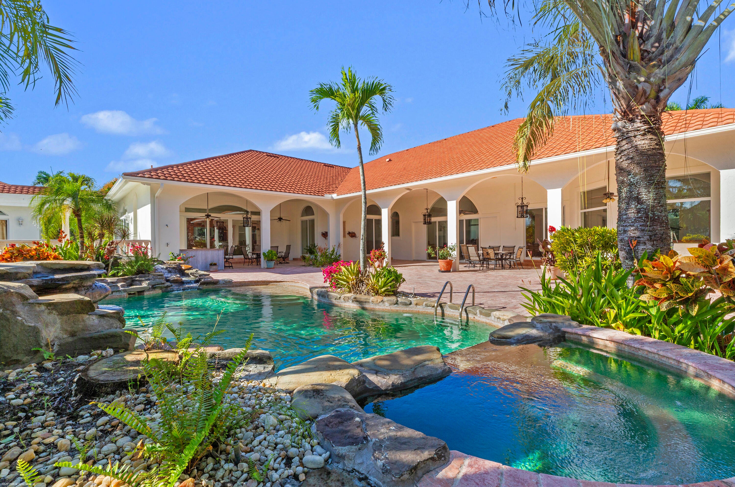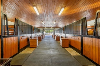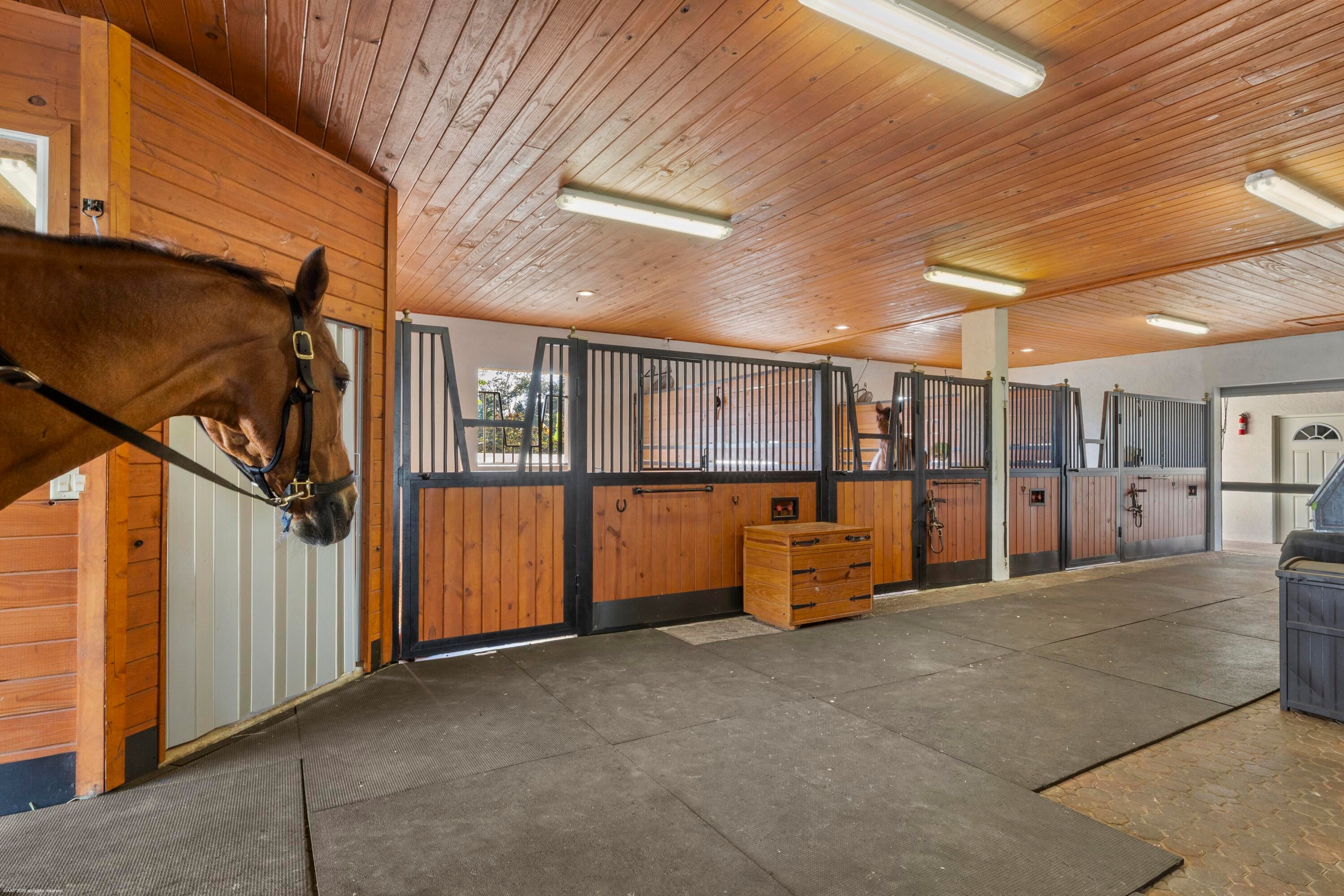 Situated on 5 acres within the gates of Palm Beach Point, this private end of street location with stunning landscape offers a rare combination of residential comfort & professional training facilities. This 4Br estate homes with an office features spacious entertaining areas, a detached cabana studio with full bath & 3-car garage. The income producing equestrian amenities include a 13-stall stable built in 2014 with 2 wash racks, 9 paddocks, and a 125' x 200' riding arena. Three apartments, totaling 7 bedrooms, provide next level accommodations for staff. Additional features include: new impact windows & doors, 50 year metal roof, covered treadmill area, RO water treatment system and ringside covered-patio viewing area. This meticulously maintained home is a great canvas to make your ownPRIMARY RESIDENCE: 4 Bedrooms in main residence, plus a detached poolside 330 sq. ft. studio apt. with full bath. Cabana bathroom with shower 2024 All new impact windows & doors New Roof in 2006 - 50-year metal with tile look (house, barn & apartments). Mahogany built-ins Central vacuum 3 Car garage with mini-split A/C 4 A/C units/zones: 1) primary bedroom, 2) 3 guest rooms, 3) Kitchen & family 4) office, dining room, formal living. KITCHEN: Mahogany cabinets Glass cooktop Prep sink Wall oven Microwave/convection combo Kitchen Aid warming drawer Two dishwashers Trash Compactor Walk-in Pantry FAMILY ROOM: Cedar built-in Wet-bar with sink, wine cooler & ice maker ATTACHED STUDIO: Kitchenette with new cooktop 1 full bathroom with tub New vinyl flooring Generator hook up: runs the essentials: 1 A/C and Refrigerator. POOL & PATIO: Waterfall, chlorine, plumbed for heater. Propane tank for gas pool heater BBQ & bar area: with exhaust hood & sink New pool pump 2021 Separate pump for front entry fountain The Stables: Built in 2014 12 - 12' X 12 Stalls 1 - 15' X 12' Stall Water to each stall Hurricane Roll Down Doors Laundry, Feed, Tack & Storage Rooms 1/2 Bath in stable Covered Treadmill Area 3 APARTMENTS: 1 Studio Apartment or Lounge - Ground Level - 559 sq. ft. 4 Bedrooms / 3 Bathrooms - 1,426 sq. ft. 2 Bedroom with Jack & Jill bath - 700 sq. ft. Total square feet of barn apartments: 2,685 sq. ft. Irrigation source is from the canal with a separate arena pump from canal. Kinetico RO Water Treatment System: supplies the house & barn - replaced approx. 2017/2018.
