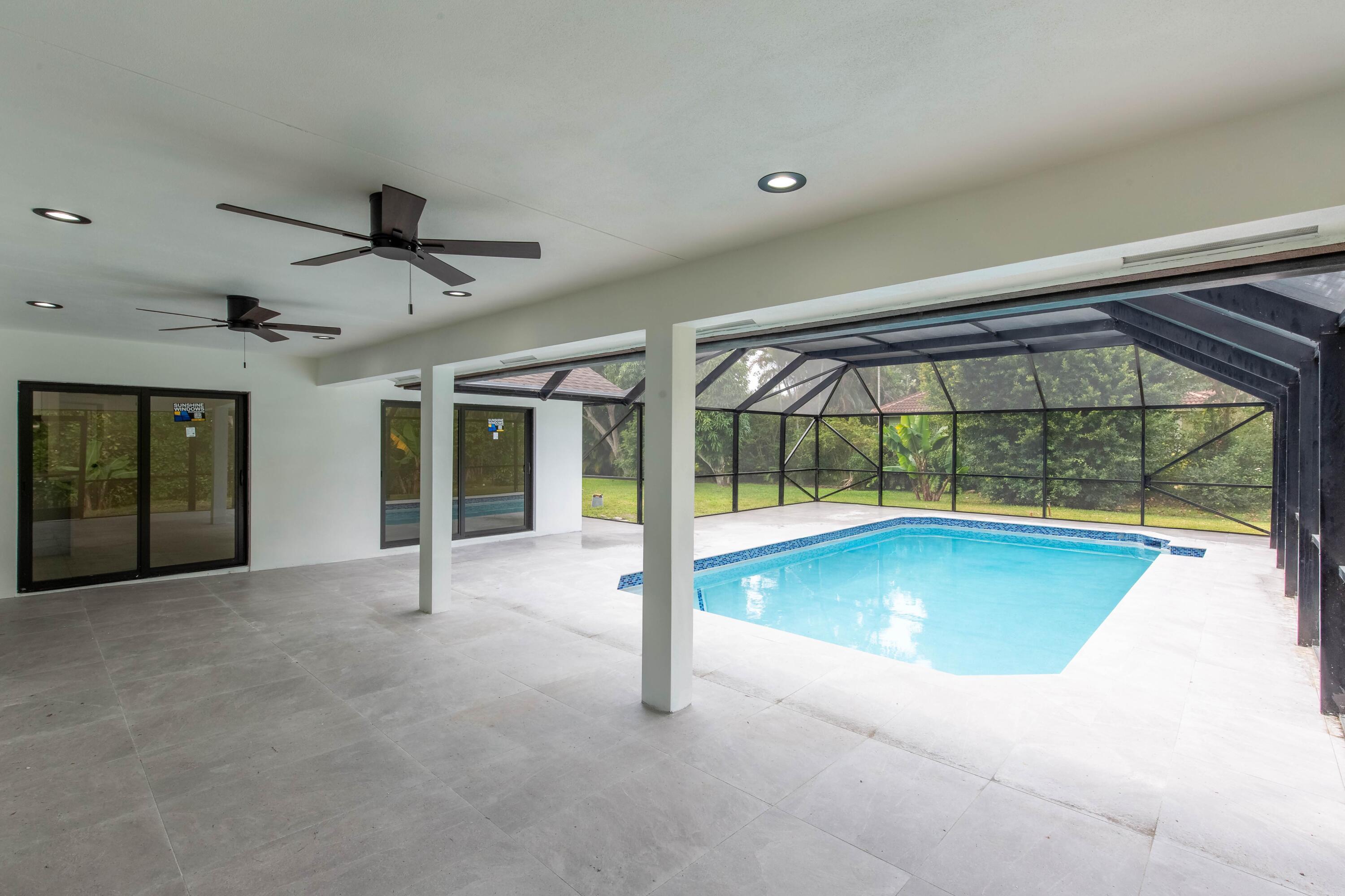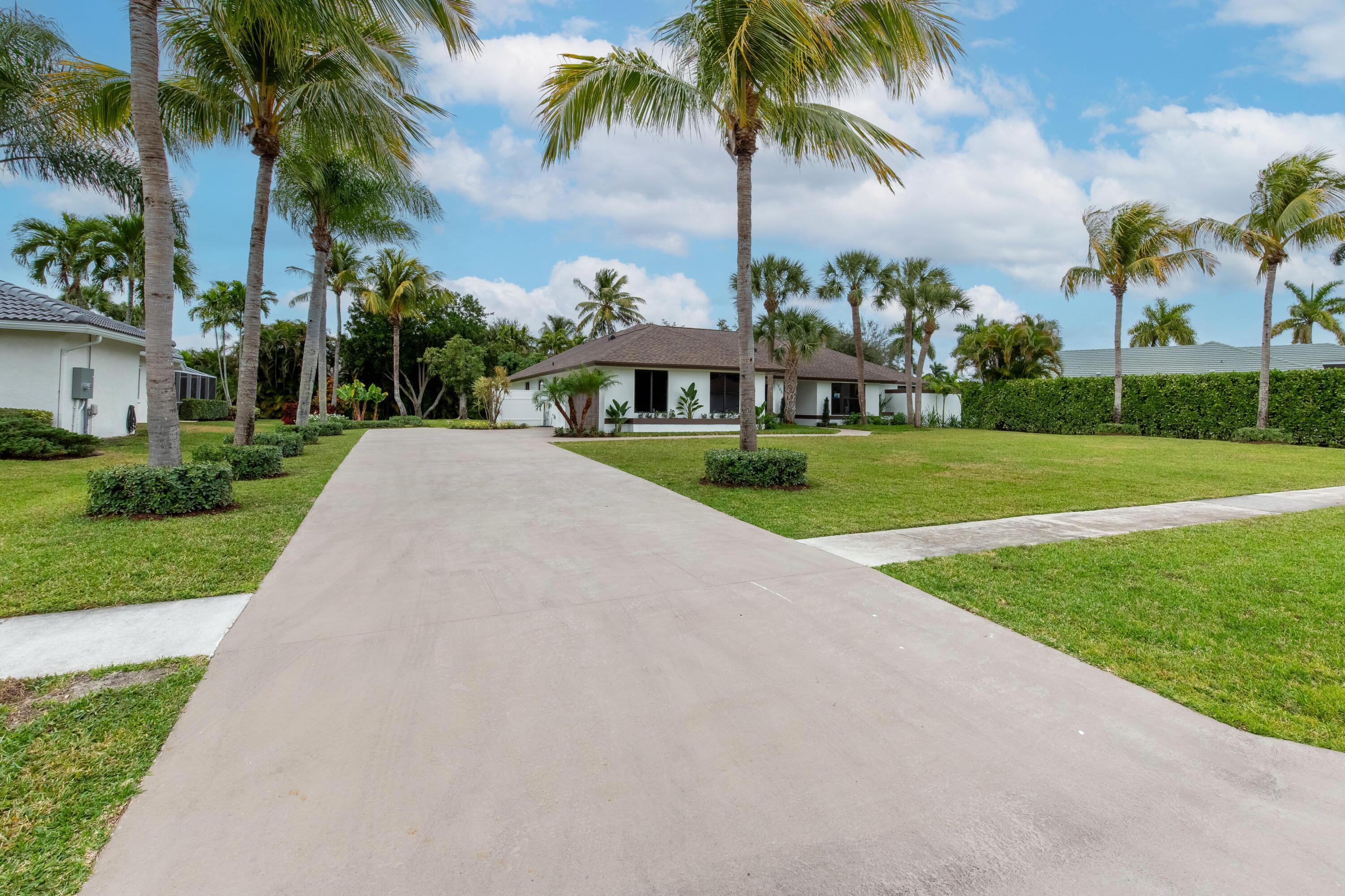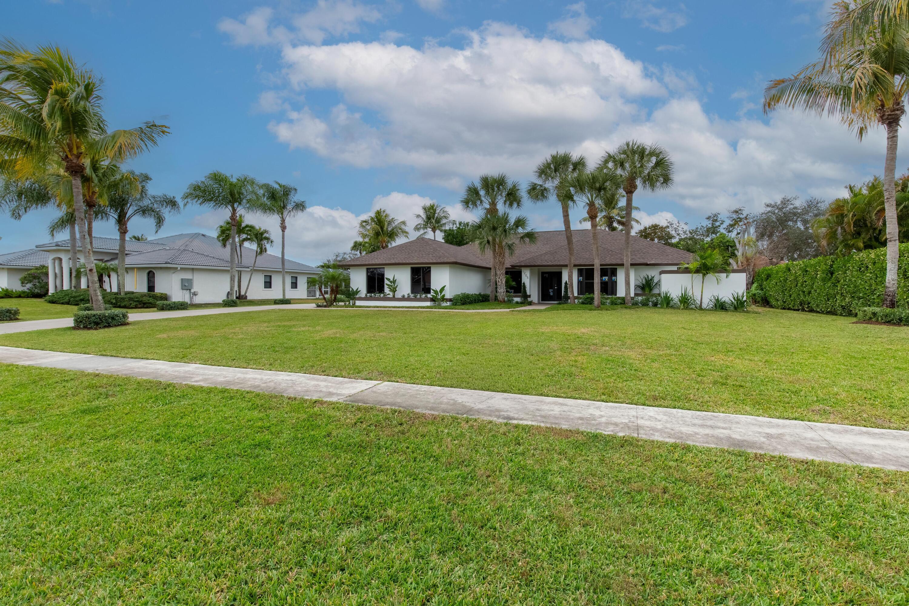 Modern luxury in the heart of Wellington. Large 1/2 acre lot with plenty of beautiful palm trees. Completely rebuilt in 2025 with new roof, new impact windows and doors, new designer kitchen & bathrooms. Screened in swimming pool with new diamond brite & outdoor shower as well as custom stone pool deck. Large covered loggia with room for outdoor kitchen. Built in closets throughout. All new appliances including laundry set. Modern landscaping provides great curb appeal. Must see!