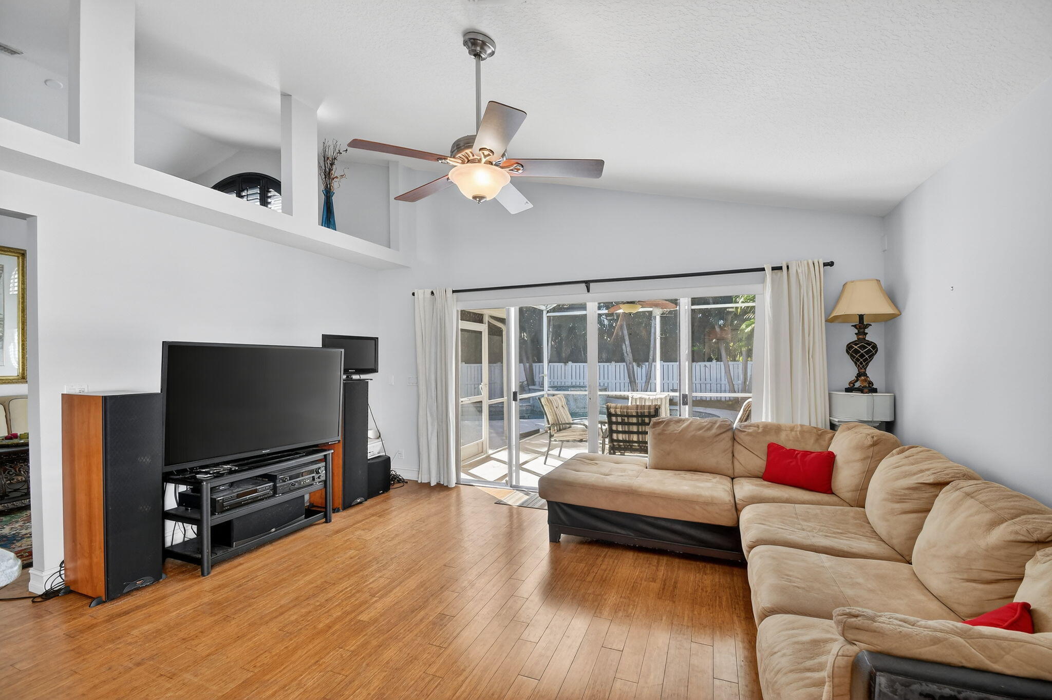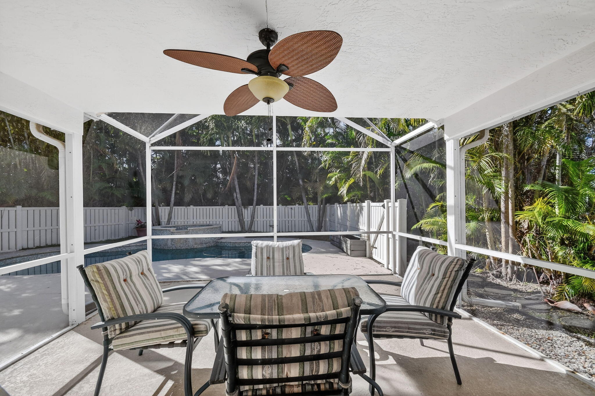 Located in a beautiful gated community with mature trees, this light-filled 3BR, 2BA home offers an open, airy layout designed for comfortable Florida living. Bamboo wood floors flow through the expansive great room, while the spacious kitchen and generous bedrooms provide room to live and grow. The primary suite features dual walk-in closets. Step outside to a screened patio and private backyard with pool, perfect for relaxing or entertaining. With 2,544 total sq ft and a thoughtful layout, this home is conveniently located near shopping, dining, parks, and major roadways.