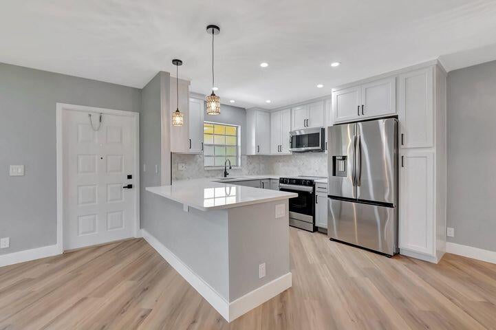 Step into this beautifully renovated condo and enjoy worry-free living in a vibrant and active 55 plus community. This light-filled villa features two bedrooms, two bathrooms, and a spacious Florida room that can be used as an extra living space. The unit also features brand new flooring, fresh paint and new recessed lighting. The popcorn ceilings have also been removed. You'll enjoy peace of mind with a brand-new A/C unit, hot water heater and updated electrical panel. The kitchen has been totally updated with all-new appliances, cabinetry, Quartz countertops and tile backsplash. Both bathrooms have been completely renovated with fresh finishes. The monthly maintenance fee covers water, basic cable, lawn and shrub care, exterior pest control, trash removal and insurance on the buildingexterior. It also includes contributions to reserves, ensuring the community stays well-maintained. Recent updates include a newer roof (2021) and fresh exterior paint (May 2025) and within the community, a newly renovated, heated, saltwater pool and clubhouse, perfect for year-round enjoyment. Residents have access to an array of activities, including pickleball, shuffleboard, tennis, bocce ball, a game room and fitness center. Note: Rentals are not permitted for the first two years of ownership. The location couldn't be better - right across the street from the post office and The Boys Farmers Market and right down the street from shopping, dining, and more. Nestled between I-95 and the Turnpike and only 5 or 6 miles from downtown Delray and the ocean. Don't miss this opportunity to enjoy easy living in a move-in ready home within a well-maintained community.
