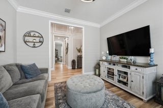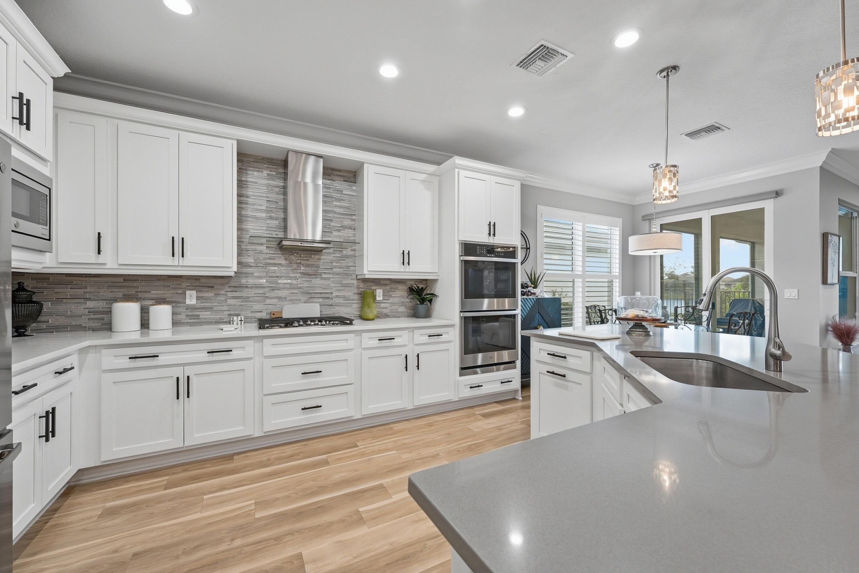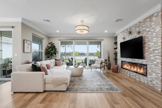 Welcome to Riverland at Valencia Cay!This stunning Bimini model is situated on an oversized pond-view lot and offers over $120,000 in premium upgrades throughout. The home features some plantation shutters, custom molding, and luxury vinyl flooring complemented by custom lighting. The gourmet kitchen is a chef's dream with a statement hood, double wall ovens, and upgraded cabinetry.Additional highlights include custom closet cabinetry, a stained-glass front door, remote-controlled shades, and a beautifully designed custom stone accent wall with fireplace and shelving, perfect for entertaining or relaxing.Why wait to build when you can own this exceptional home now?Schedule your private showing today and experience everything this remarkable property has to offer.