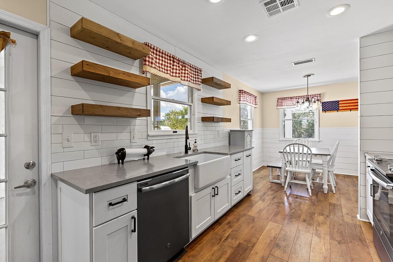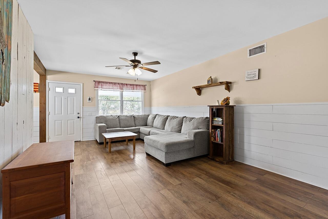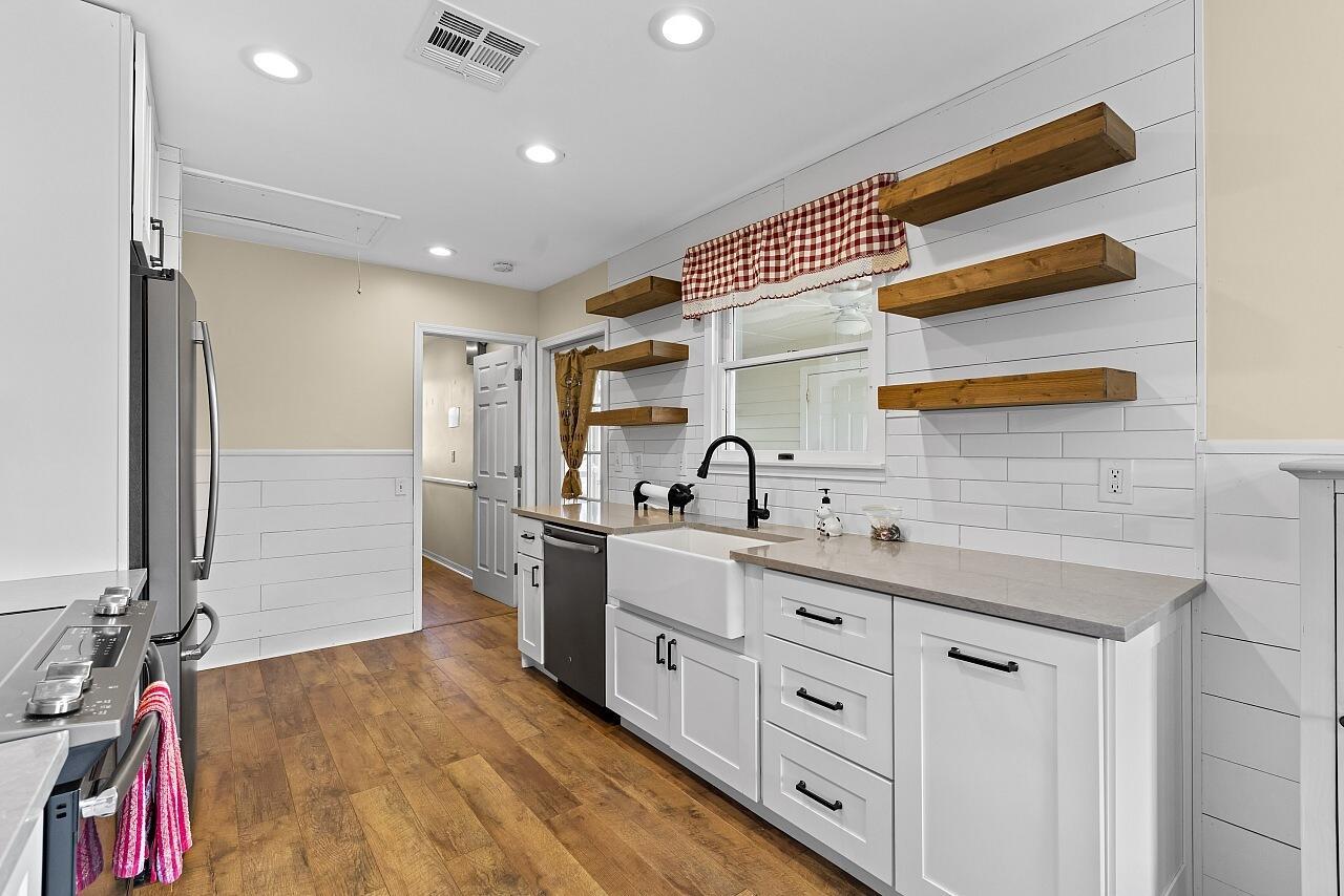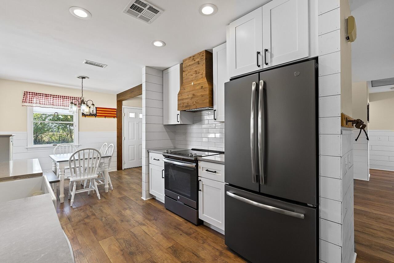 Charming farmhouse style ranch on a 1.32 acre lot. Zoned AG-1, designed for relaxed country living. This 3-bed, 2-bath home offers a 2-car garage, abundant parking & wide open space. Equestrian ready with 3 horse stalls & storage room. Enjoy peace of mind with a 2023 AC & a new roof in process. The upgraded kitchen features white cabinets, custom vent hood, gray quartz counters, slate GE stainless appliance package, backsplash & floating shelves. Inviting living space w/ shiplap accents, adding warmth and character. A rare blend of modern updates & rural charm.