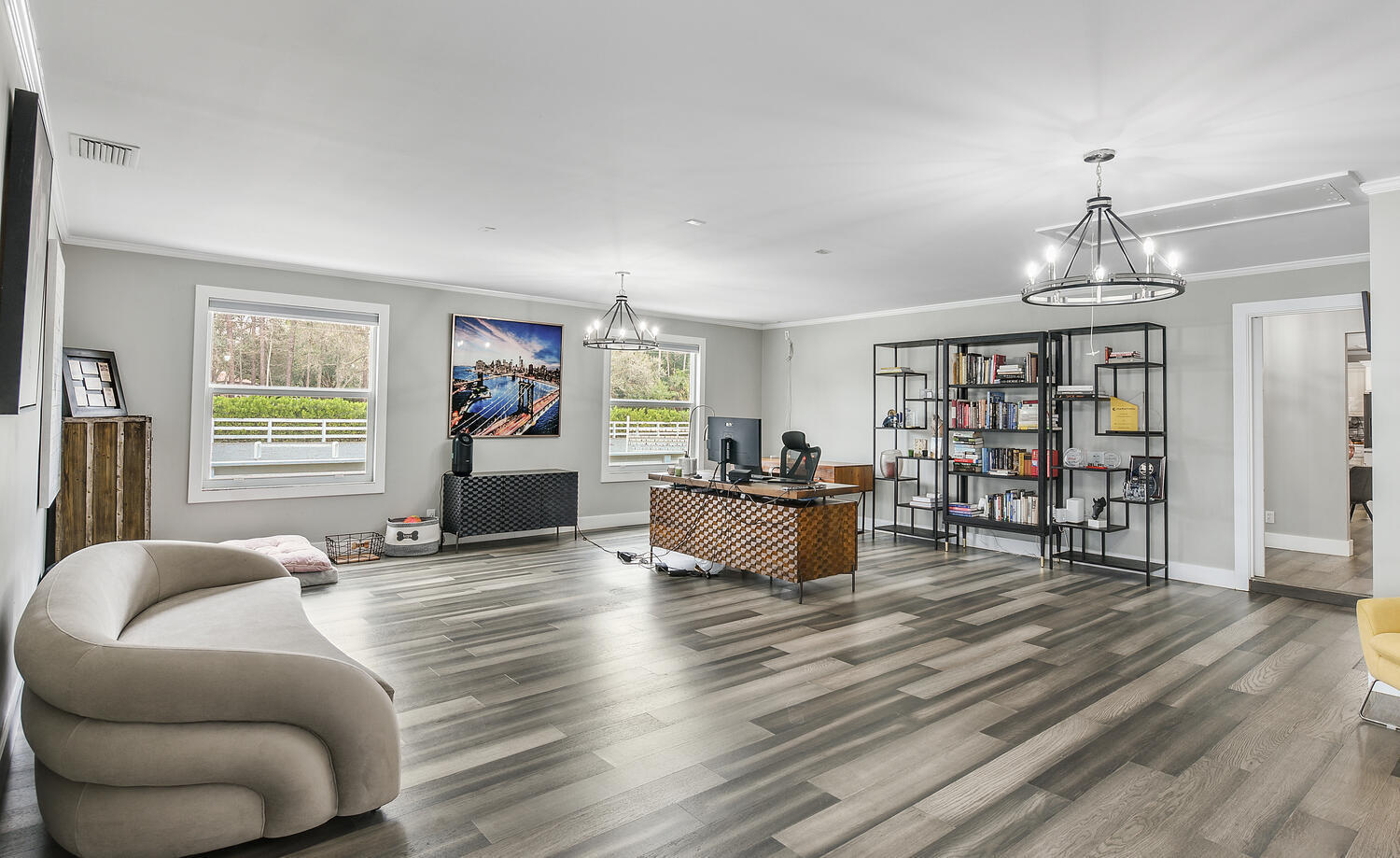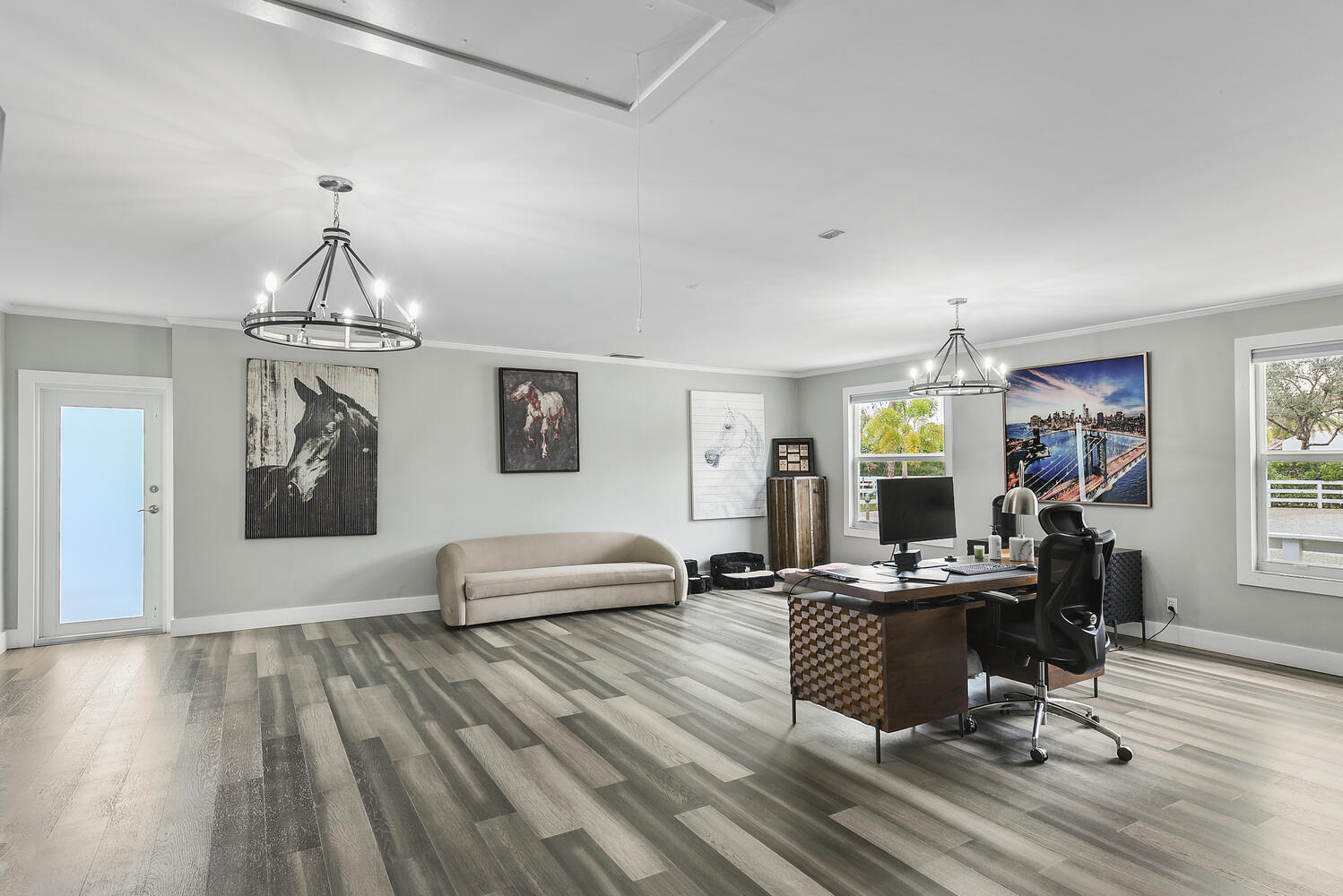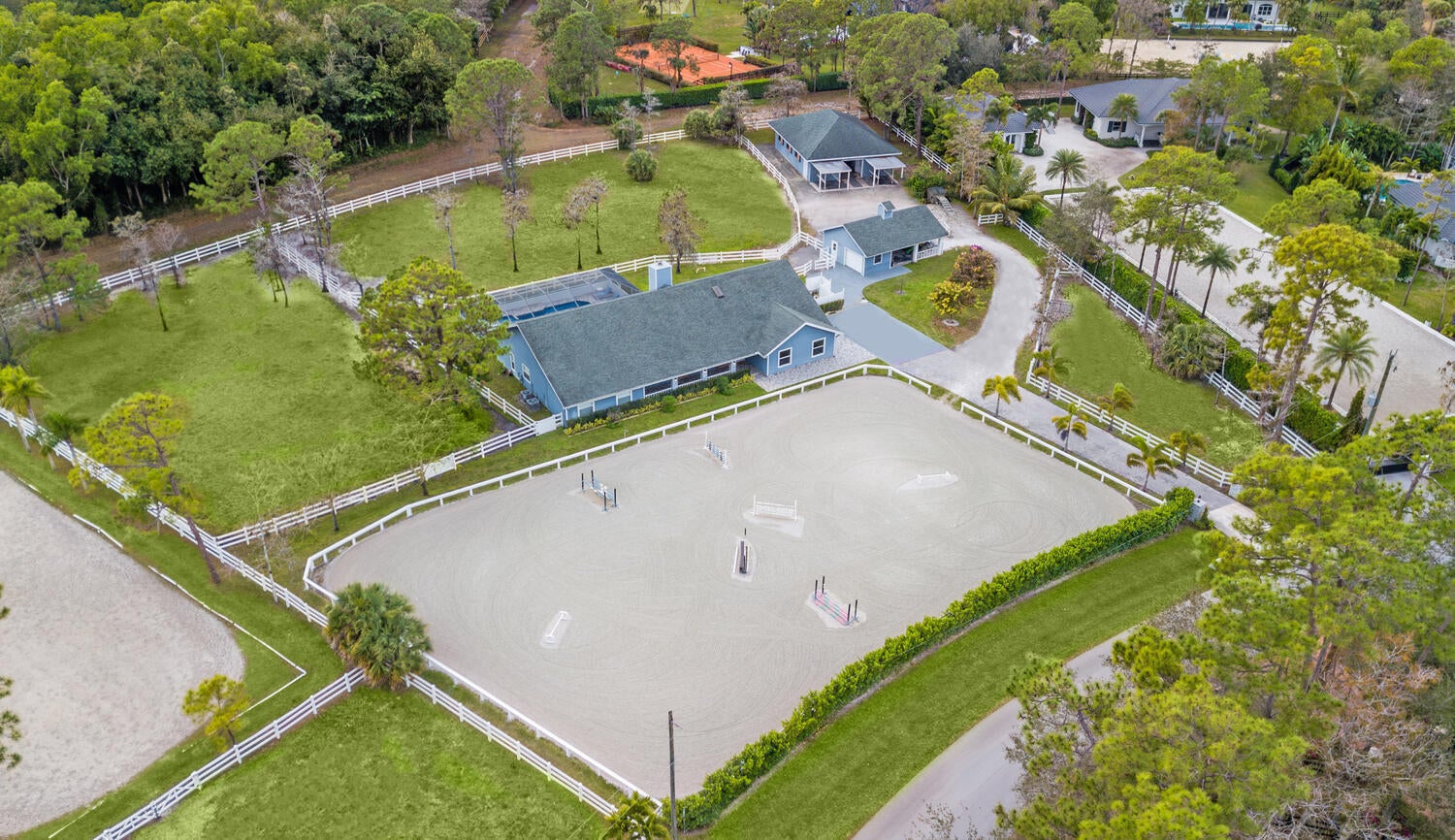 A RARE OPPORTUNITY! Situated on 2.35 tranquil acres, this equestrian gem in Paddock Park is ready to be your very own private oasis. The modern farmhouse boasts 2 kitchens, 5 bedrooms, 3 bathrooms, and a massive office/ flex room. Upgrades include full impact windows and doors, whole house generator, remodeled kitchen and primary suite, reverse ionization water system, new A/C units, heated saltwater pool and spa, and a brand new summer kitchen. The 6 stall CBS barn is nicely equipped with a fly spray system, feed room, tack room, individual fans, wash racks, and rubber mats throughout. The 2 stall shed row with attached garage and overhang provide ample storage for all farm equipment. Massive paddocks and fabulous GGT arena make for a horses dream facility.