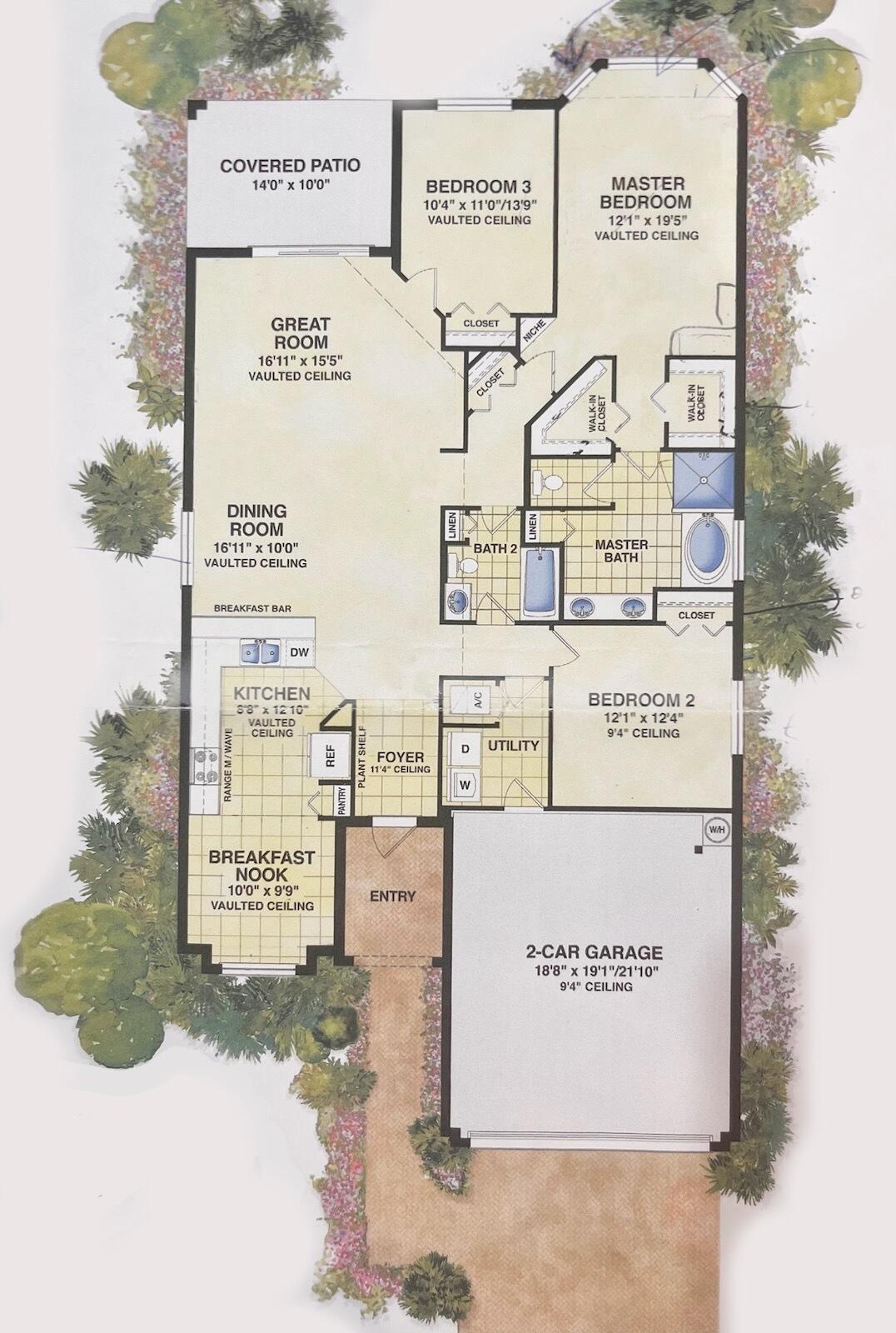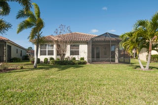 Experience the tranquility of Vero Lago with this beautiful home offering serene lake views from a spacious, covered, and extended screen-enclosed patio. This residence features three bedrooms, two bathrooms, and a two-car garage. The interior boasts cathedral ceilings, a modern kitchen with white cabinets, granite countertops, stainless steel appliances, and tile flooring throughout.Community Amenities: Gated community for enhanced security, Clubhouse, Heated pool, Fitness center, Tennis courts, Pickleball courts, Playground Location Benefits: Conveniently located near a variety of shops, restaurants, and pristine beaches, this Vero Lago home combines peaceful living with easy access to local attractions.Vero Beach Regional Airport is 6 miles away offering flights to & from multiple destinations. Room sizes are Approximate and must be verified.