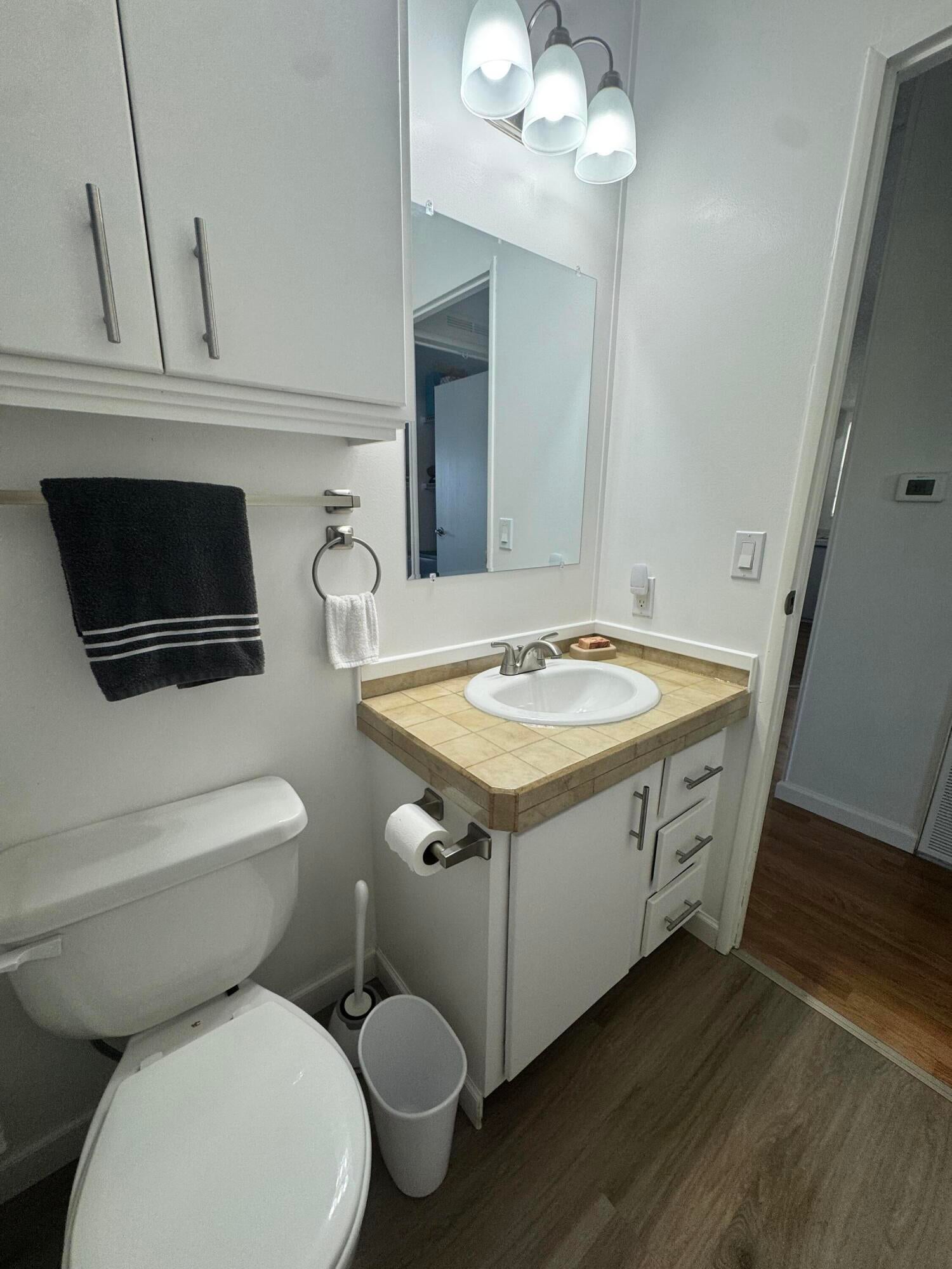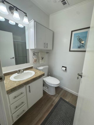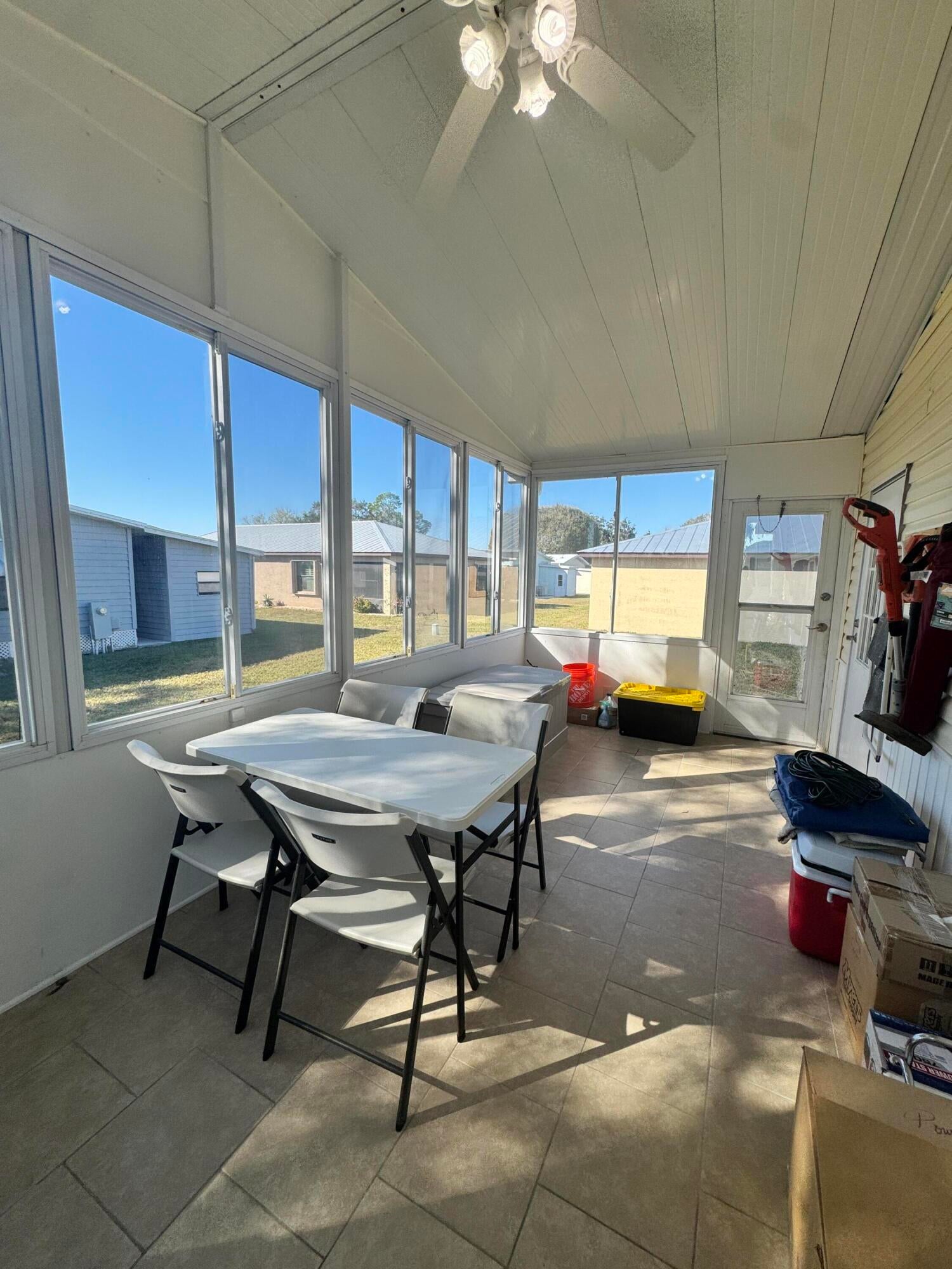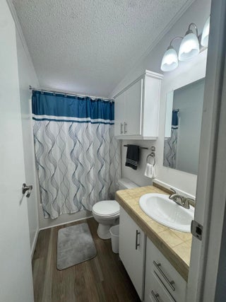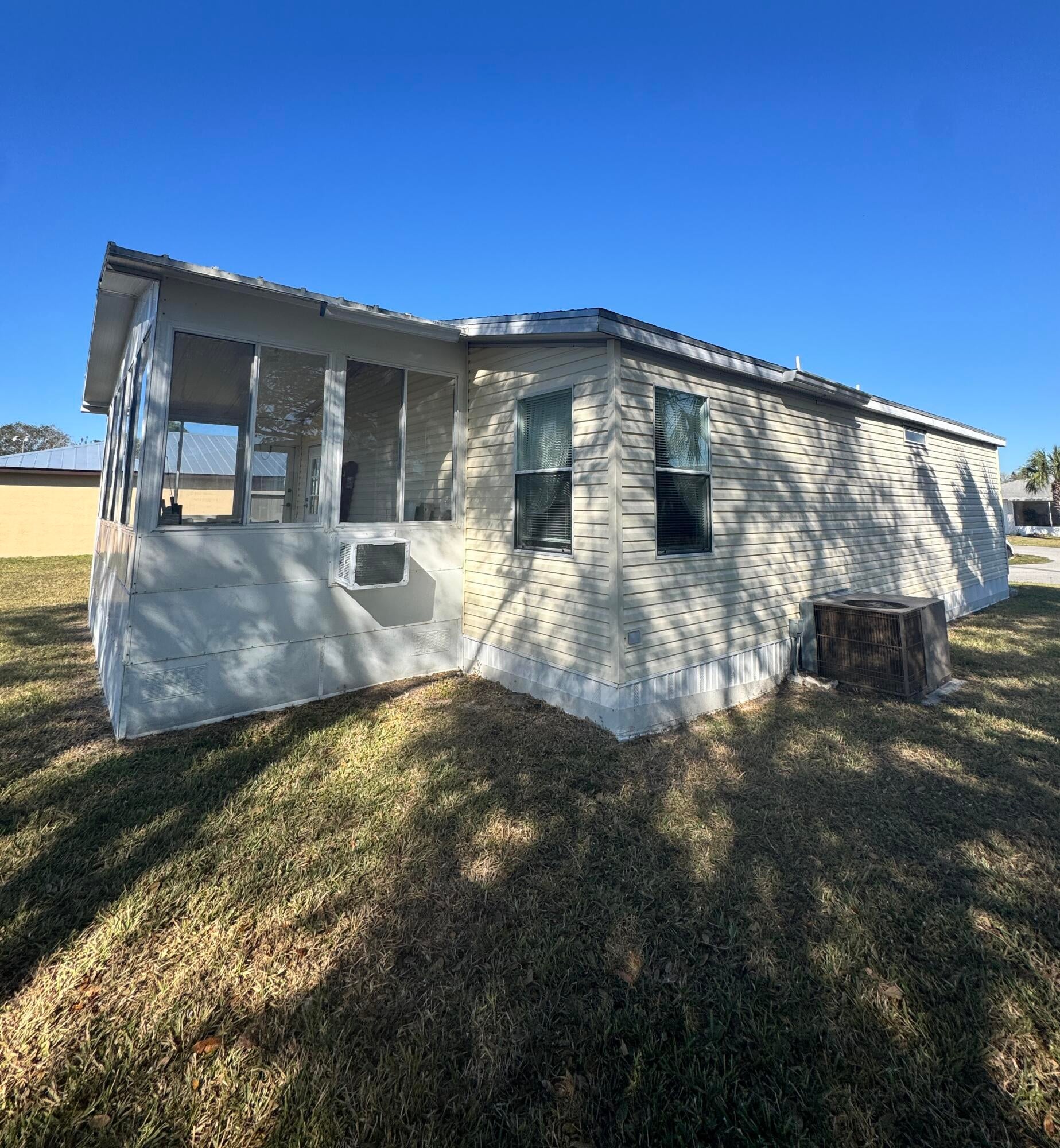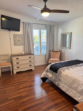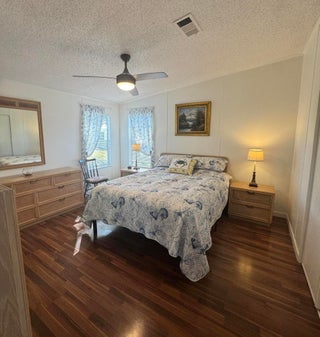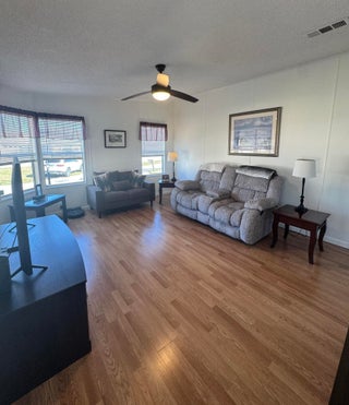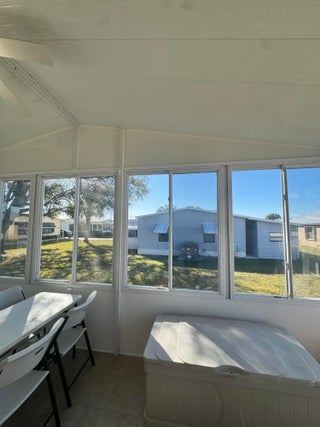 Well-maintained 2-bedroom 2-bath home in the desirable 55+ Spanish Lakes Fairways community. This home is on a street right across from the community center. Close to the entrance of the park and sits on a very quiet cul-de-sac. Home has no carpet; laminate floors throughout. The kitchen has a desk area and a pantry for extra storage. The kitchen boasts new appliances. The washer and dryer are inside the home. The patio off the back of the home has ceramic tile and windows that close. Air conditioning in the patio. The roof is 2018, the A/C has been maintained, and the plumbing has been updated. Home is being sold furnished. Lawn care and trash removal included in lot rent. 2 pools, tennis, pickleball, bocceball, shuffleboard. clubhouse, 18-hole golf course, and much more.