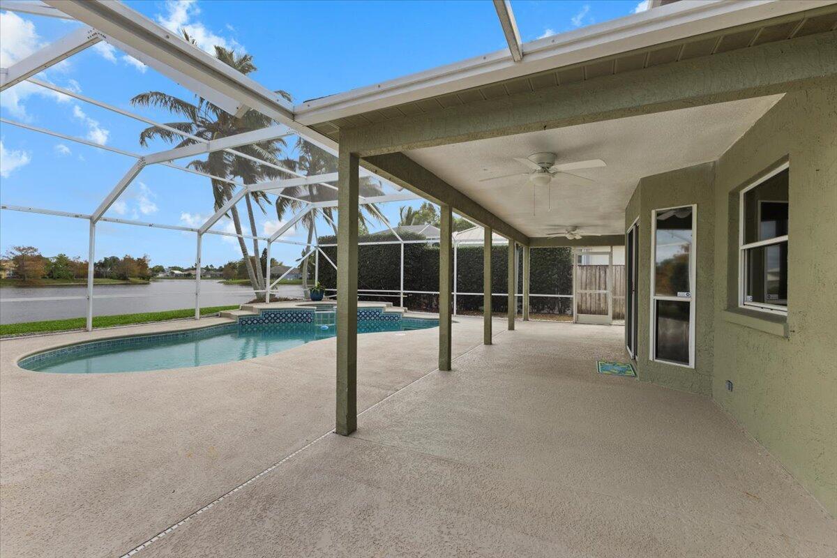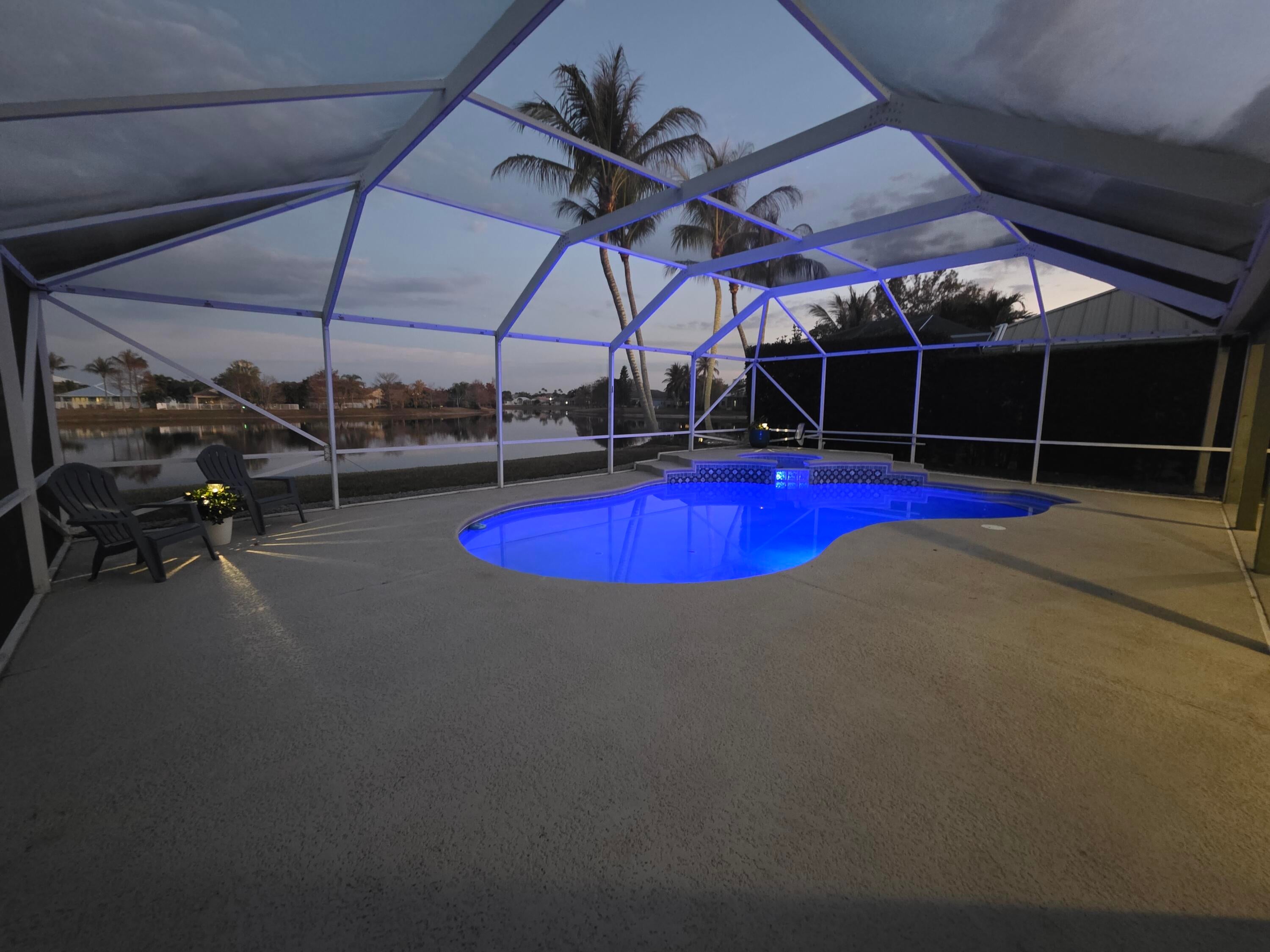 Florida living at it's finest: screened pool and heated jetted spa with LELD lighting overlooking the Eastern water view. Kitchen and 3 bathrooms updated. Painted inside with consistent flooring throughout. Full dining area and breakfast nook overlooking the water. 4 bedrooms, 2 full baths and 1 half bath. Main bath has roman tub w jets and separate shower. New A/C June 2023, New 50 Gallon water Heater 2023,Upgraded Bathrooms (3) 2019, Upgraded Kitchen (Countertops, Sink, Cabinets) 2019, New Kitchen Faucet with Soap Dispenser 2025, Refurbished Stove, Microwave and Refrigerator 2025. Five inch baseboards. Landscaping with Rock Boarder around pool protects screens from being cut 2025. Community playground. Treasure Coast Mall 5 Min Minutes to Beach.