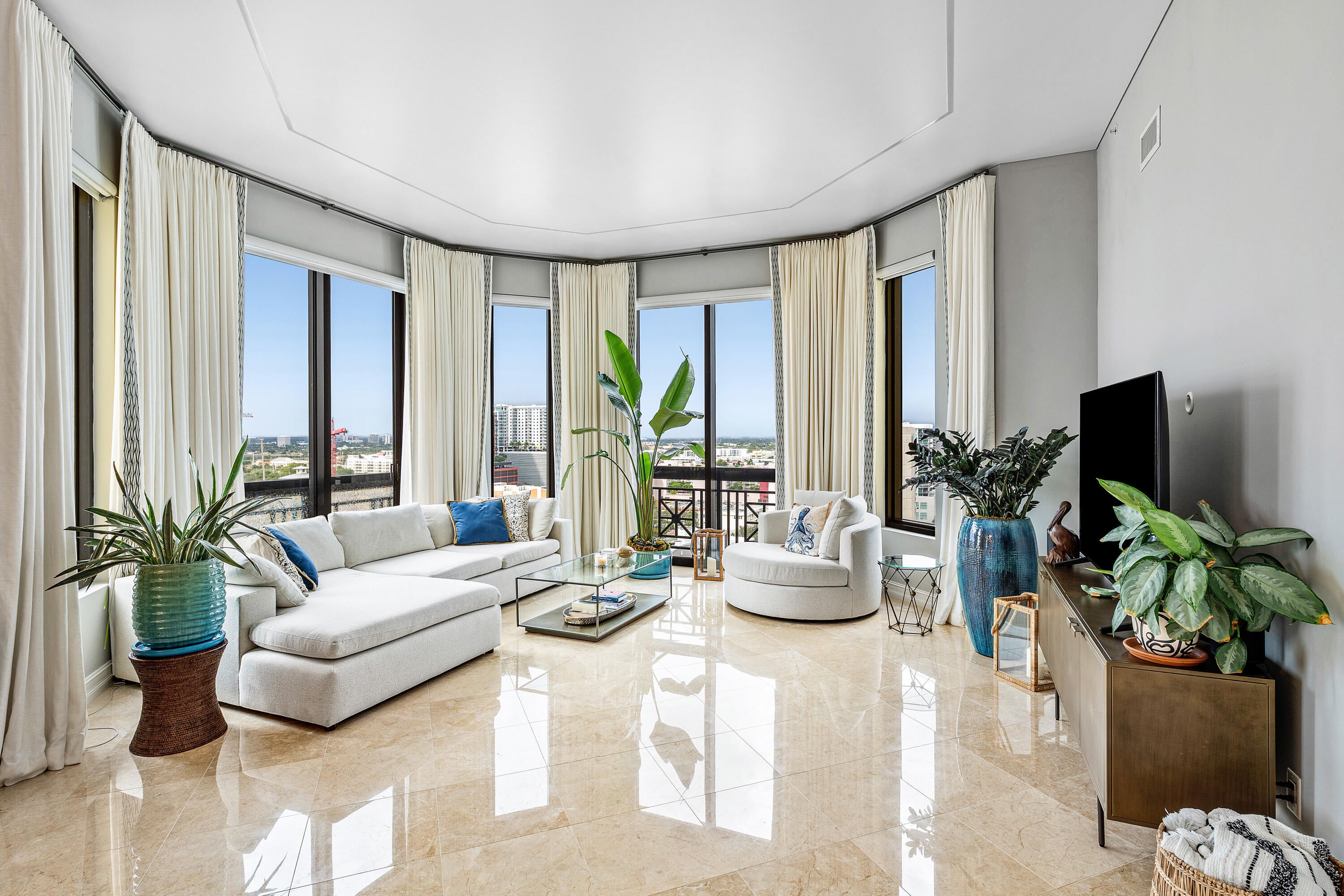 This spectacular furnished residence is a home in the sky with breathtaking panoramic city skyline sunset views and north corner ocean and intracoastal views. Highlighted by 12' ceilings, all marble and hardwood flooring throughout. Floor to ceiling glass and sliders that wrap around corner of the residence. Boasting 2,156sqft, this one-of-a-kind residence welcomes you with a light and airy spacious feel. This 2-bedroom, 2.5 bathroom plus den with built-in murphy bed and desk. An expanded balcony with Clear Lake and city skyline sunset views. The kitchen has a modern feel, large open space w/ kitchen table and opens to the large balcony. The spacious master-suite features a luxurious all marble spa-like bathroom, signature large soaking tub, oversized walk-in fitted closet. 2nd bedroom..has ocean/Intracoastal views and has ensuite bathroom. This also comes with 1-parking space. Perfectly positioned in one of downtown's most sought-after buildings, this residence combines elegance, comfort, and prime location for effortless luxury living. Located just moments from dining, shopping, nightlife, and cultural attractions, Two City Plaza offers full-service, resort-style amenities in one of downtown's most desirable addresses. Amenities in this full-service building are endless; 24-hr security, concierge, roof top pool, hot tub, sauna, steam room, fully renovated state of the art fitness center/gym, outdoor kitchen w/ BBQ area and all NEW Restoration Hardware furniture, outdoor & indoor movie theaters, club room, table tennis, lanai courtyard w/ water feature, renovated roof top dog park area, complimentary valet parking & exceptional staff. Centrally located in the heart of Downtown West Palm Beach, across from One Flagler offices, 7 minutes to PBIA airport, award winning restaurants and shopping, and walking to Worth Ave, Palm Beach.