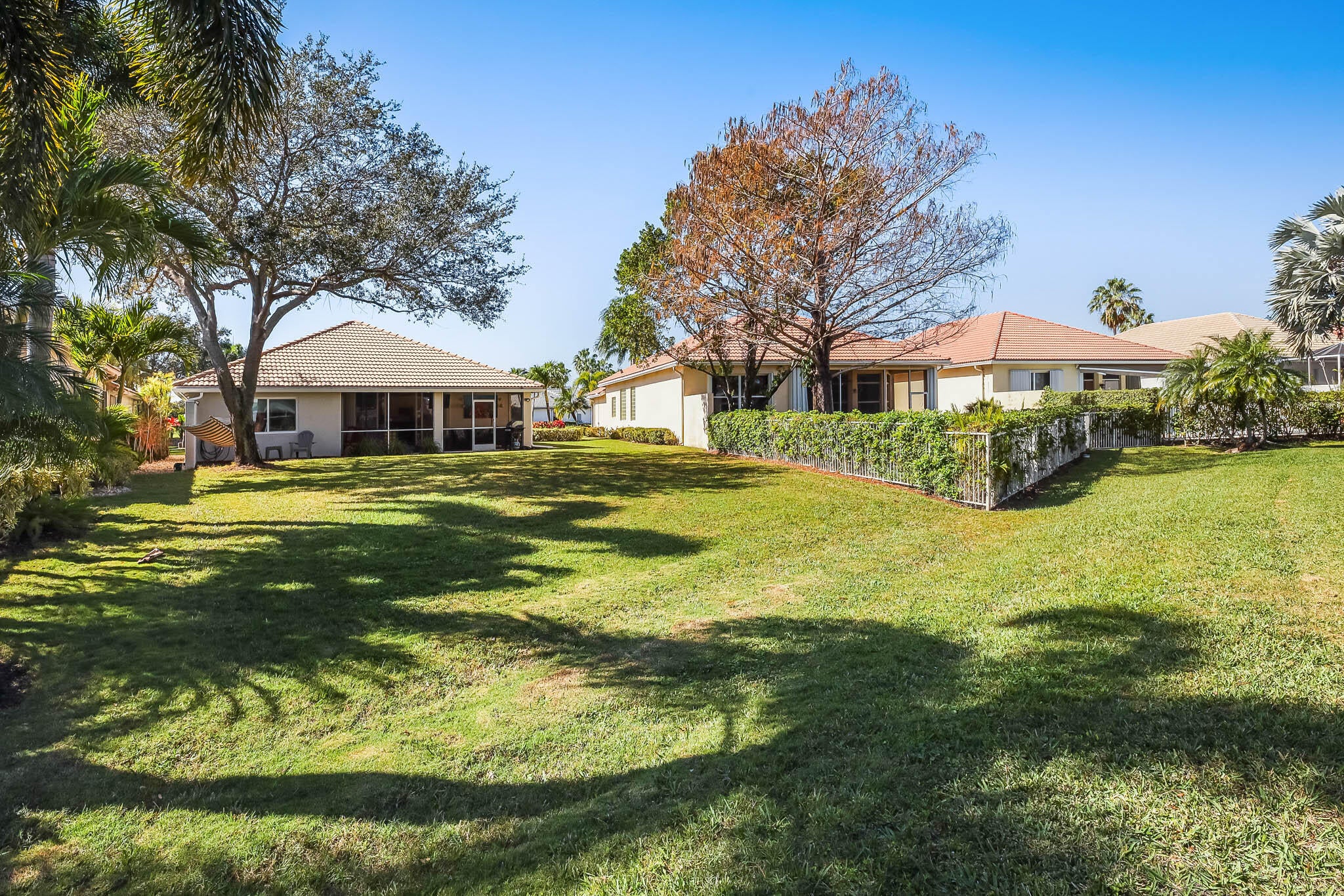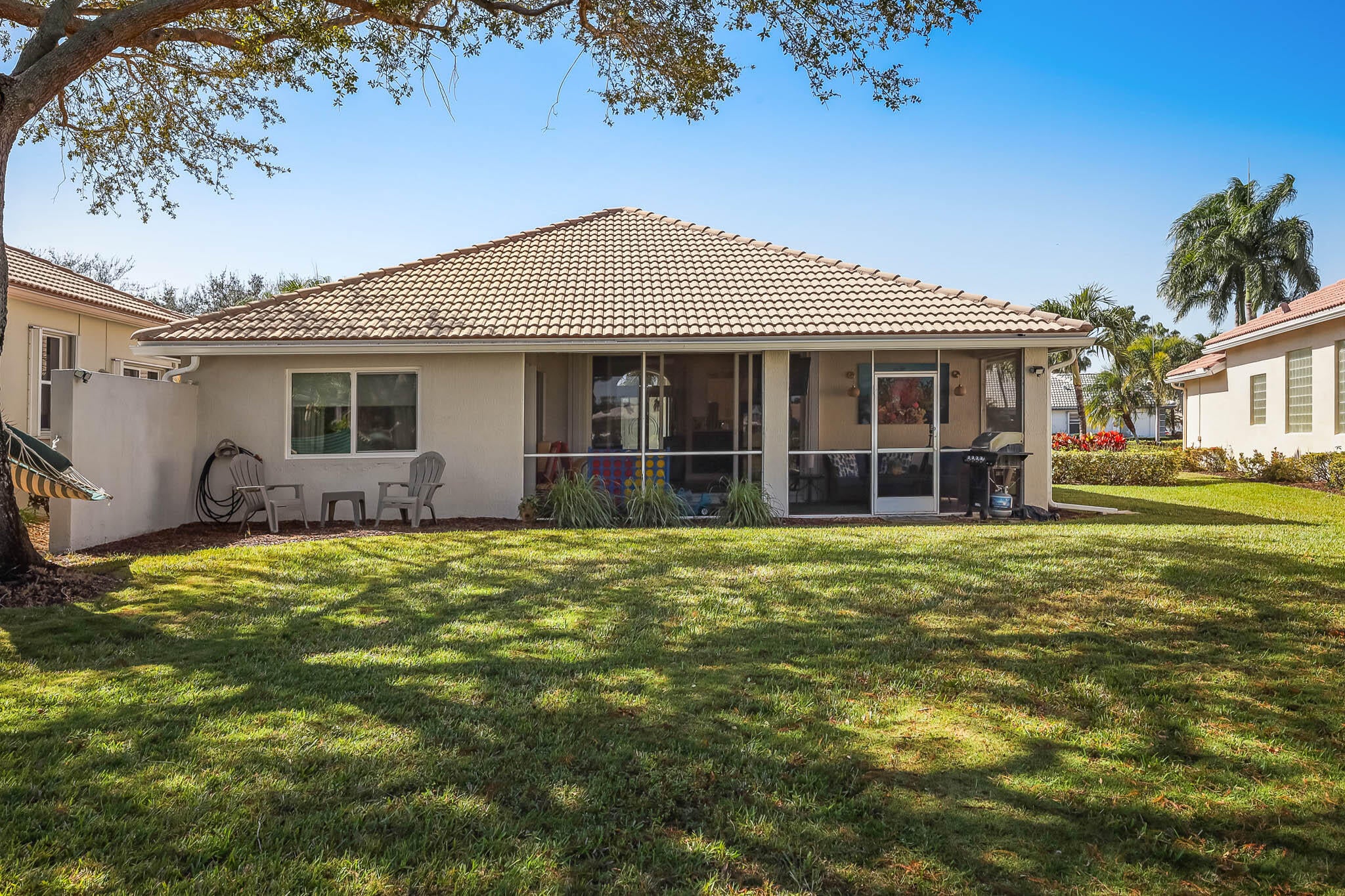 Nestled within a gated community, this spacious split-plan home blends comfort and style. The updated kitchen features white shaker cabinets and granite countertops, while tile flooring flows throughout the main living areas. Relax with your morning coffee or unwind with an afternoon cocktail on the screened patio overlooking the golf course. Impact hurricane glass throughout adds peace of mind. The HOA includes basic cable, internet, exterior landscaping, and 24/7 security patrol. Centrally located near shopping, dining, beaches, I-95, and the Turnpike. This home truly has it all. PRICED TO SELL!!