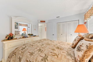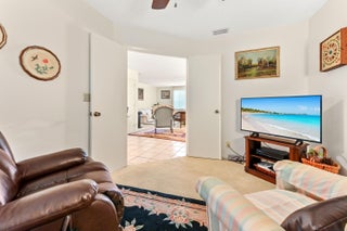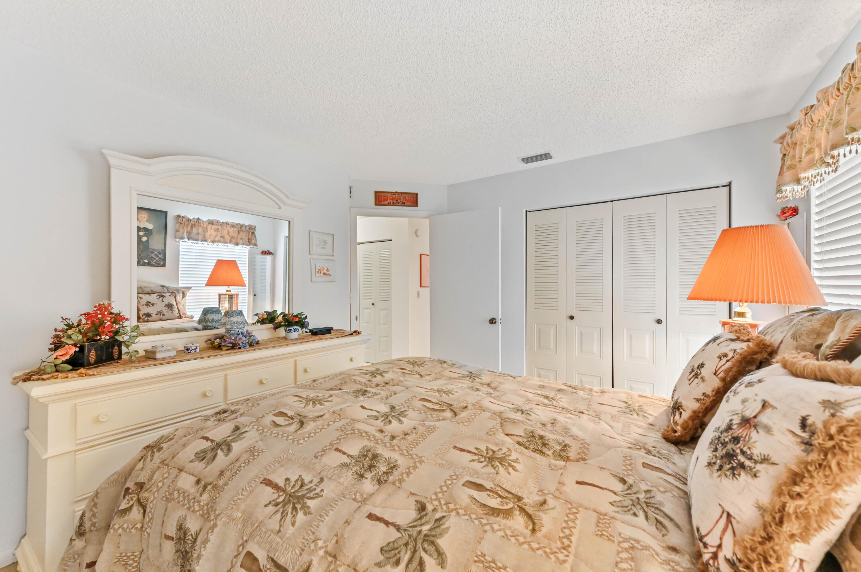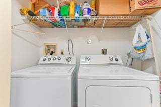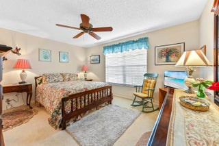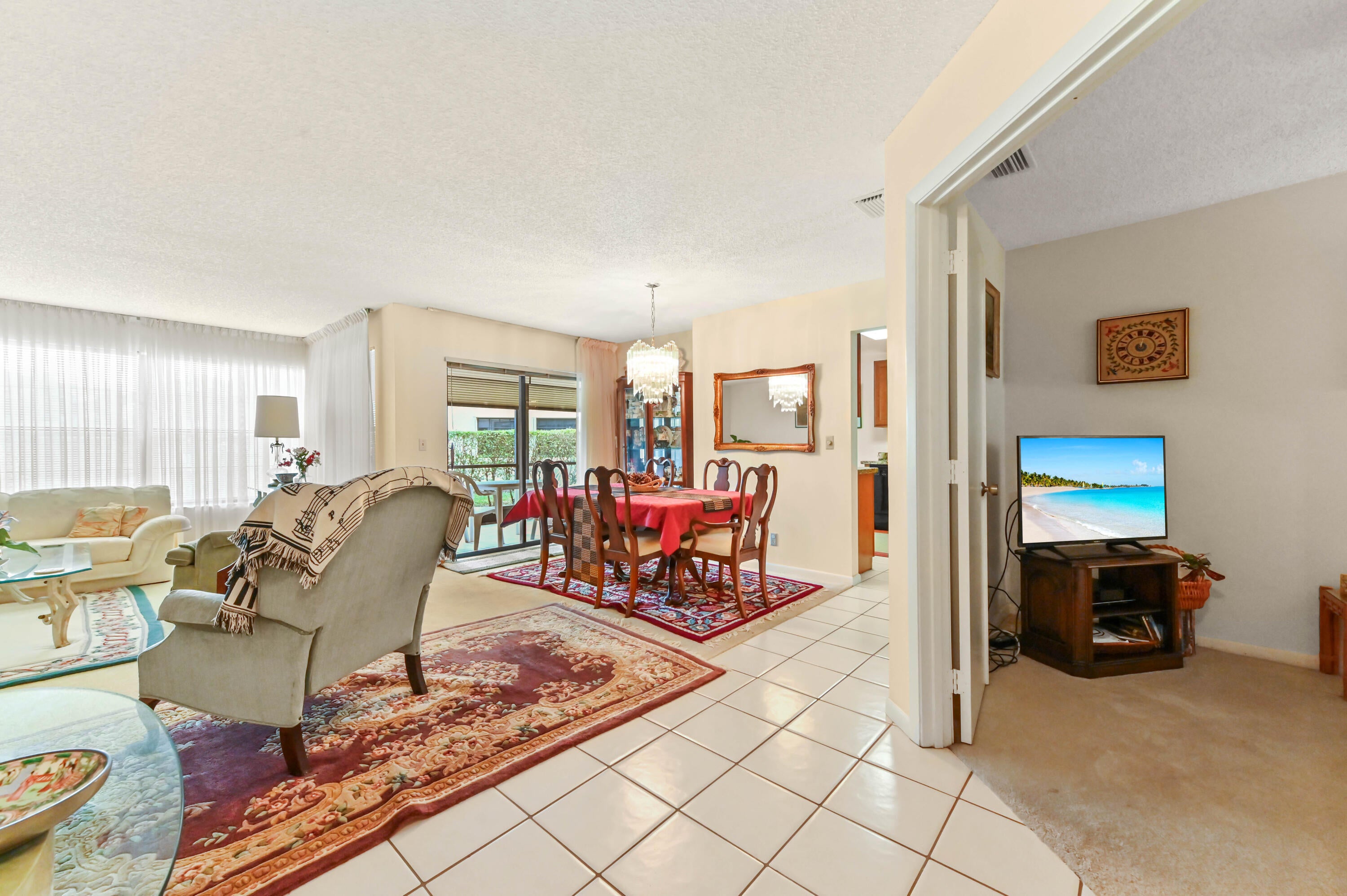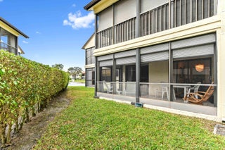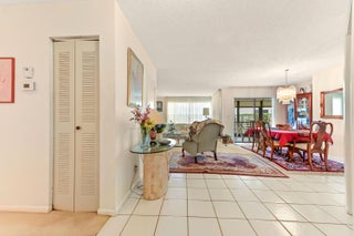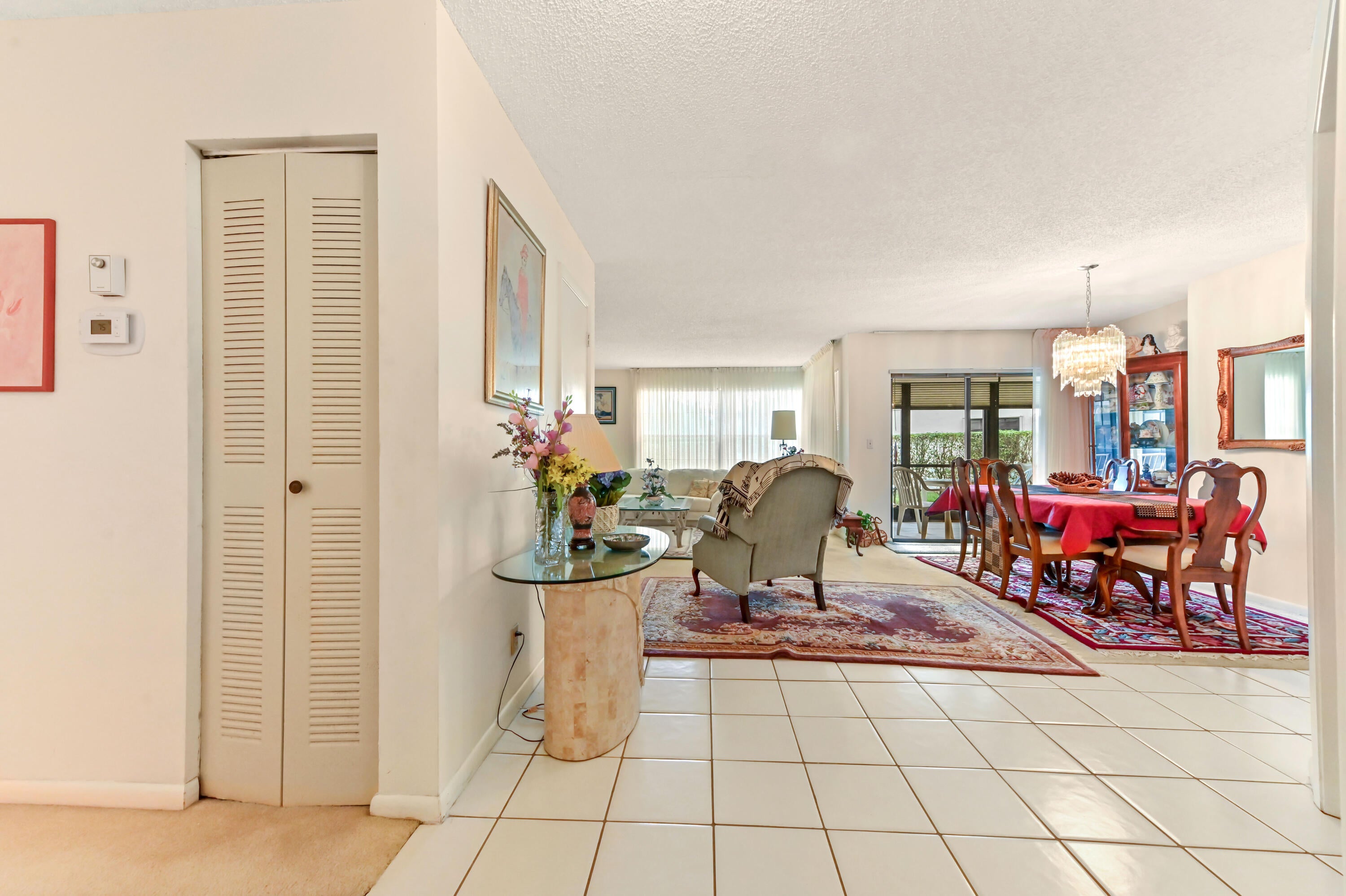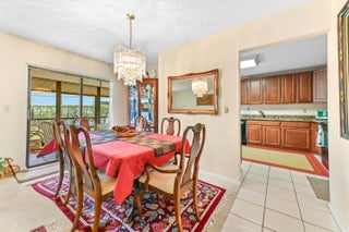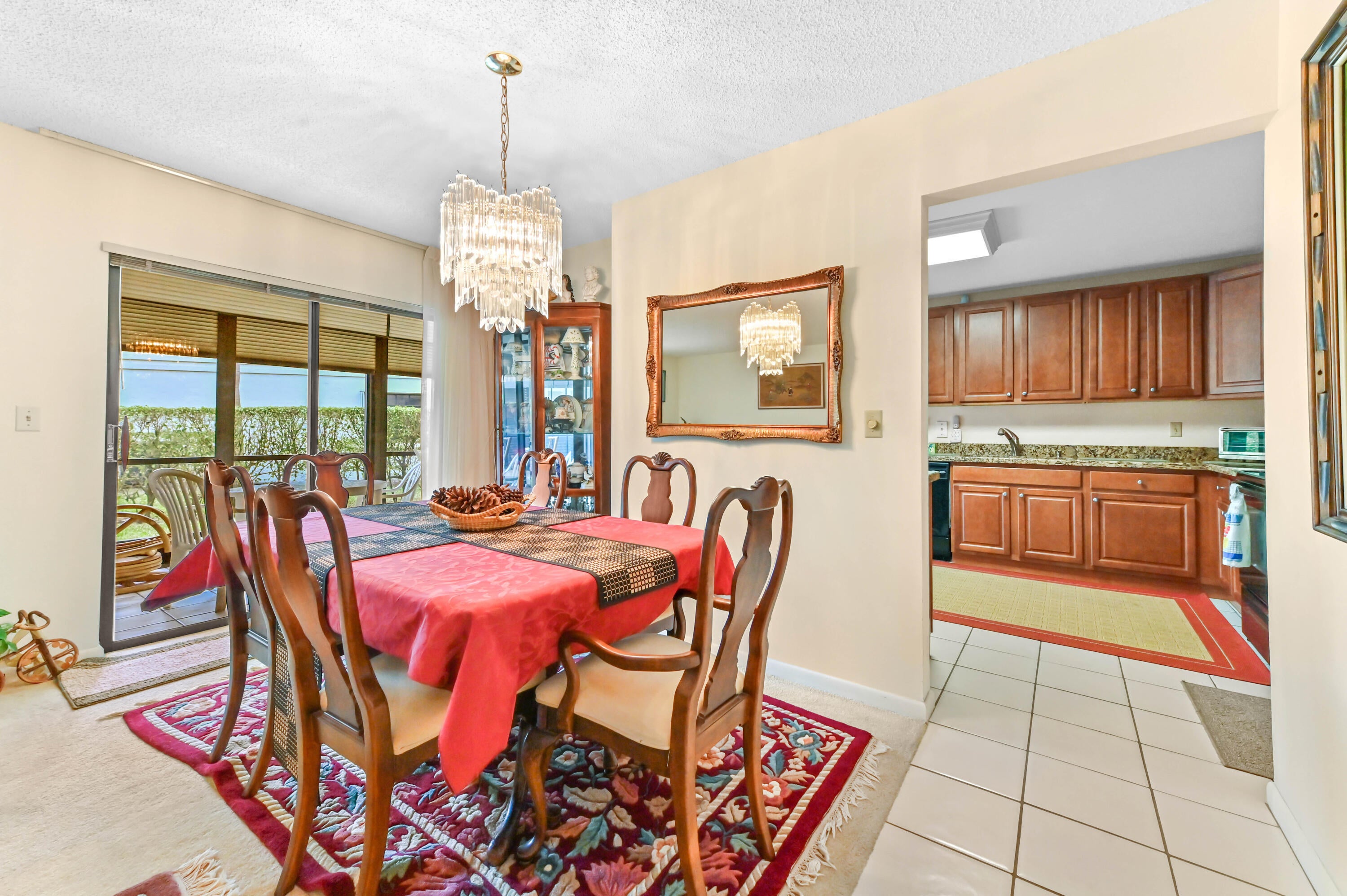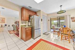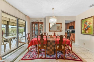 Experience the comfort of extra space and privacy in this inviting corner unit condo in 55+ community, where natural light streams through abundant windows to illuminate the generous interiors. The floor plan is designed for effortless living, featuring a distinct separation between the carpeted, expansive living/family room and the tiled formal dining area, which is accented by a classic chandelier. The heart of the home is the functional eat-in kitchen, equipped with warm wood cabinetry, modern appliances, and a cozy breakfast nook right by the window--the perfect spot for your morning coffee. Sliding glass doors extend the living space out to a private, screened-in patio with tiled flooring, offering a serene retreat overlooking the garden.Retreat to the comfortable private quarters, where the primary suite offers a peaceful haven complete with a large window and an ensuite bathroom featuring a white vanity and a step-in shower with sliding glass doors. The guest bedroom and second bathroom, provide ample accommodation for family or visitors. A standout feature of this residence is the dedicated laundry room with full-size washer and dryer and extra shelving, adding a level of convenience rarely found in condo living. With plenty of storage, including closets in the foyer and a walk-in closet, this home blends practicality with relaxed Florida charm.