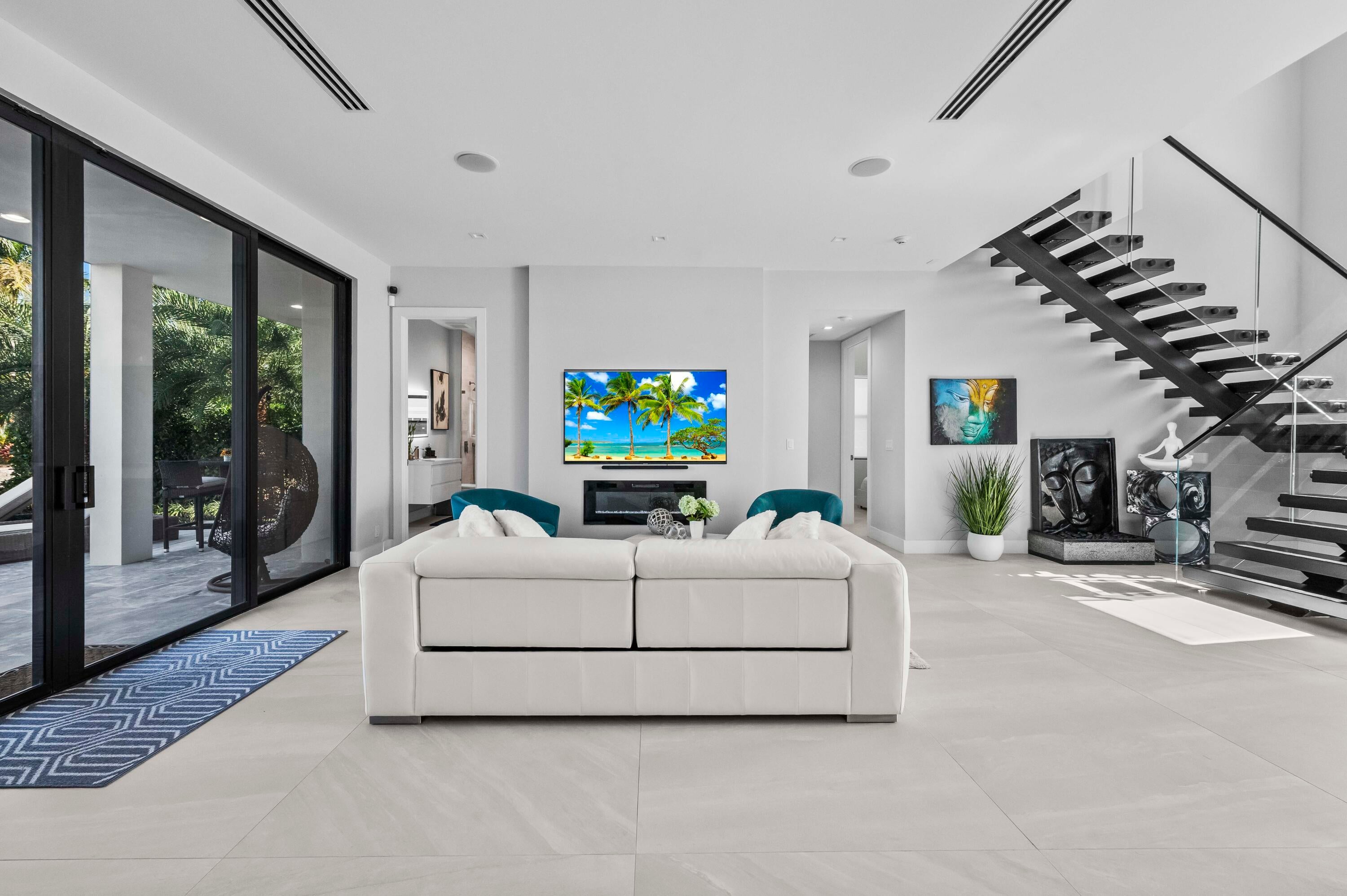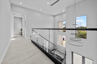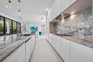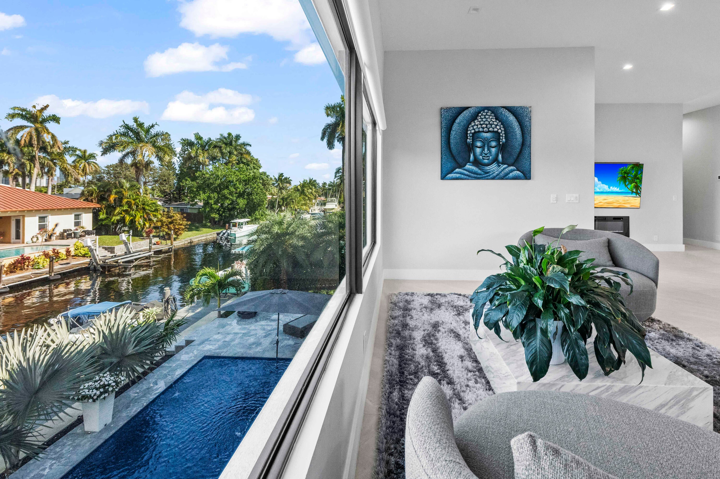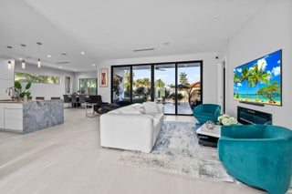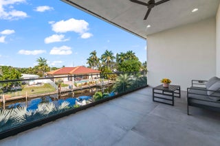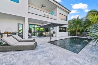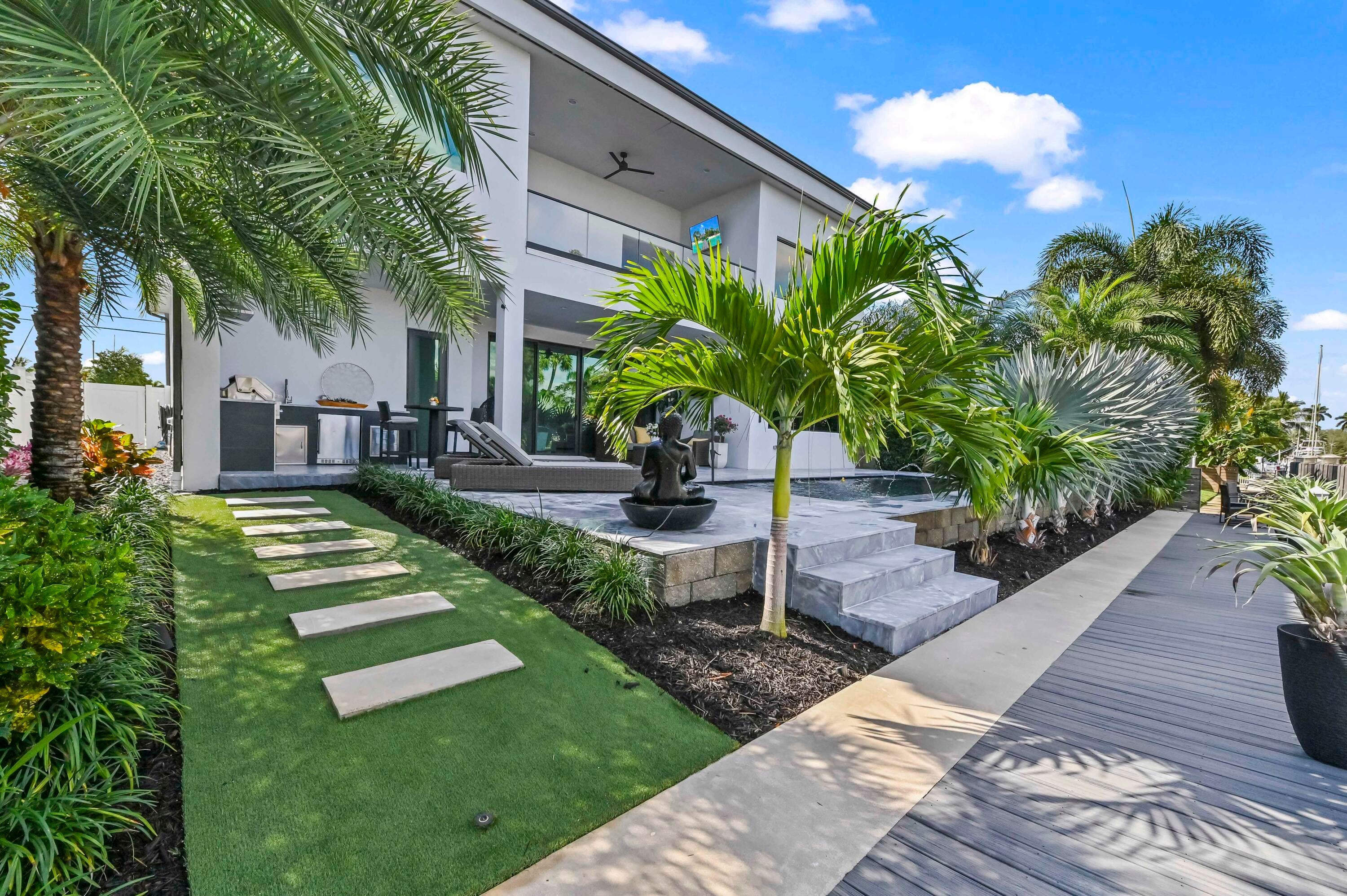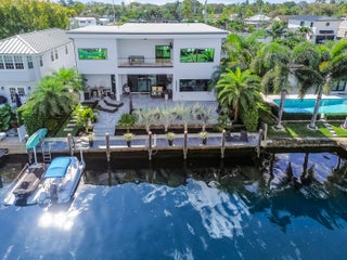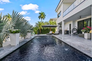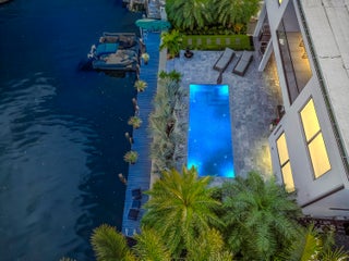 Immerse yourself in modern luxury in this stunning waterfront estate, perfectly positioned on the prestigious Mandarin Isle. A striking architectural presence greets you upon arrival, featuring a manicured geometric driveway and a grand entrance that sets the tone for the sophistication within. Step through the glass doors to discover an open-concept interior bathed in natural light, defined by soaring ceilings, large-format polished tile flooring, and a dramatic floating staircase with glass railings that serves as a centerpiece of modern design.The heart of the home is the sleek European-style gourmet kitchen, boasting high-gloss white cabinetry, a massive waterfall-edge stone island with bar seating, and integrated premium appliances, all flowing seamlessly into the dining area framed by a massive picture window. Retreat to the upstairs sanctuary where the expansive primary suite offers the ultimate in relaxation. This private haven features a large walk-in closet with custom built-ins and a spa-inspired ensuite bathroom complete with a freestanding soaking tub, a frameless glass shower, and breathtaking views of the waterway. Sliding glass doors from the bedroom open to a private glass-railed balcony, the perfect vantage point for enjoying morning coffee while overlooking the serene canal and city skyline. The home's layout is thoughtfully designed to maximize water views from almost every room, creating an atmosphere of tranquility and connection to the outdoors. The outdoor living space is a true entertainer's paradis. Step out to a covered patui featuring a full summer kitchen with a built-in grill, ideal for alfresco dining year-round. The backyard centers around a spectacular, sleek dark-bottom pool with fountains and a sun shelf, surrounded by lush tropical landscaping and Zen-inspired decor that creates a private oasis. Boating enthusiasts will appreciate the private deep-water dock with a boat lift, offering direct ocean access with no fixed bridges, making this the perfect home for enjoying the quintessential Fort Lauderdale yachting lifestyle.
