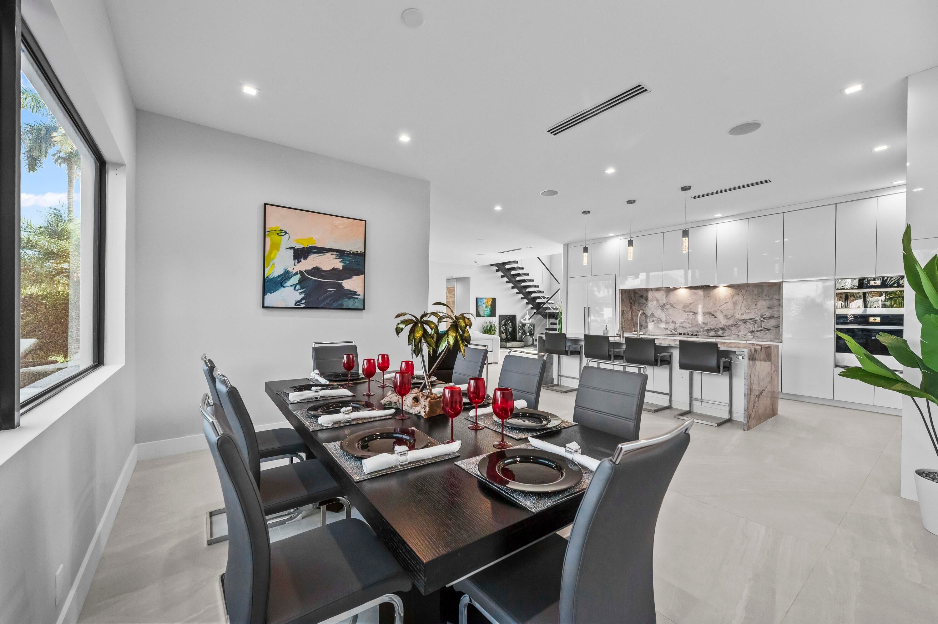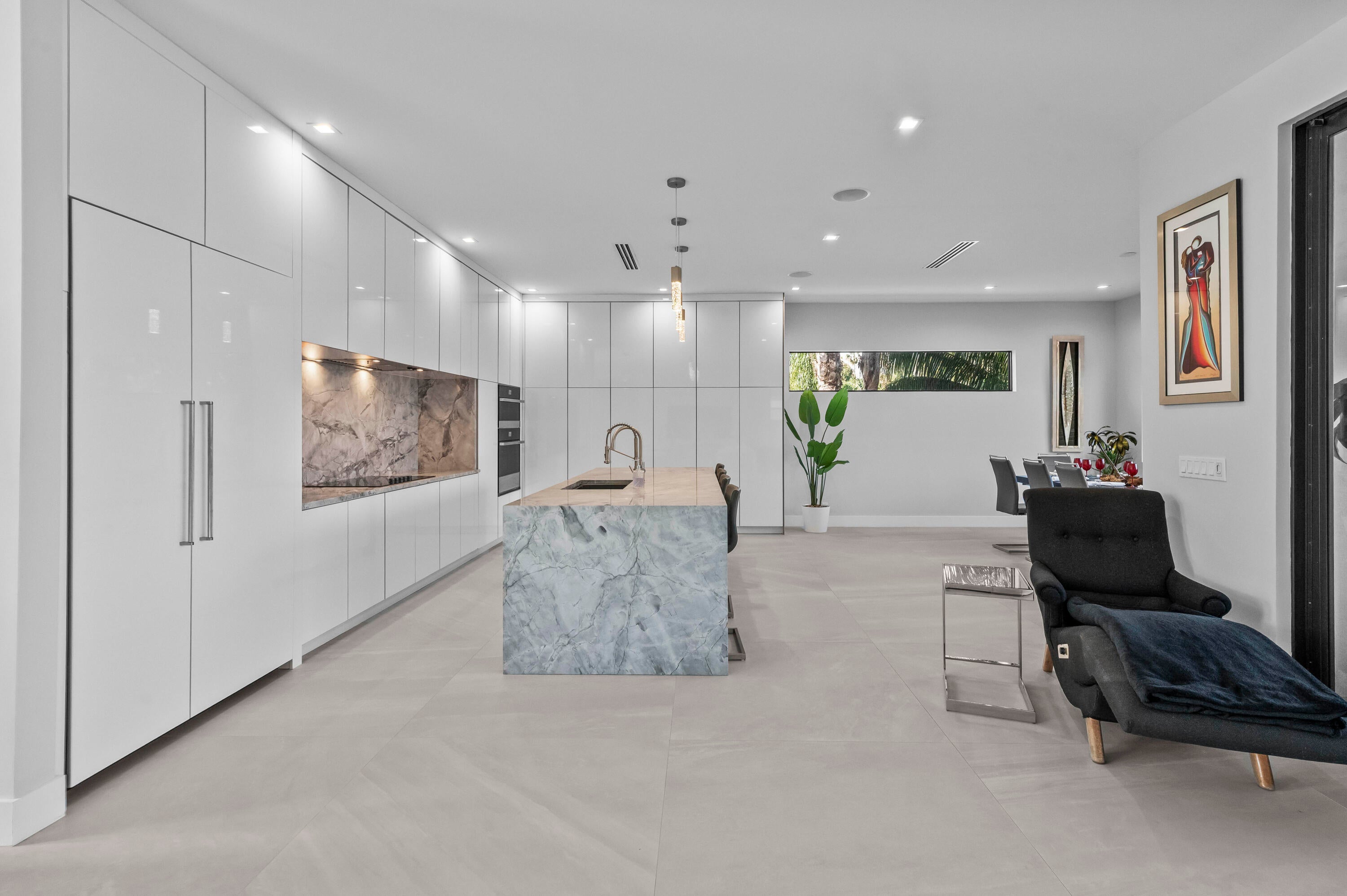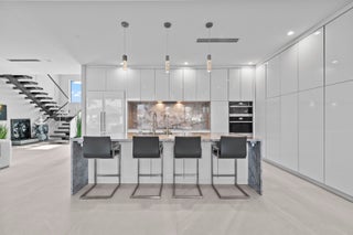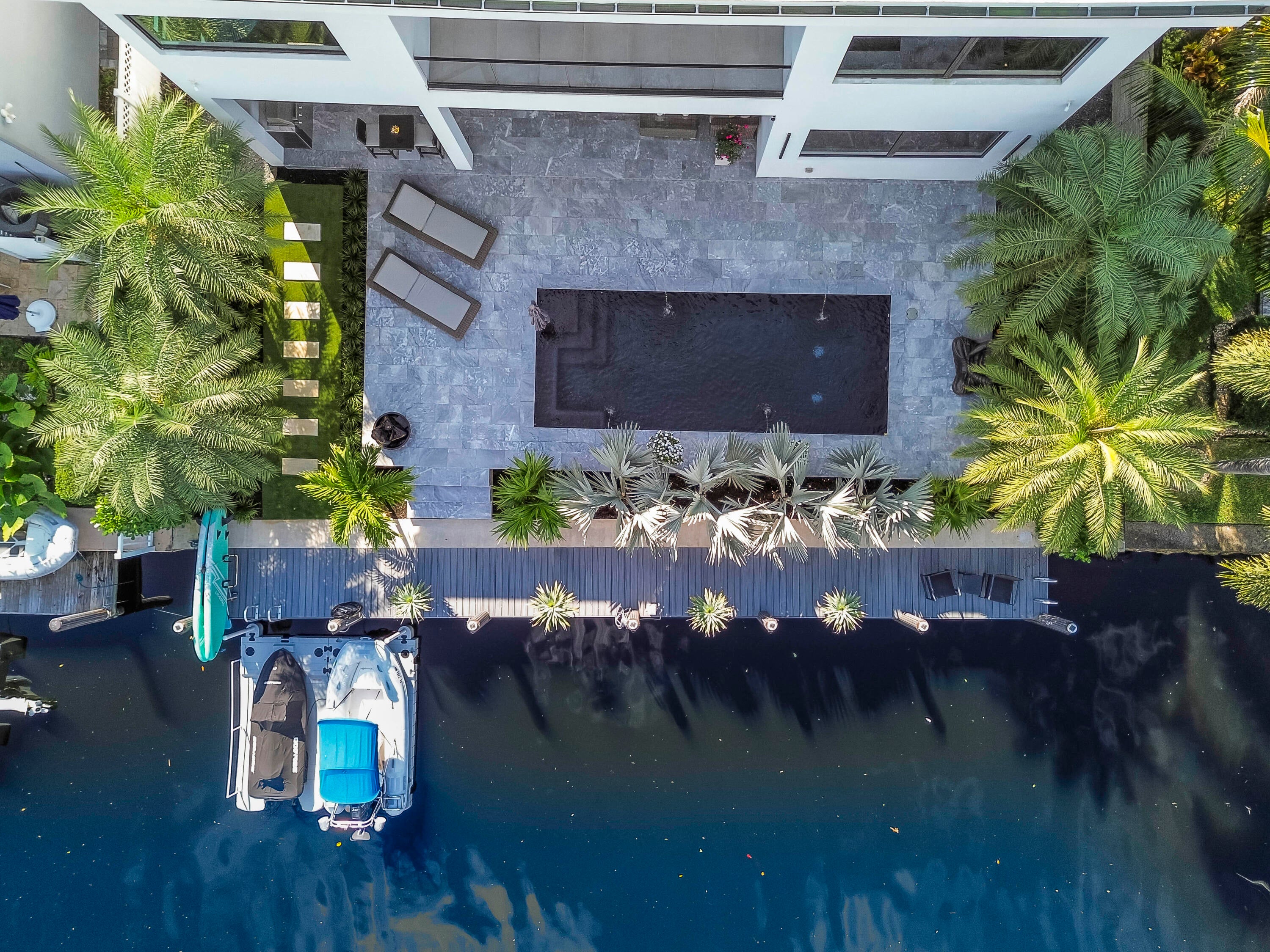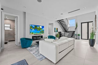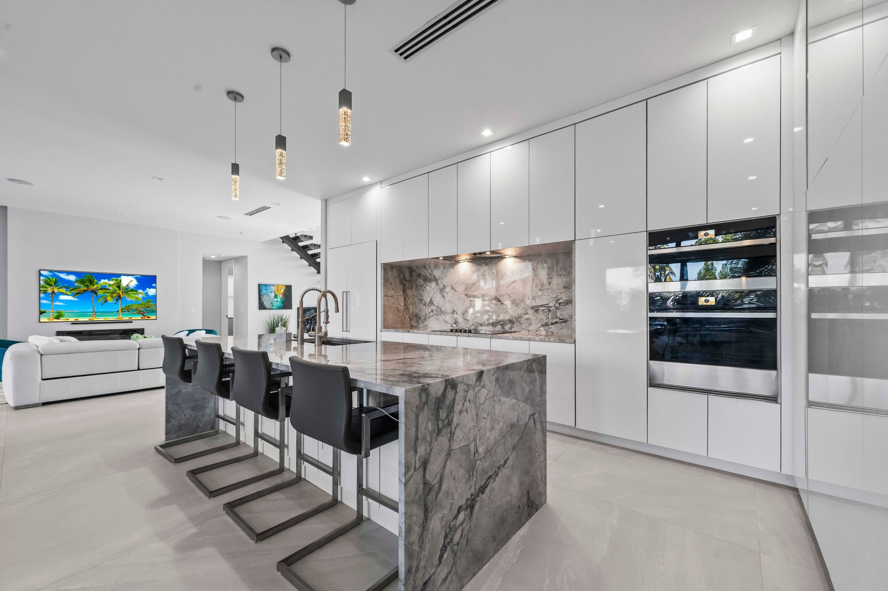 Immerse yourself in modern luxury in this stunning waterfront estate, perfectly positioned on the prestigious Mandarin Isle. A striking architectural presence greets you upon arrival, featuring a manicured geometric driveway and a grand entrance that sets the tone for the sophistication within. Step through the glass doors to discover an open-concept interior bathed in natural light, defined by soaring ceilings, large-format polished tile flooring, and a dramatic floating staircase with glass railings that serves as a centerpiece of modern design.The heart of the home is the sleek European-style gourmet kitchen, boasting high-gloss white cabinetry, a massive waterfall-edge stone island with bar seating, and integrated premium appliances, all flowing seamlessly into the dining area framed by a massive picture window. Retreat to the upstairs sanctuary where the expansive primary suite offers the ultimate in relaxation. This private haven features a large walk-in closet with custom built-ins and a spa-inspired ensuite bathroom complete with a freestanding soaking tub, a frameless glass shower, and breathtaking views of the waterway. Sliding glass doors from the bedroom open to a private glass-railed balcony, the perfect vantage point for enjoying morning coffee while overlooking the serene canal and city skyline. The home's layout is thoughtfully designed to maximize water views from almost every room, creating an atmosphere of tranquility and connection to the outdoors. The outdoor living space is a true entertainer's paradis. Step out to a covered patui featuring a full summer kitchen with a built-in grill, ideal for alfresco dining year-round. The backyard centers around a spectacular, sleek dark-bottom pool with fountains and a sun shelf, surrounded by lush tropical landscaping and Zen-inspired decor that creates a private oasis. Boating enthusiasts will appreciate the private deep-water dock with a boat lift, offering direct ocean access with no fixed bridges, making this the perfect home for enjoying the quintessential Fort Lauderdale yachting lifestyle.