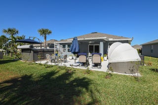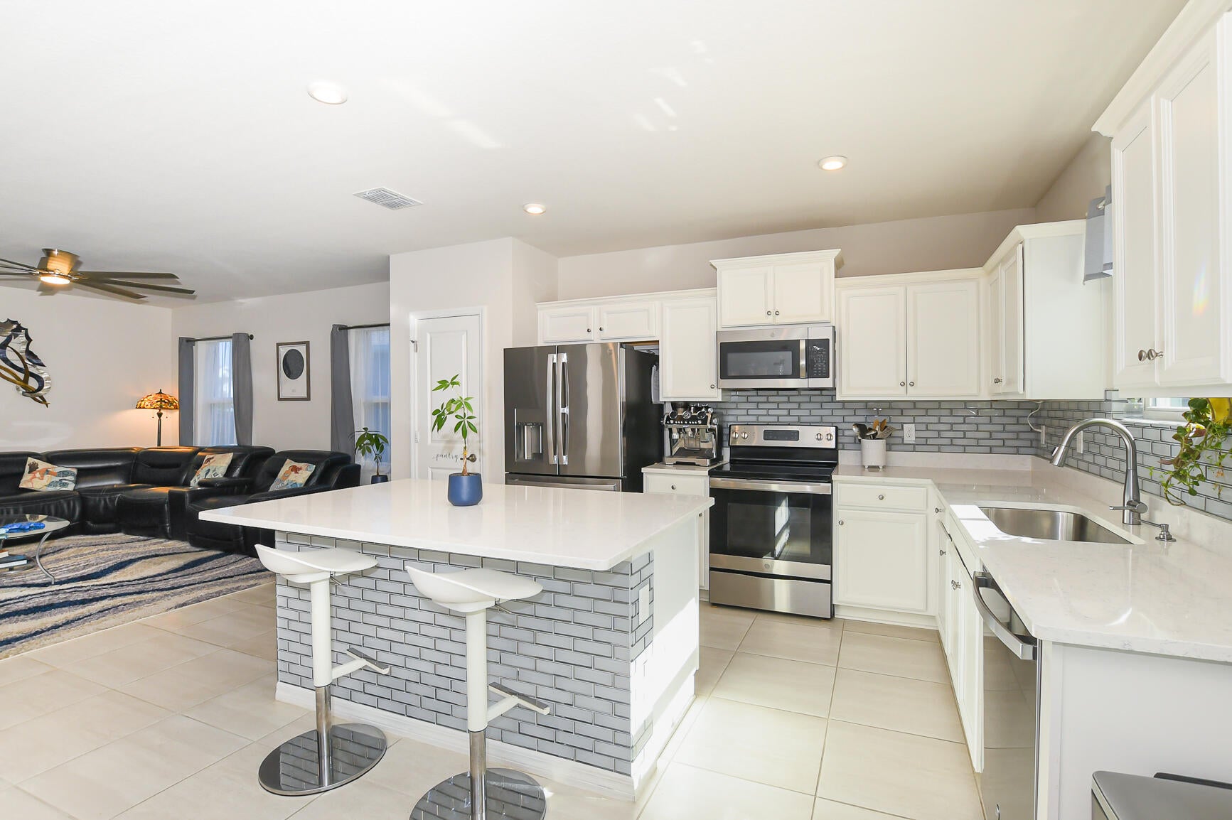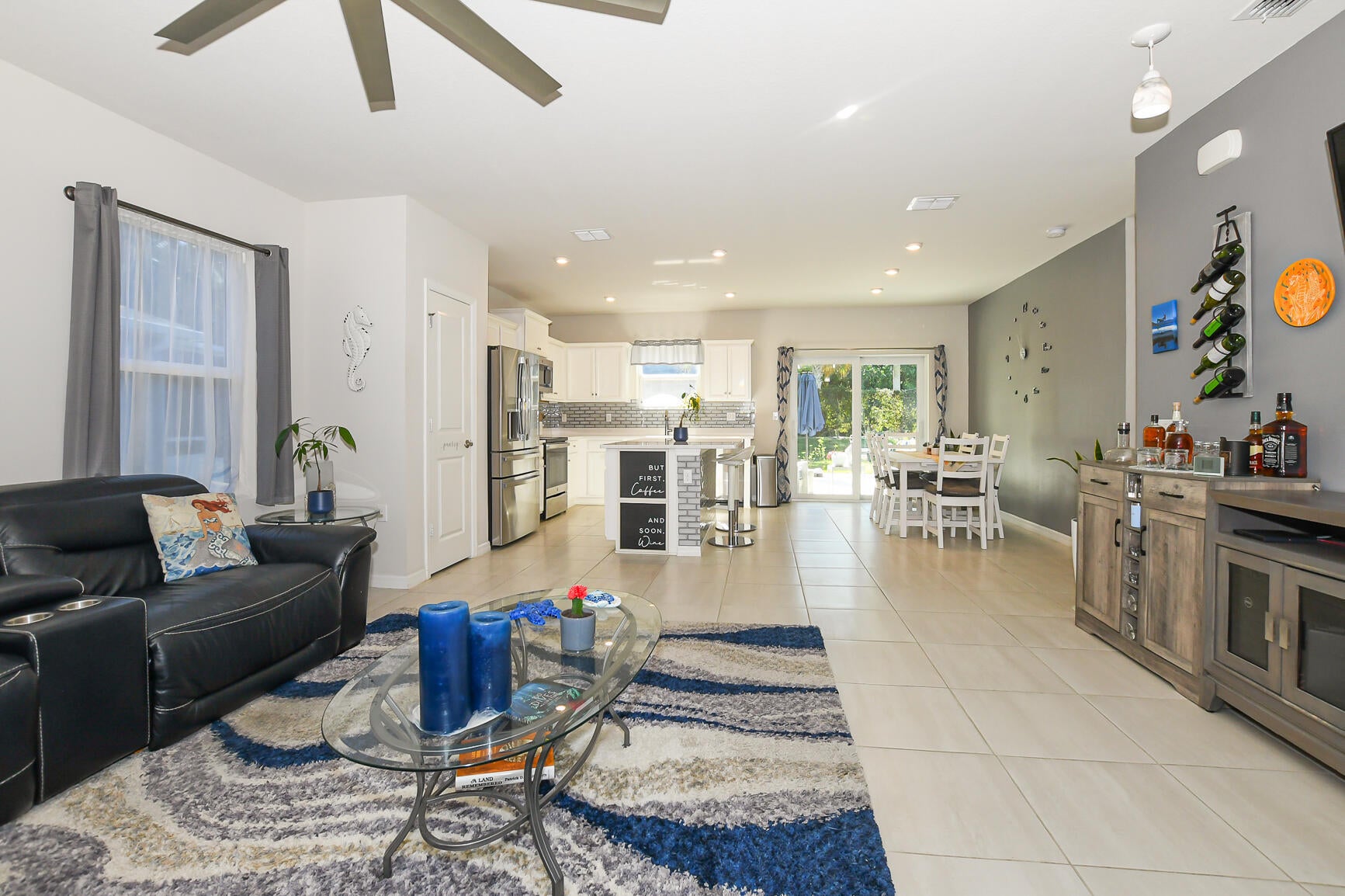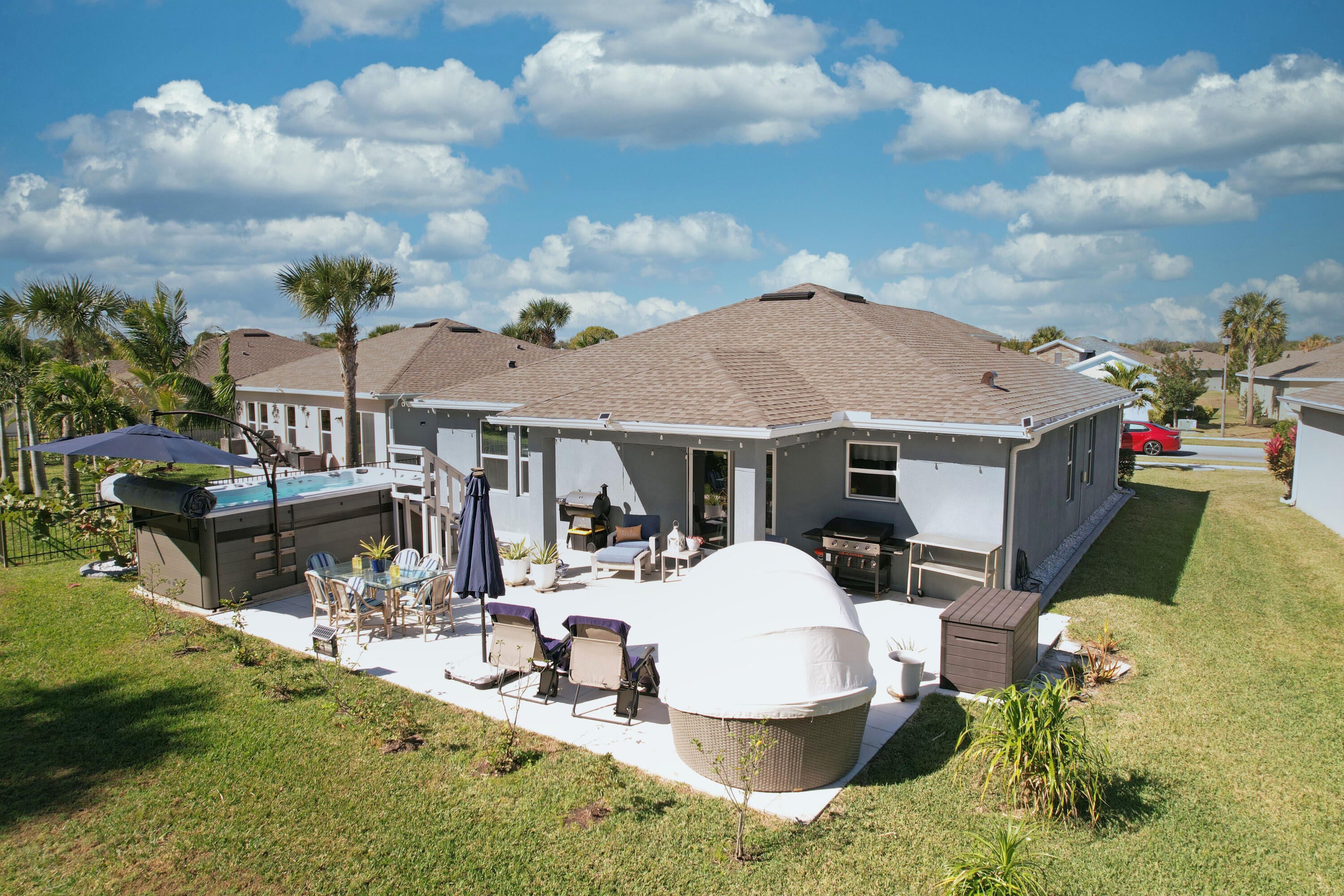 Well designed and beautifully maintained 3 bedroom 2 bath home in Carriage Pointe Estates shows like a model. This charming community is surrounded by a preserve, nearby nature trails and lake for added peace and tranquility. Spacious open floor plan offers plenty of natural light throughout. The kitchen features quartz countertops, center island, designer subway tile backsplash, over-under cabinet lighting and opens to the main living/dining, perfect for everyday living and entertaining. Primary suite/bath include a walk-in closet, dual sinks and step-in shower. Guest bedrooms and bath offer privacy and comfort. Relax resort style on your extended paver lanai with above ground swim spa for year-round enjoyment. Additional features include, impact glass, hard wired for generatorhook-up, upgraded roofing materials at time of construction, additional landscaping and custom curbing stones. Conveniently located near major interstate highways, downtown entertainment, restaurants and the best beaches on the Treasure Coast.