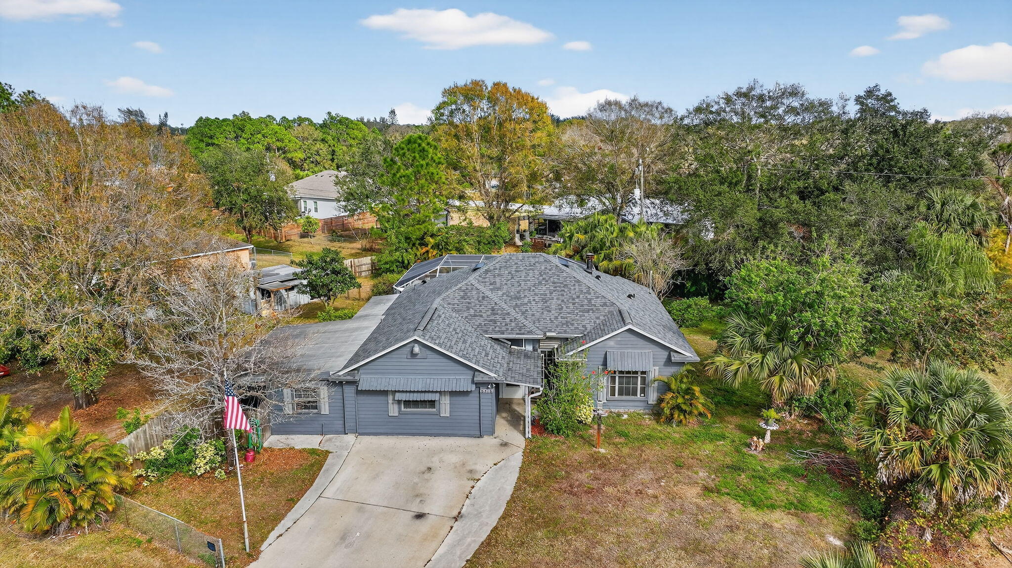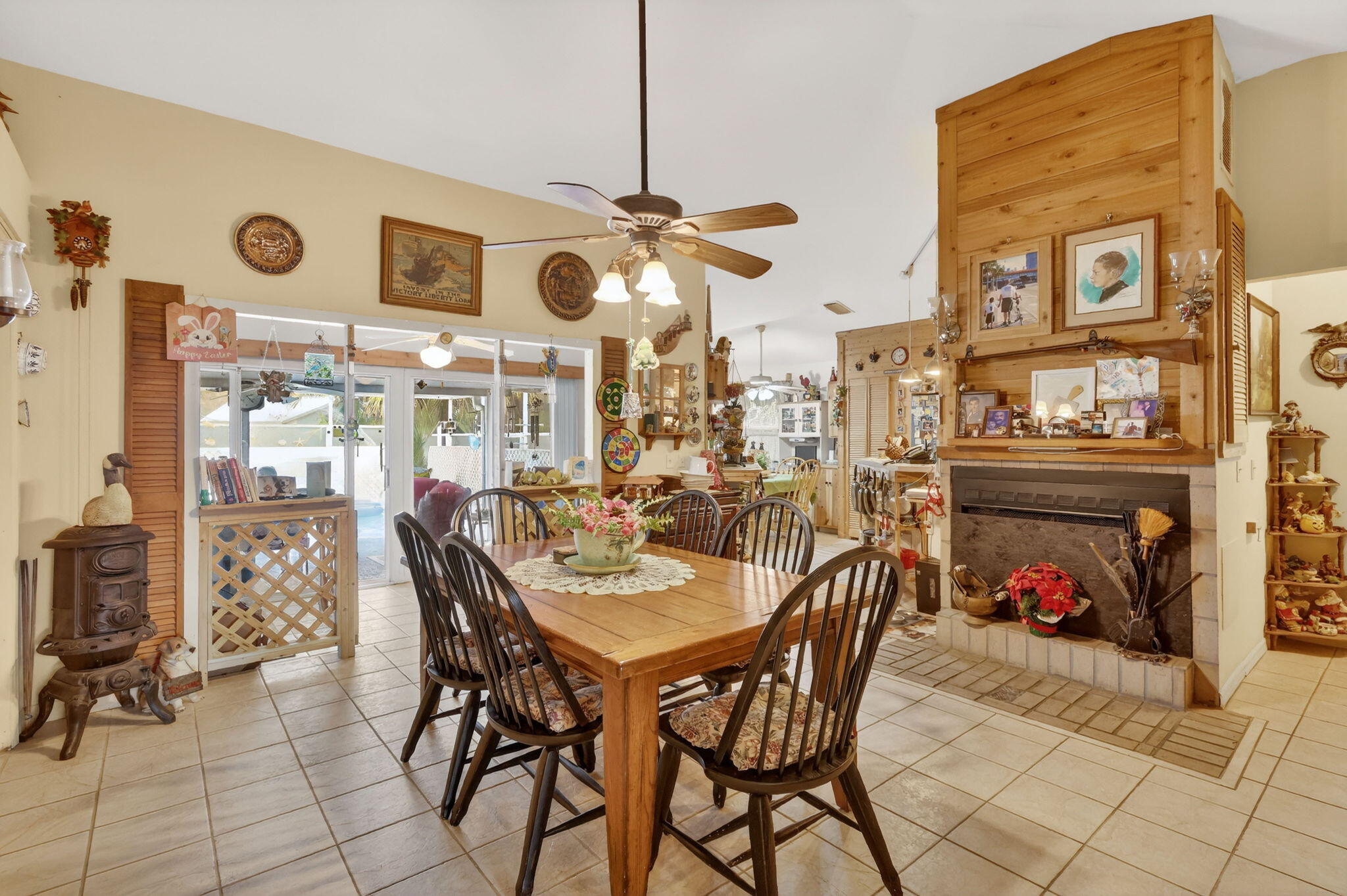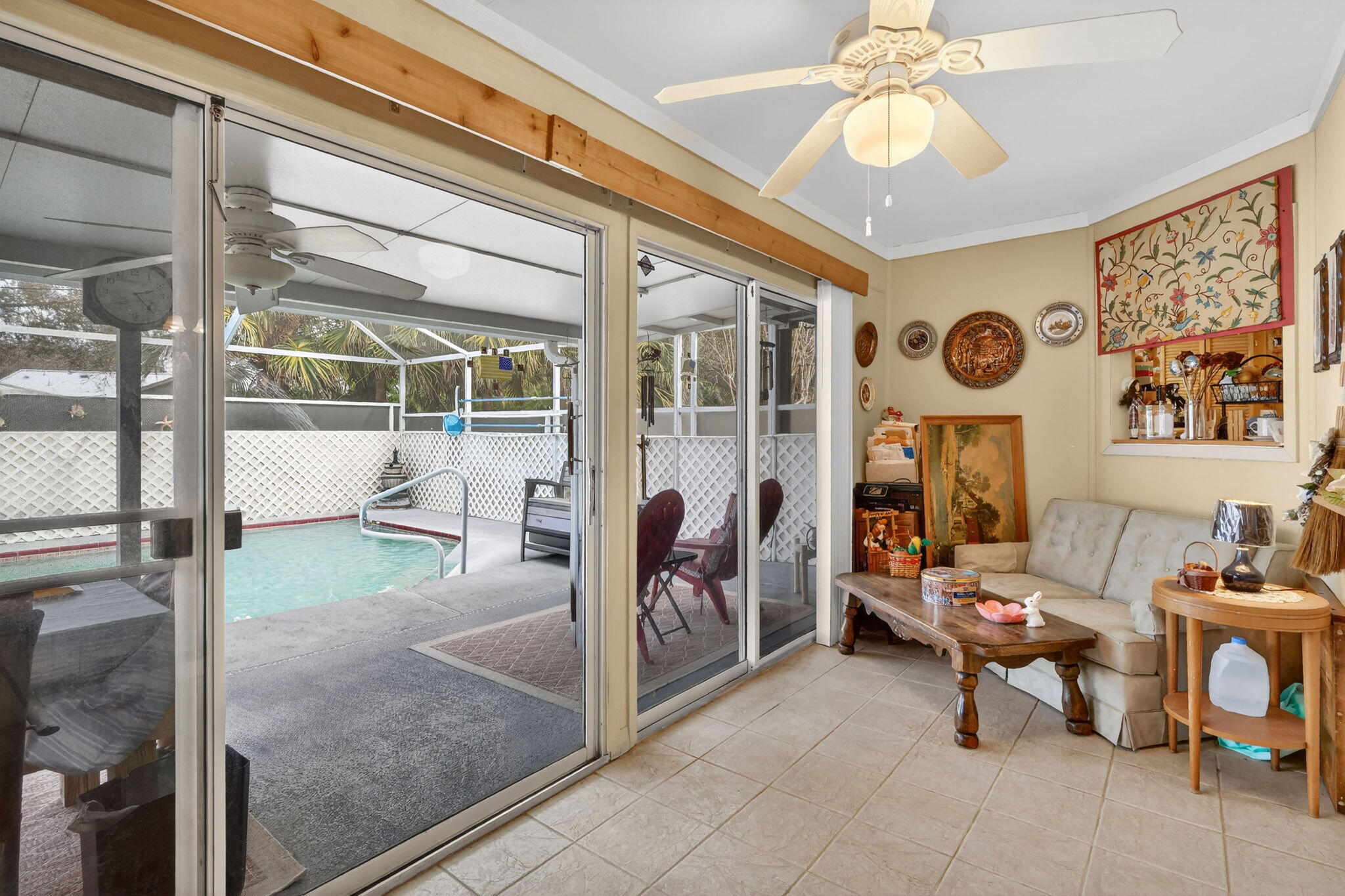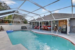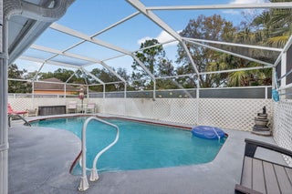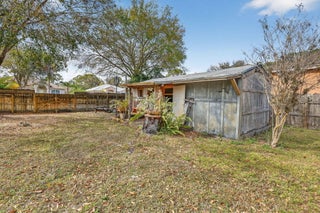 Charming 3BR/2BA home featuring a screened, caged-in pool with covered patio space ideal for relaxing or outdoor dining year-round. Spacious primary suite includes separate tub and shower. Garage conversion provides flexible family room living area. Home also offers a den/office, generous storage throughout, screened porch, workshop outbuilding, and a nicely sized yard with room to garden, play, or entertain. Comfortable floor plan supports everyday living, hobbies, and gatherings, with versatile indoor and outdoor spaces designed for function, comfort, and easy Florida living.