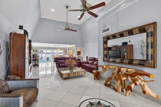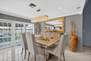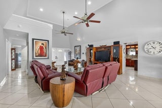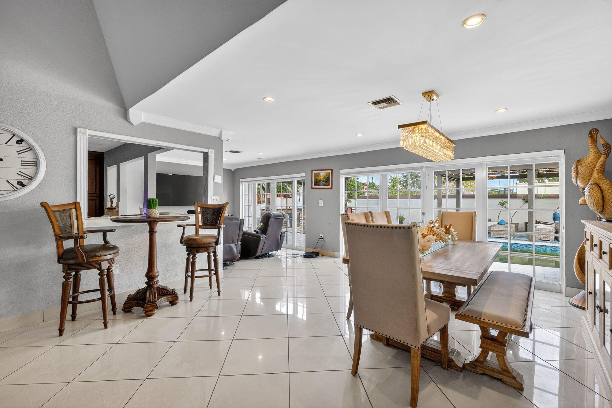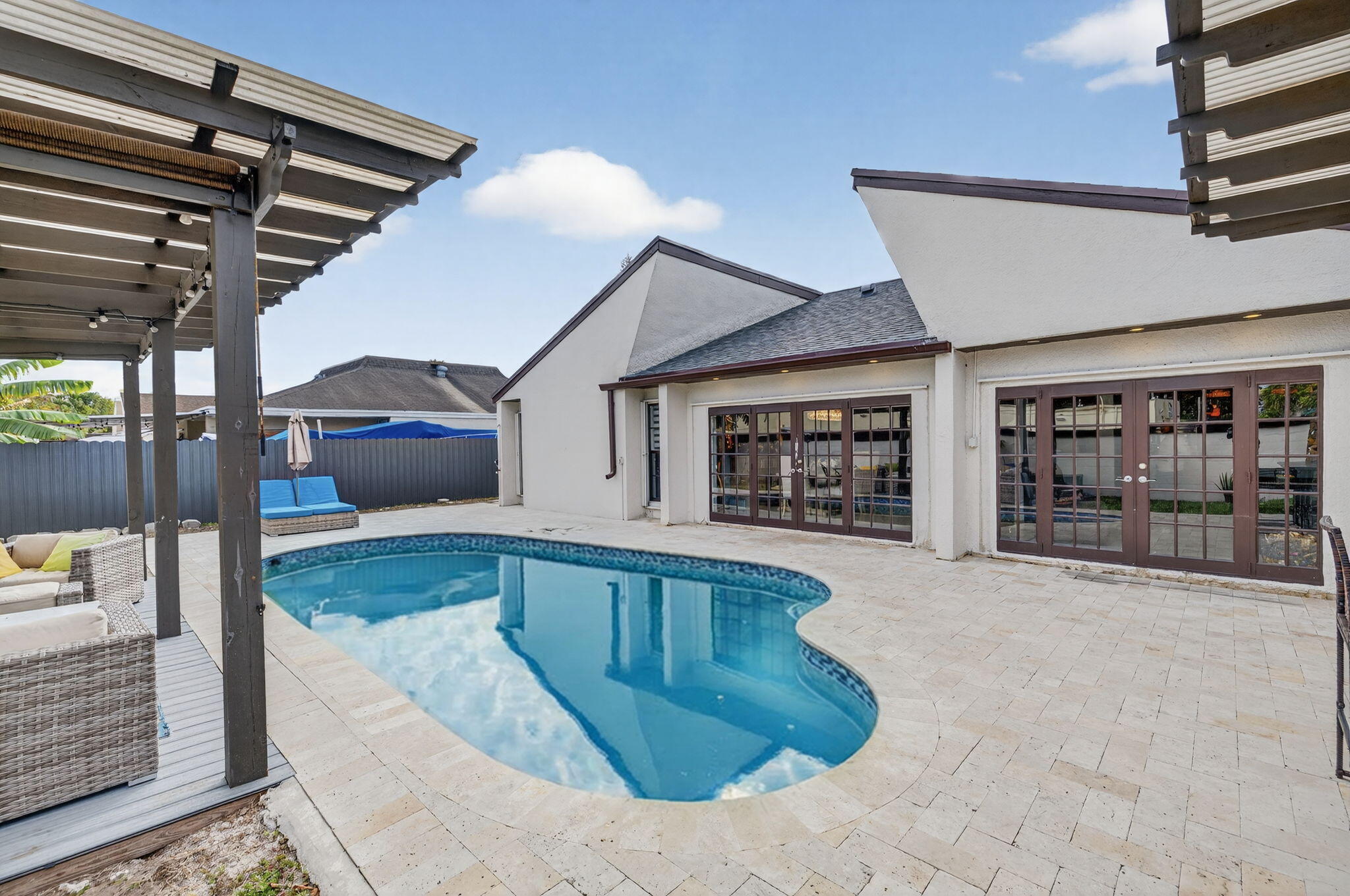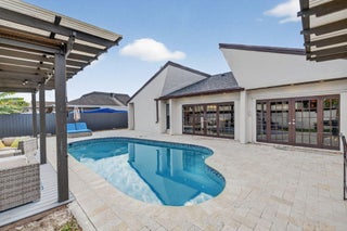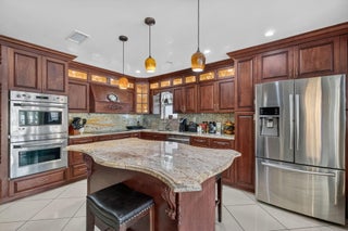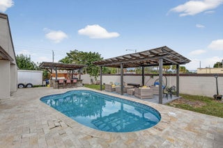A truly one-of-a-kind floor plan for the neighborhood, this elegant home offers open living spaces with soaring volume ceilings and refined crown moldings. The gourmet kitchen is thoughtfully designed with granite countertops, a large island, custom wood cabinetry, double wall ovens, a flat-top stove, stainless steel appliances, wine cooler, and bar--ideal for entertaining. Venetian plaster accents elevate both the kitchen and primary suite, while updated bathrooms provide a spa-like feel. Enjoy added peace of mind with a private security system, along with a resort-style pool and dual pergola patio. This home checks every box for today's luxury buyer.