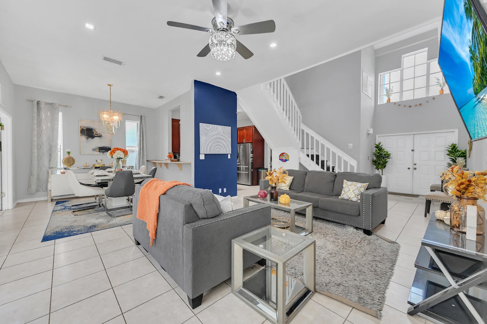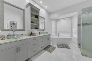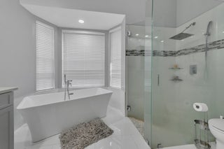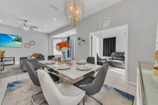 Welcome to this two-story home in the sought-after Foxhall community of West Palm Beach, with 3 bedrooms and 3.1 bathrooms.. The residence makes a dramatic first impression with its two-story foyer and a chic, open-concept main floor defined by polished tile flooring and contemporary gray walls. The spacious living and dining areas are illuminated by recessed lighting and a stylish chandelier, providing the perfect setting for entertaining. The kitchen offers a warm, inviting contrast with its rich, dark wood cabinetry, center island, and granite countertops, seamlessly blending traditional warmth with modern convenience.The luxury continues into the private quarters, where the Master Suite is a spa-like sanctuary that rivals any custom build. It features a spectacular free-standing soaking tub set into a bay window and a pristine, glass-enclosed walk-in shower with modern tile work. The suite is completed by a contemporary vanity with dual vessel sinks, epitomizing high-end design. Furthermore, the first floor includes a versatile bonus room/den with its own private access, and the attached garage hosts a dedicated laundry area with side-by-side washer and dryer units, ensuring exceptional daily convenience. The upstairs bedrooms are generously sized and feature wood-look laminate flooring, offering comfortable and flexible spaces for family or guests. Step outside to a large, private backyard that is fully fenced, providing a fantastic blank canvas for a future pool, custom patio, or play area. This home expertly combines a striking, fully modernized interior with the desirable freedom of a private outdoor space, all situated in the highly coveted Foxhall communitya rare and exceptional opportunity in West Palm Beach.