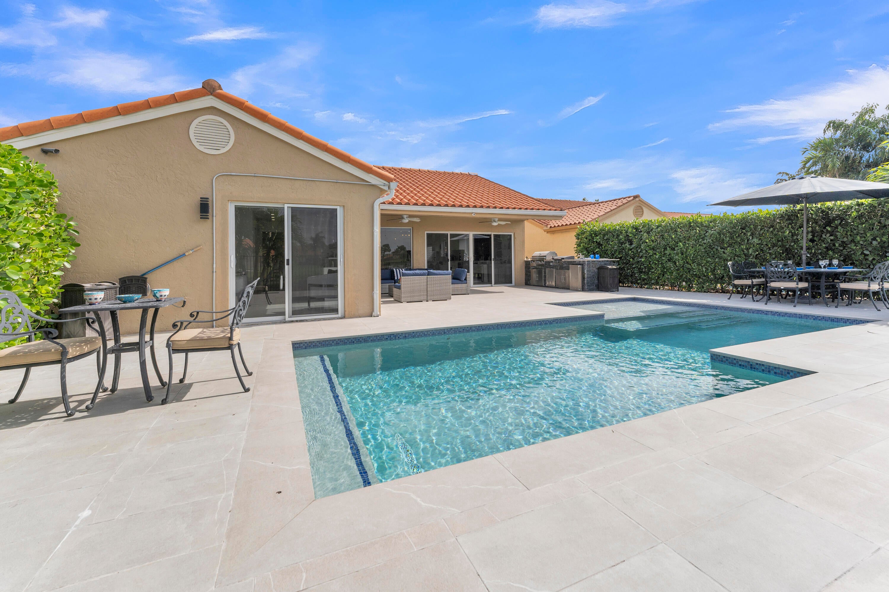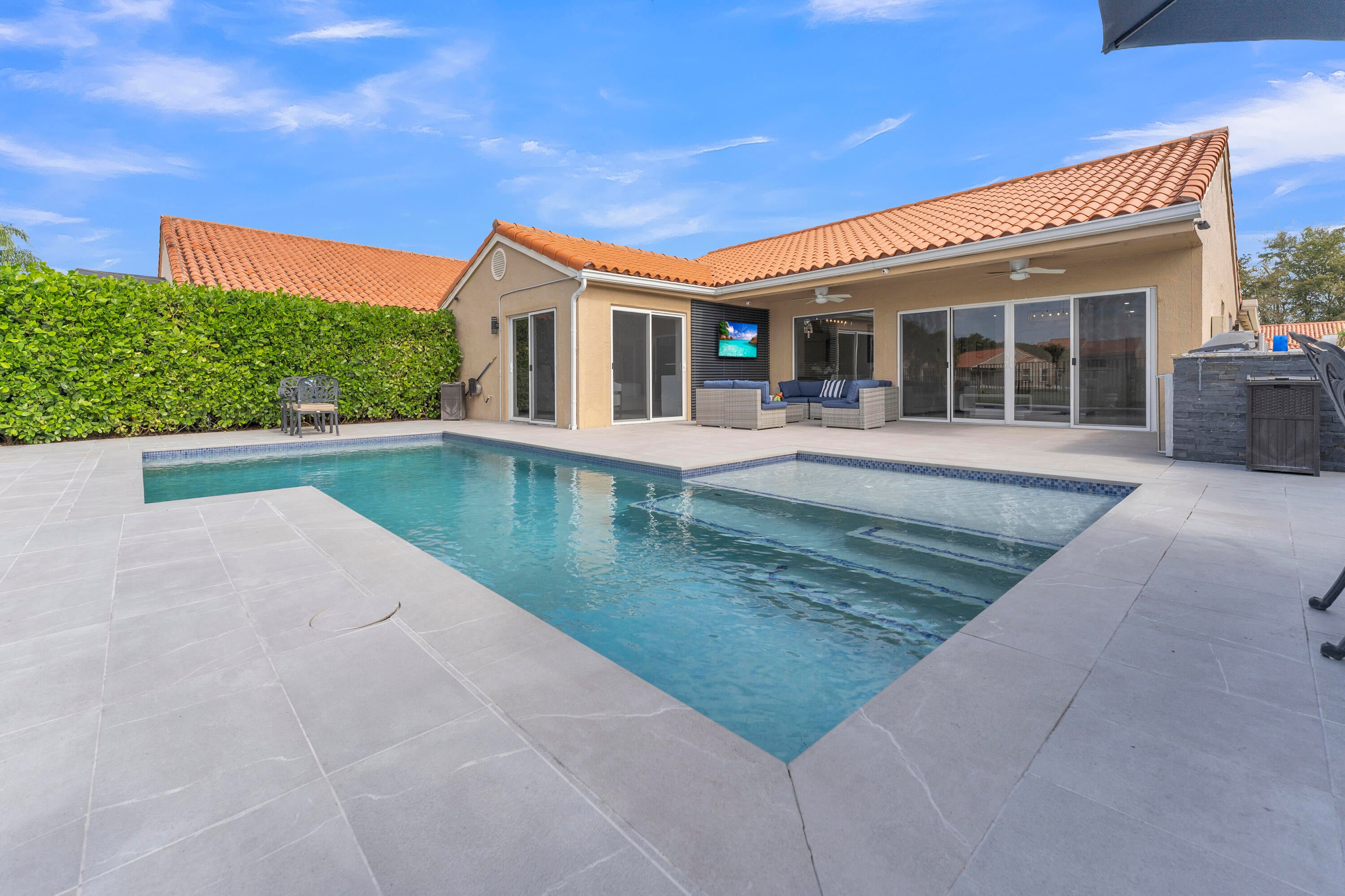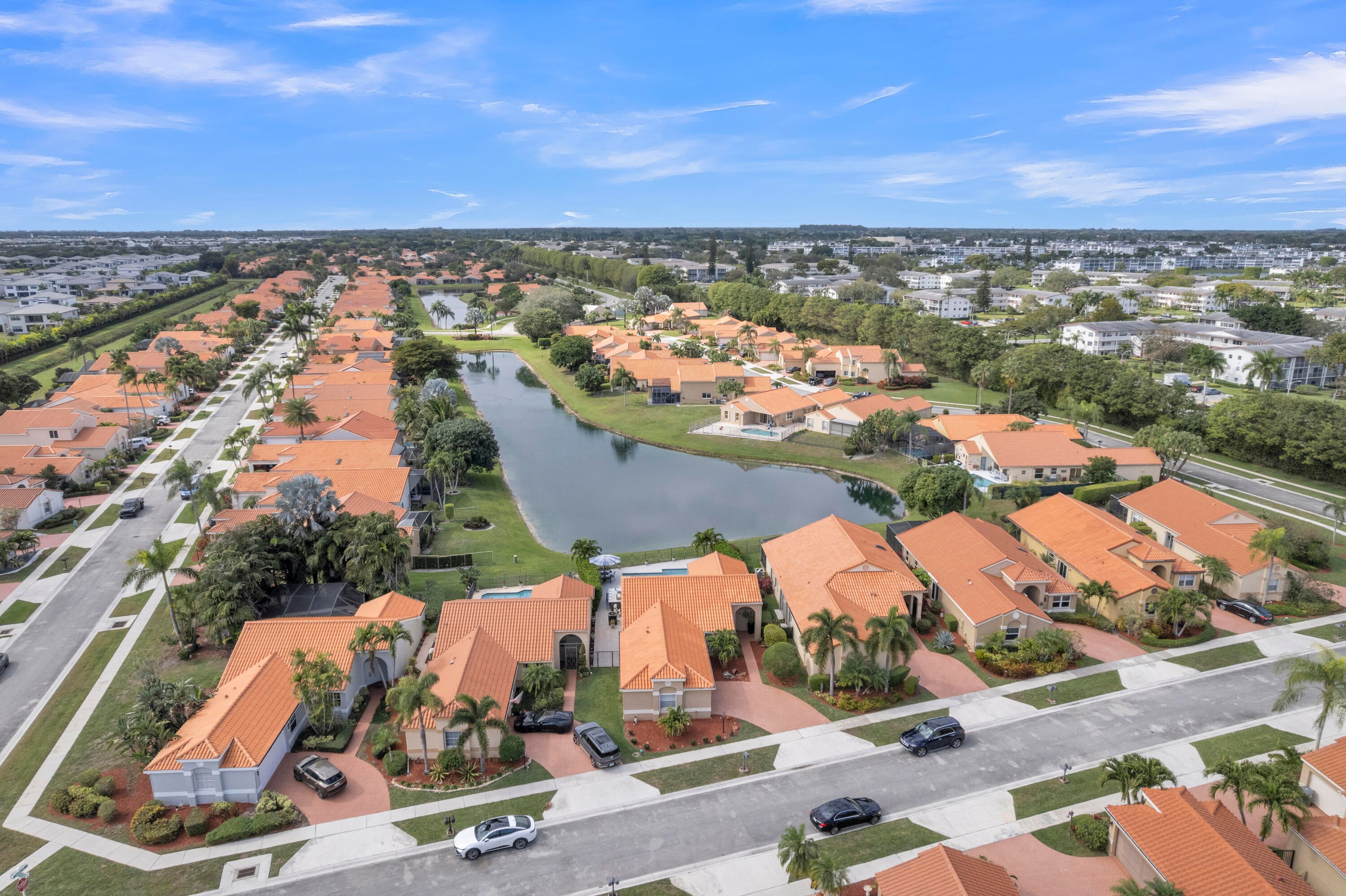 Welcome to this impeccably remodeled home, where every detail has been thoughtfully designed to deliver a sleek, modern lifestyle. This residence has undergone a full renovation and features a true open-concept layout that immediately showcases the home's refined finishes and attention to detail.Marble flooring flows throughout the home, complemented by custom-designed closets in every bedroom and custom entertainment units in all bedrooms and the living room. LED lighting enhances the modern ambiance, while smart outlets are installed throughout for added convenience.The chef's kitchen boasts quartz countertops with a waterfall edge, abundant storage, a smart kitchen faucet, and brand-new high-end stainless-steel appliances. The third bedroom is currently utilized as an officeand includes a Murphy bed for versatility. The primary bathroom features a Wi-Fi-enabled ventilation system, and modern blinds complete the interior finishes. Enjoy peace of mind with hurricane-impact windows and sliding doors. Step outside to a stunning zero-entry pool and extended tiled patio designed with heat-resistant materials, all overlooking a serene lake. This backyard is a true entertainer's retreatperfect for gatherings with family and friends. Lower HOA. Two community pools ( Heated), a gym, and a tennis court. Close to many great restaurants, Town Center Mall, and Uptown Boca