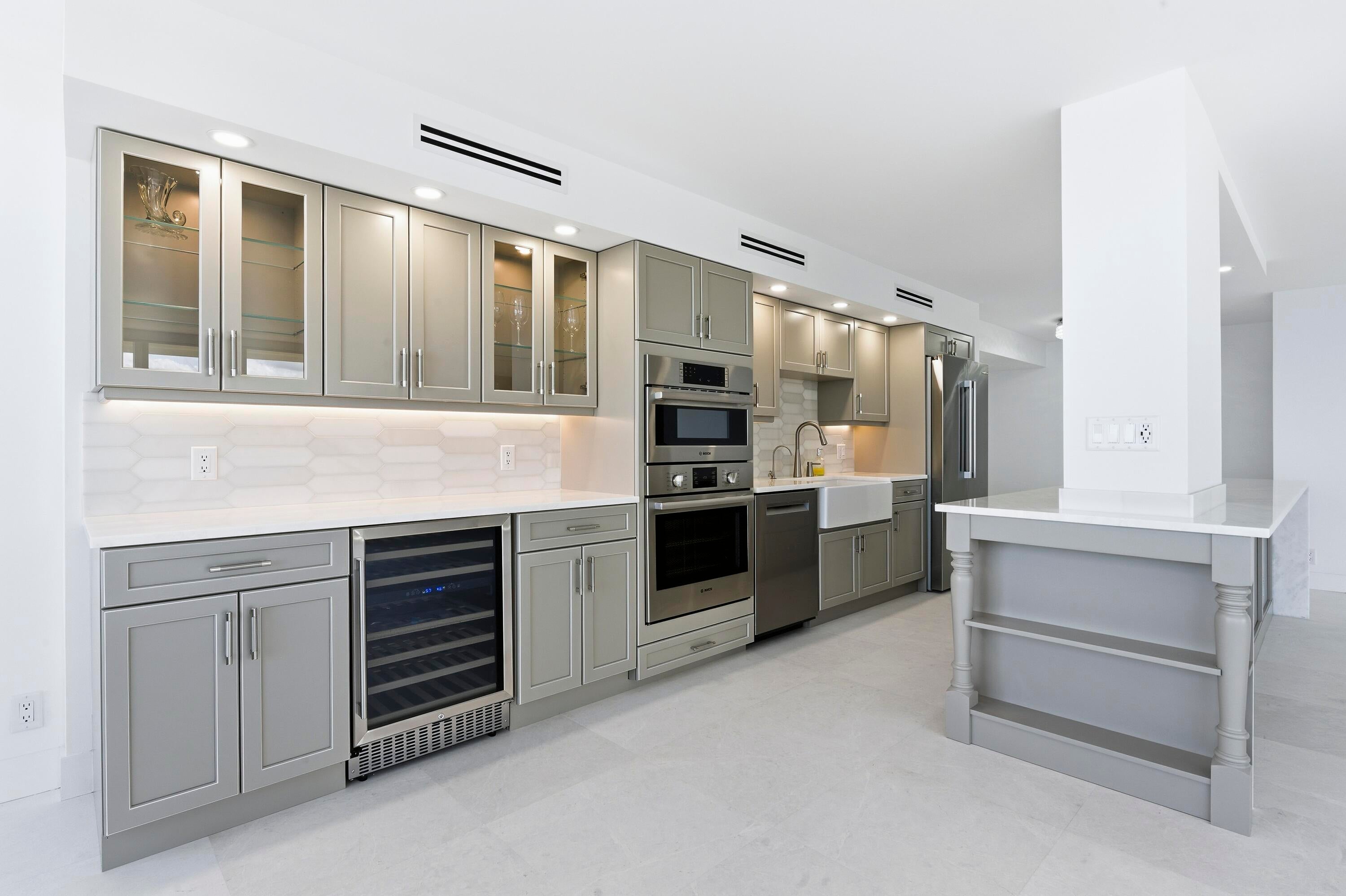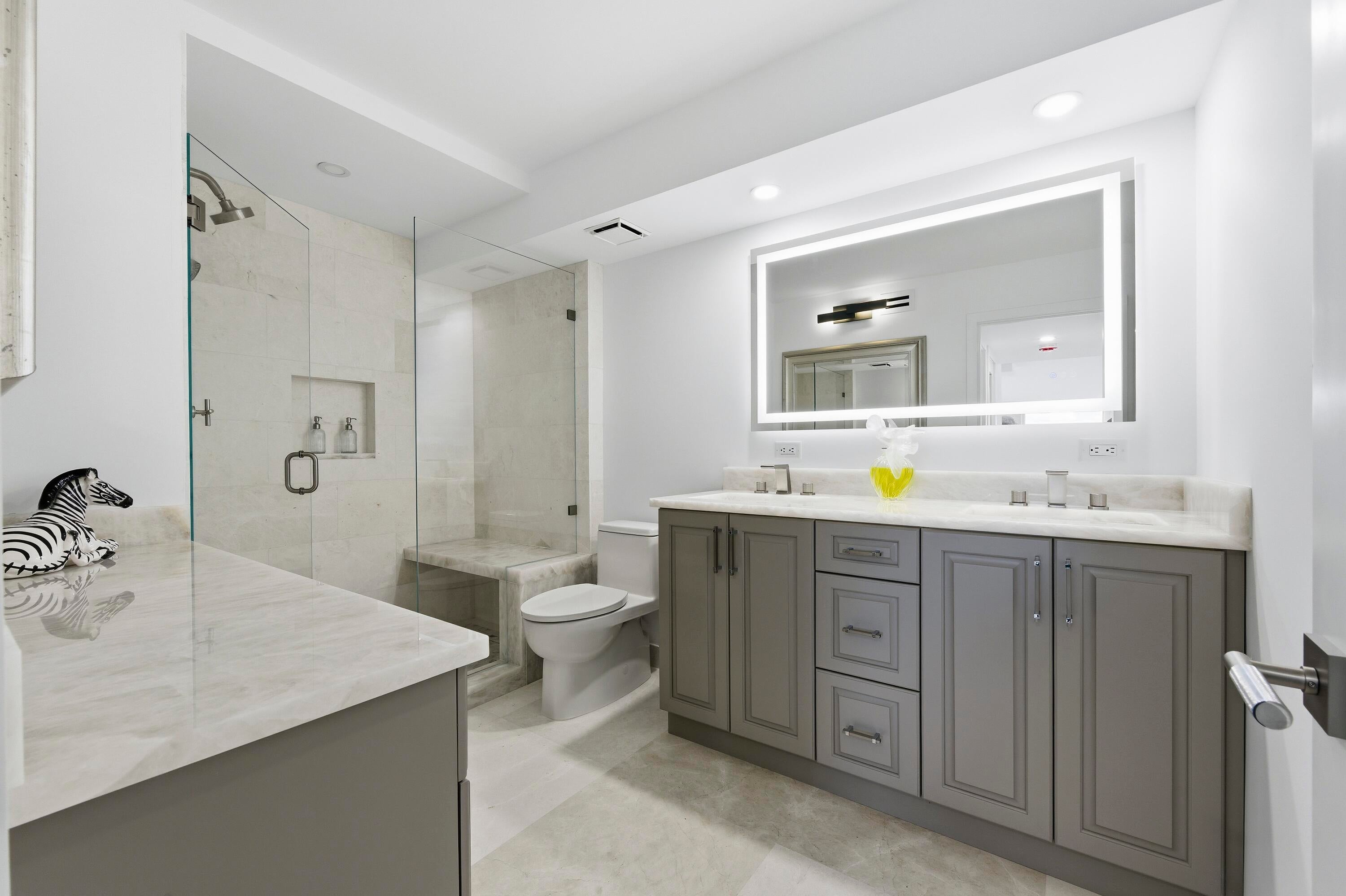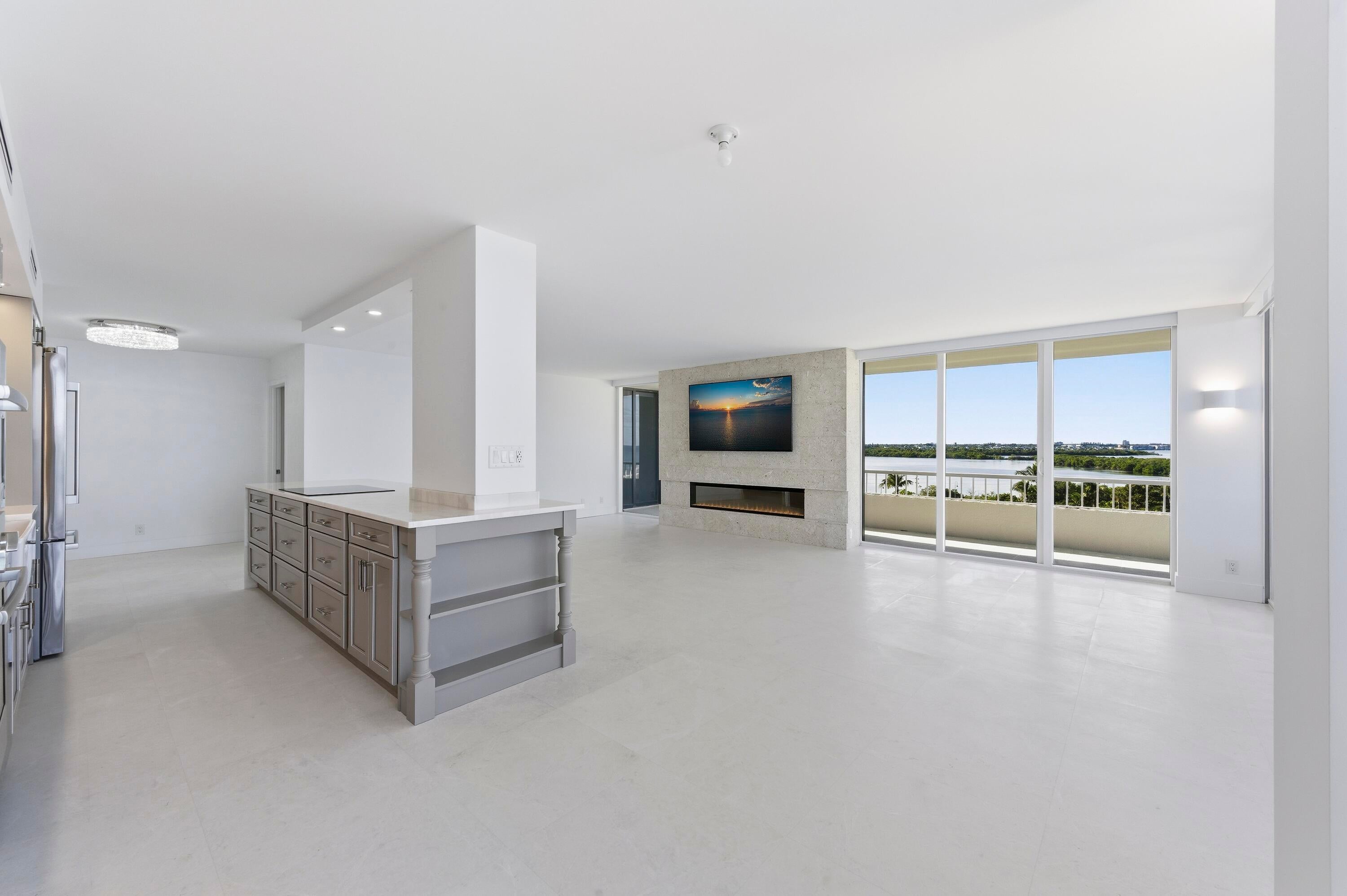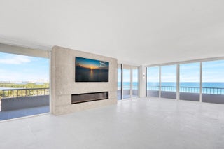 Experience luxury living that will exceed your expectations! Panoramic oceanfront living in one of the most desired buildings and stacks at Water Glades! Experience a lavishly designed & decorated 7th floor residence where sunrise and sunset are viewed from expansive floor-to-ceiling high-impact glass. This 2-bedroom, 2-bathroom condo offers the best of both worlds, with breathtaking oceanfront and intracoastal views. The total custom-designed and completely renovated apartment includes only the finest quality materials, built by one of the premier builders in the area. The residence, completed with Level 5 finishes throughout, features honed snow-white marble floors, a striking natural coral stone fireplace, and walls of floor-to-ceiling impact glass and sliders opening to awrap-around balcony with direct ocean and intercoastal views. The living space is anchored by a rare natural coral stone fireplace, creating an inviting focal point that is almost unheard of in oceanfront condos. The kitchen is highlighted by White Mystery marble countertops, a Carrera marble backsplash, and custom glazed cabinetry, complemented by a full suite of Bosch appliances. The primary suite offers a custom closet system and a spa-inspired bathroom with Crystallo countertops, double sinks, custom cabinetry, and a white glass stone tile shower. The guest bathroom mirrors the same elevated design with Crystallo stone in the shower, counters, double sinks, and custom cabinetry. Additional upgrades include electric blinds throughout, a full-size Electrolux washer/dryer, 3 Sony televisions already in place, and custom-made barstools. Water Glades is located on the preferred north end of Singer Island, directly on the ocean, spanning over 11+ acres and 1,025 feet of private beach, and beautifully manicured grounds resting beside MacArthur State Park, offering privacy and protected natural beauty. Minutes from Palm Beach Gardens, PGA Boulevard, Worth Avenue, and Palm Beach International Airport, it delivers elevated privacy, polished ease, and effortless access to everything that matters. Residents enjoy two heated pools, private beach access, an oceanfront clubhouse with a social room, fitness center, library, tennis and pickleball courts, on-site management, and a 24-hour manned guard gate in a secure oceanfront community.