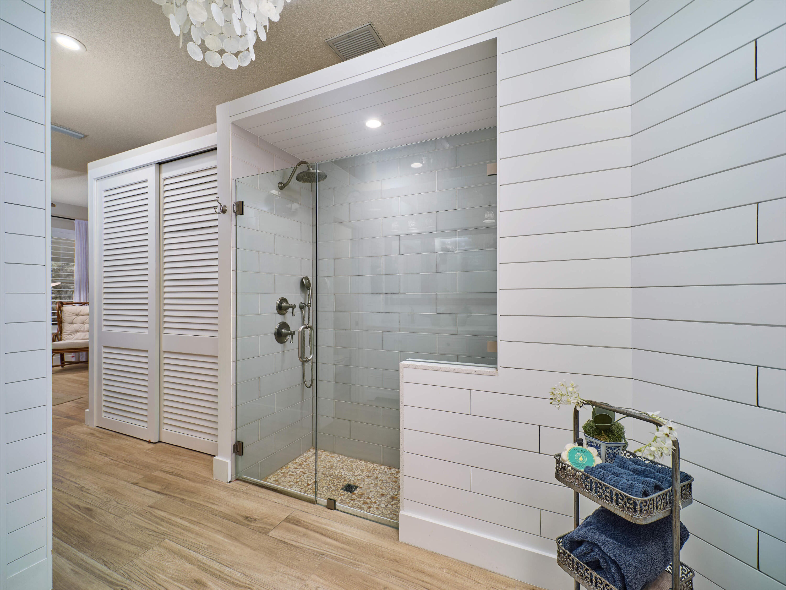 Beautifully remodeled coastal contemporary home featuring volume ceilings and 47'' porcelain plank tile flooring throughout. The bright, airy kitchen is thoughtfully designed with custom shaker cabinetry built with organization in mind, quartz countertops, tile backsplash, and seamless flow into the living and dining spaces, perfect for entertaining. Updated bathrooms showcase modern finishes with quartz countertops, including a stunning primary bath with dual vanities, freestanding soaking tub, private water closet, skylight, and custom expanded shower with seamless glass door, rain shower head, and separate handheld nozzle. The open-concept layout flows effortlessly from room to room, with half walls in the living area providing thoughtful separation between the living room and den whilmaintaining unobstructed preserve views. Enjoy peaceful, private preserve scenery from the main living spaces, kitchen, and primary suite. Additional highlights include plantation shutters in the living areas and primary bedroom, custom shades in the guest rooms, an oversized covered and screened patio, fully fenced backyard, and accordion shutters throughout. Located within the gated community of The Preserve in the heart of Hobe Sound, residents enjoy a heated community pool and spa, tennis courts, and shuffleboard, offering both convenience and resort-style amenities. Notable Upgrades & Improvements: Kitchen, Primary Bath, Flooring & Plumbing - 2019, Kitchen and Laundry Appliances - 2019, Guest Bathroom & Plumbing Remodel - 2025, Roof - December 2021, Gutters - 2022, Hot Water Heater - December 2021, A/C - September 2020, Plantation Shutters & Blinds - August 2020, Louver Bi-Fold Closet Doors - January 2021, New Garage Door Opener - June 2025, and Accordion Shutters throughout.