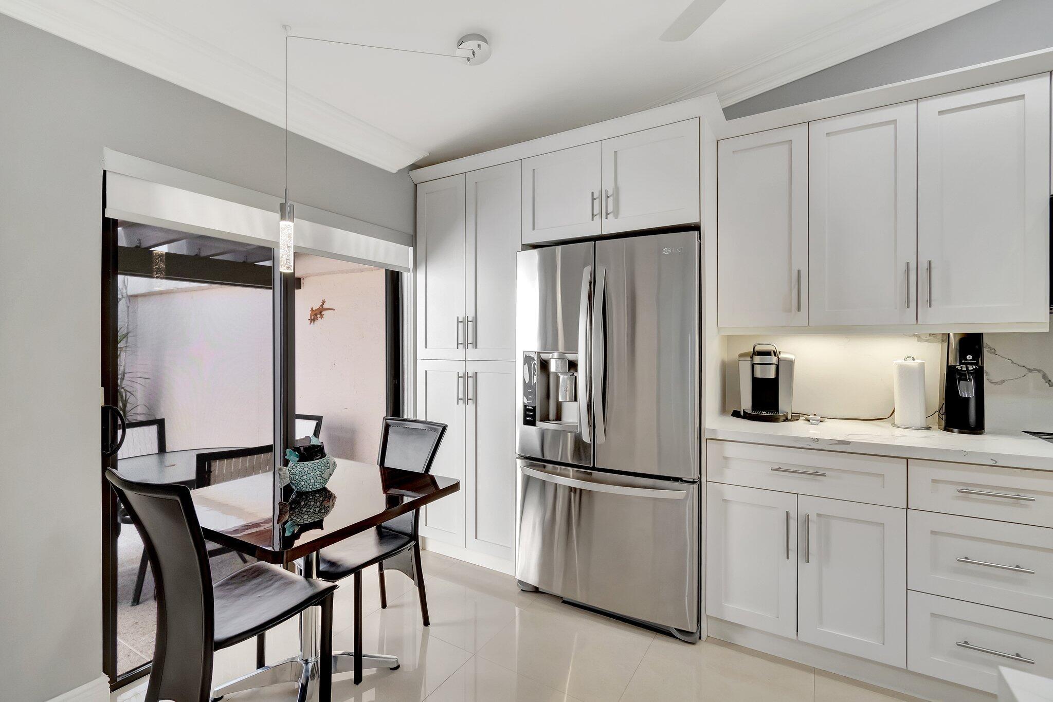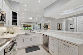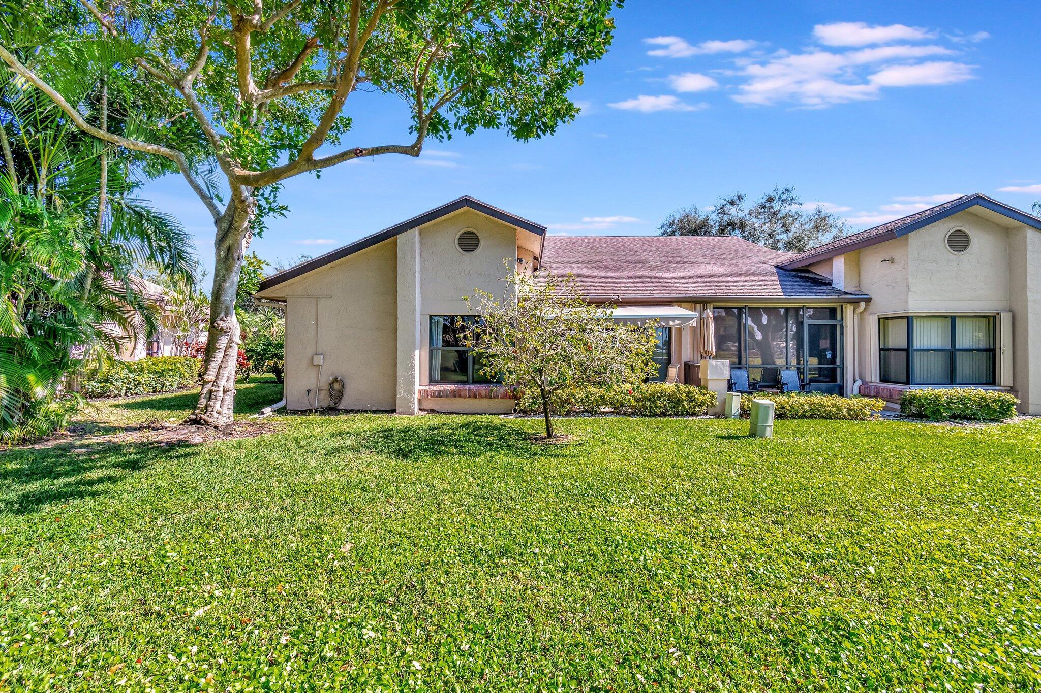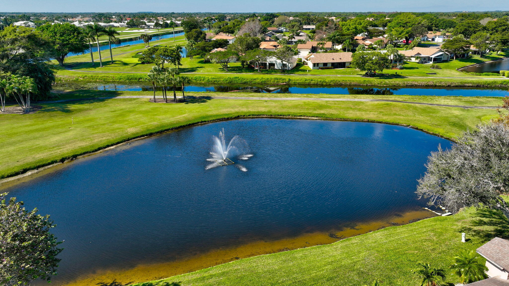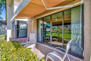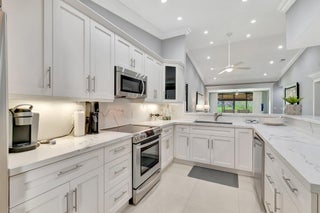 Country Club living without equity or club membership fees. Unbelievable value! Professionally designed stunning corner villa with 2 bedroom plus den with 2 1/2 baths and 1 1/2 car garage. Open concept living space, laundry room, gourmet kitchen with top of the line stainless steel appliances, quartz counter tops and backsplash, porcelain floor tile and impact windows. The master bedroom suite features a large walk-in closet, double vanity, walk-in shower and jetted tub. The spacious private courtyard or patio are perfect spots for enjoying your morning coffee or afternoon cocktails. Tranquil lake and golf views from the back of this villa. Great location! Newly renovated Clubhouse. 18 hole executive golf course and 19th Hole Cafe. Close to shops, restaurants, major highways, and the beach.