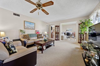 Light & Bright condo in Pine Ridge III! Property offers 2 bedrooms, 1 bathroom plus complete hurricane windows. Carpet flooring throughout the living areas & 2nd bedroom. Kitchen offers plenty of storage, a newer microwave & fridge plus in unit washer & dryer. Guest bedroom w/ pocket doors perfect for an office & walk-in closet. Primary suite with laminate flooring, walk-in closet and en-suite w/separate vanity area & combo/tub shower. Front screened in patio w/ additional storage closet overlooking the grass courtyard. HVAC 2020 & Roofs 2024. Pine Ridge III has a monthly fee of $514 which includes, exterior building insurance, cable/internet, lawn maintenance, recreational facilities & water/sewer.